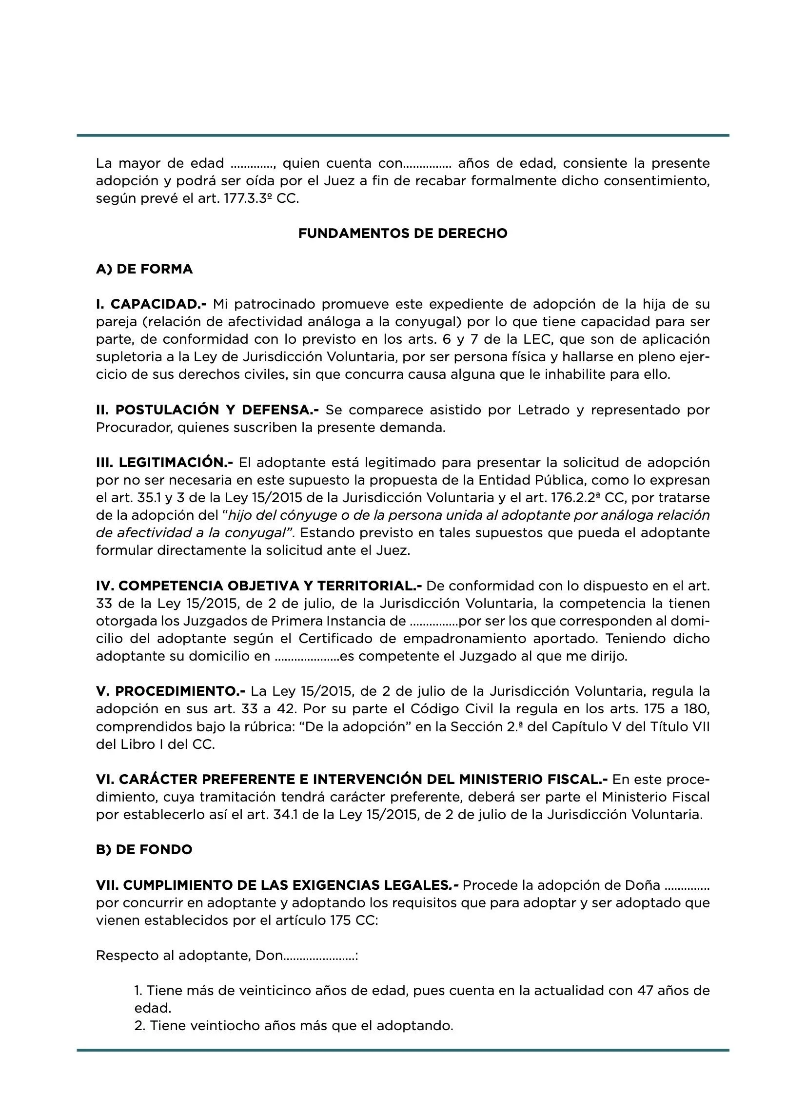 Procedurally, the competent authority is the Court of First Instance corresponding to the judicial district where the adoptive parent resides (Article 33 of the Law of Judicial Proceedings, LJV).