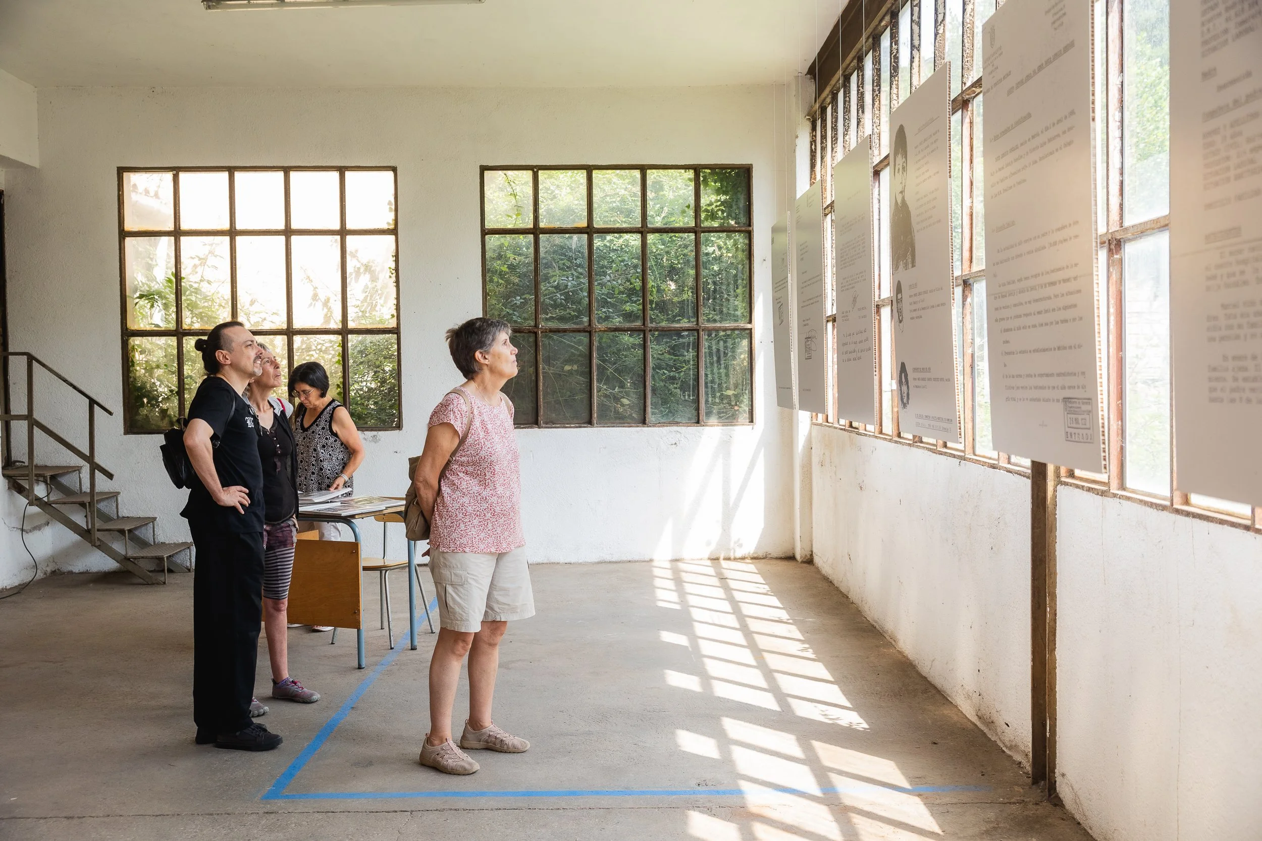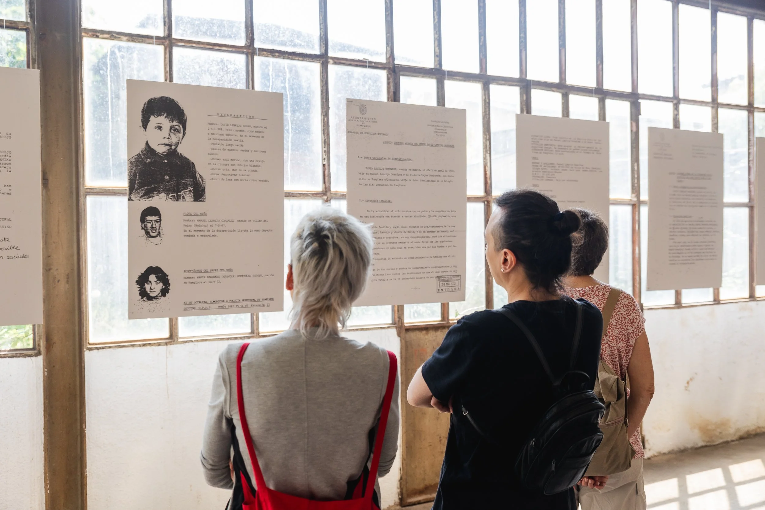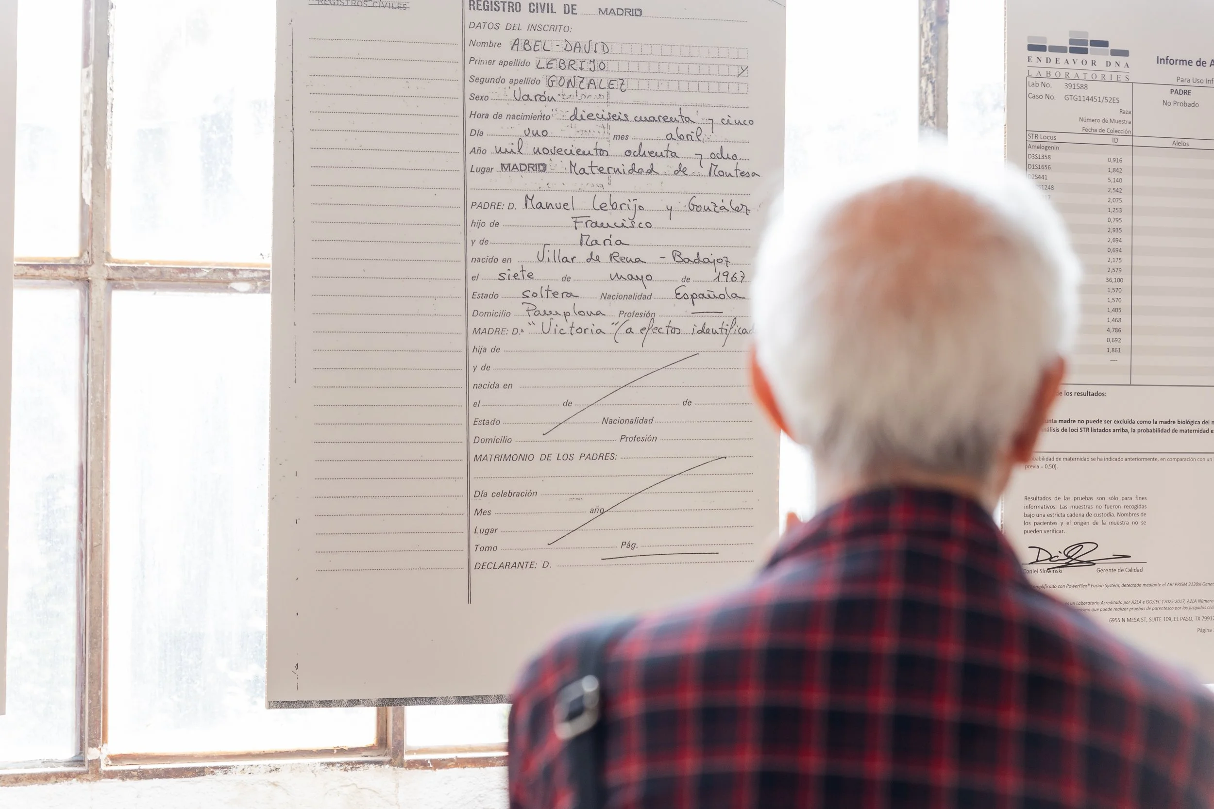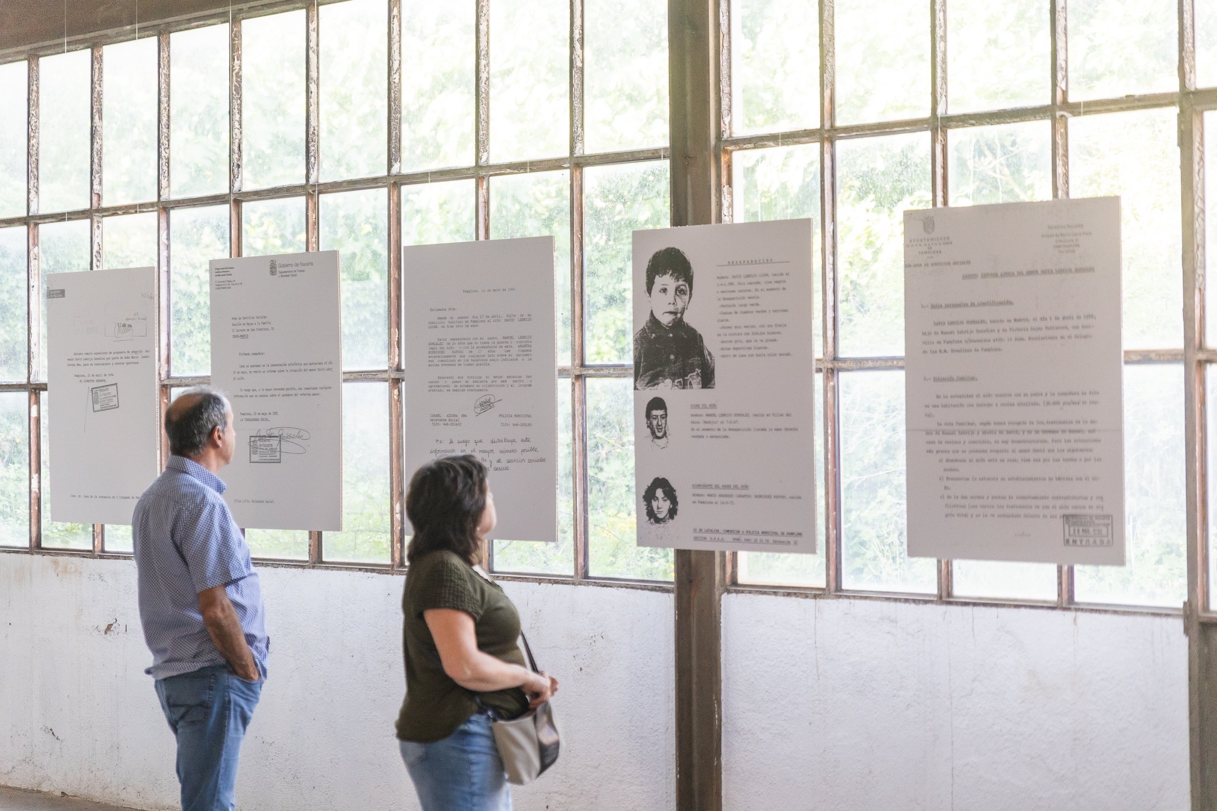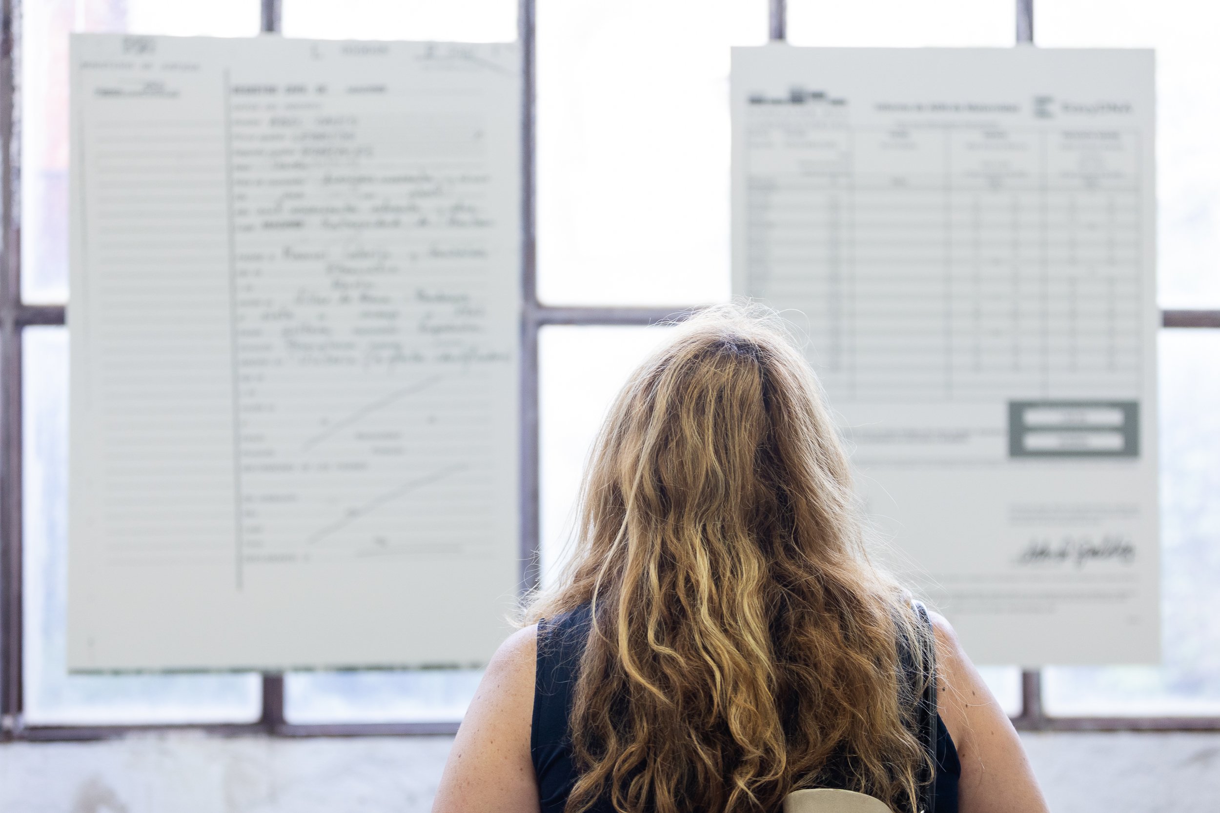 Visitors reading Azcona’s adoption file, produced in large format, at an exhibition. / Visitantes leyendo el expdiente de adopción de Azcona producido a gran tamaño en una exposición.