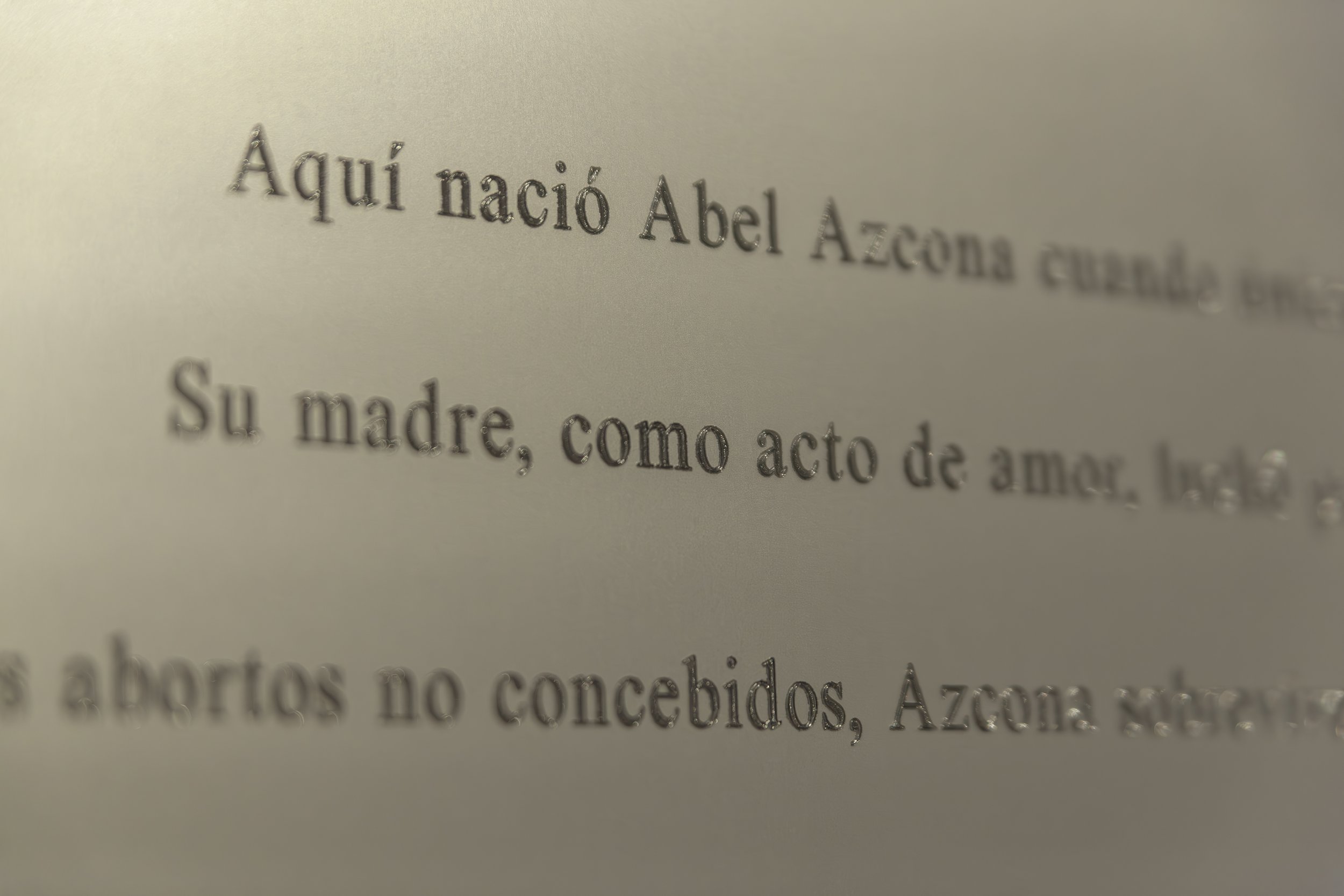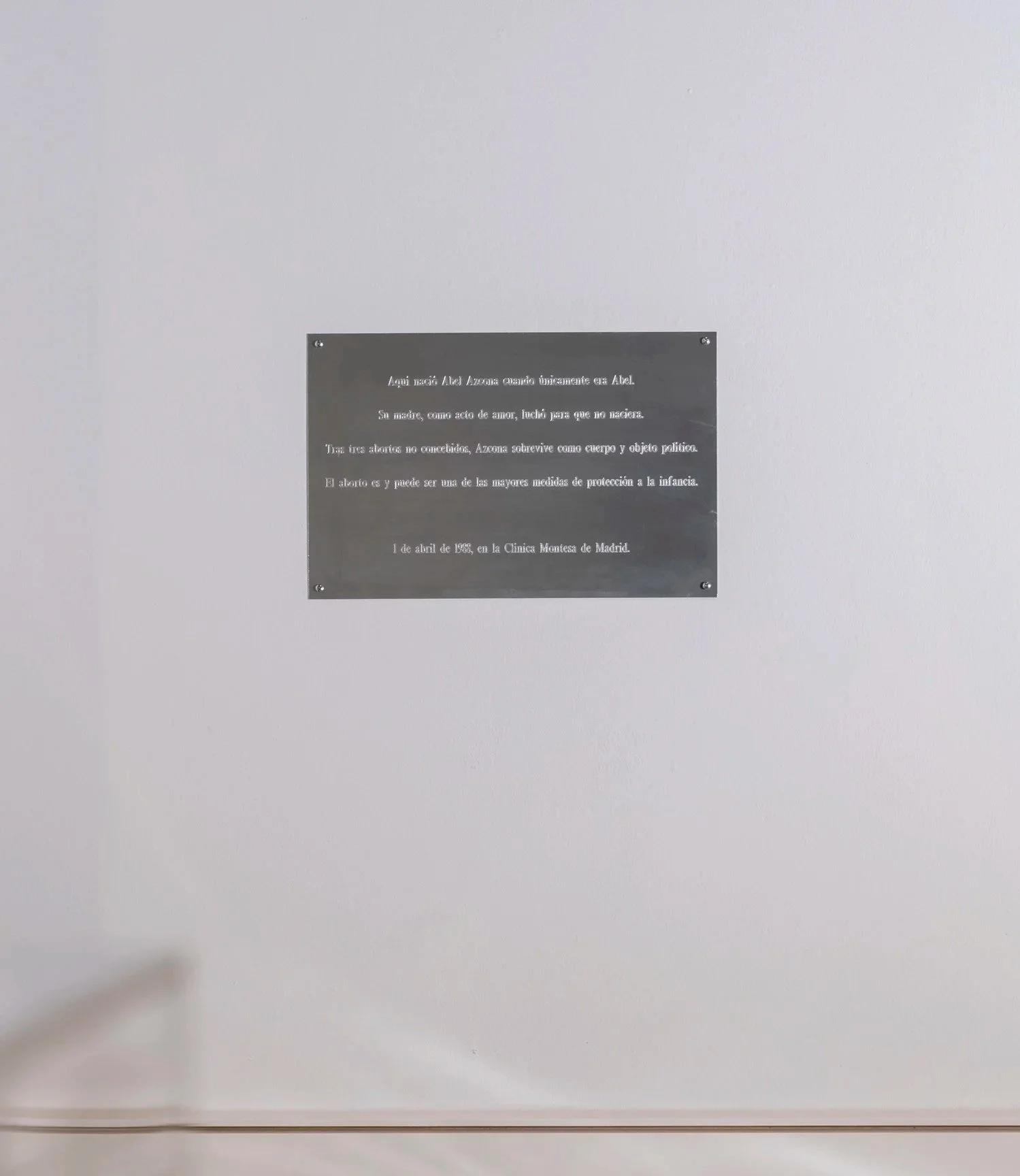 La placa de la Clínica Montesa was a performance in which I placed on the facade of the building a plaque that read: Aquí nació Abel Azcona cuando únicamente era Abel. Su madre, como acto de amor, luchó para que no naciera. Tras tres abortos no concedidos, Azcona sobrevive como cuerpo y objeto político. El aborto es y puede ser una de las mayores medidas de protección a la infancia. [Here was born Abel Azcona when he was only Abel. His mother, as an act of love, fought for him not to be born. After three denied abortions, Azcona survives as a body and political object. Abortion is and can be one of the greatest measures for protecting childhood. The plaque was denounced by anti-abortion and ultra-Catholic organizations and was withdrawn. Since then, it has been exhibited as a work in various exhibition spaces.”