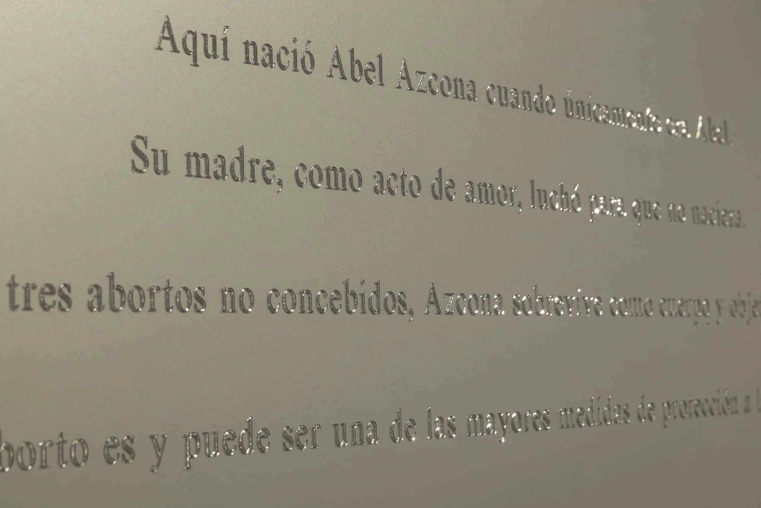 Performative and objectual work activated in December 2020. The artist Abel Azcona installed at the Montesa Clinic in Madrid, the place where he was born, a plaque recalling the right not to have been born and defending abortion “as one of the strongest measures for the protection of childhood”. In his case, he claims that he should never have been born, having come into the world in a context of drug use, prostitution, and extreme precarity. This piece generated intense controversy, was denounced, and the plaque was removed and vandalized by pro-life and anti-abortion groups such as Derecho a Vivir.