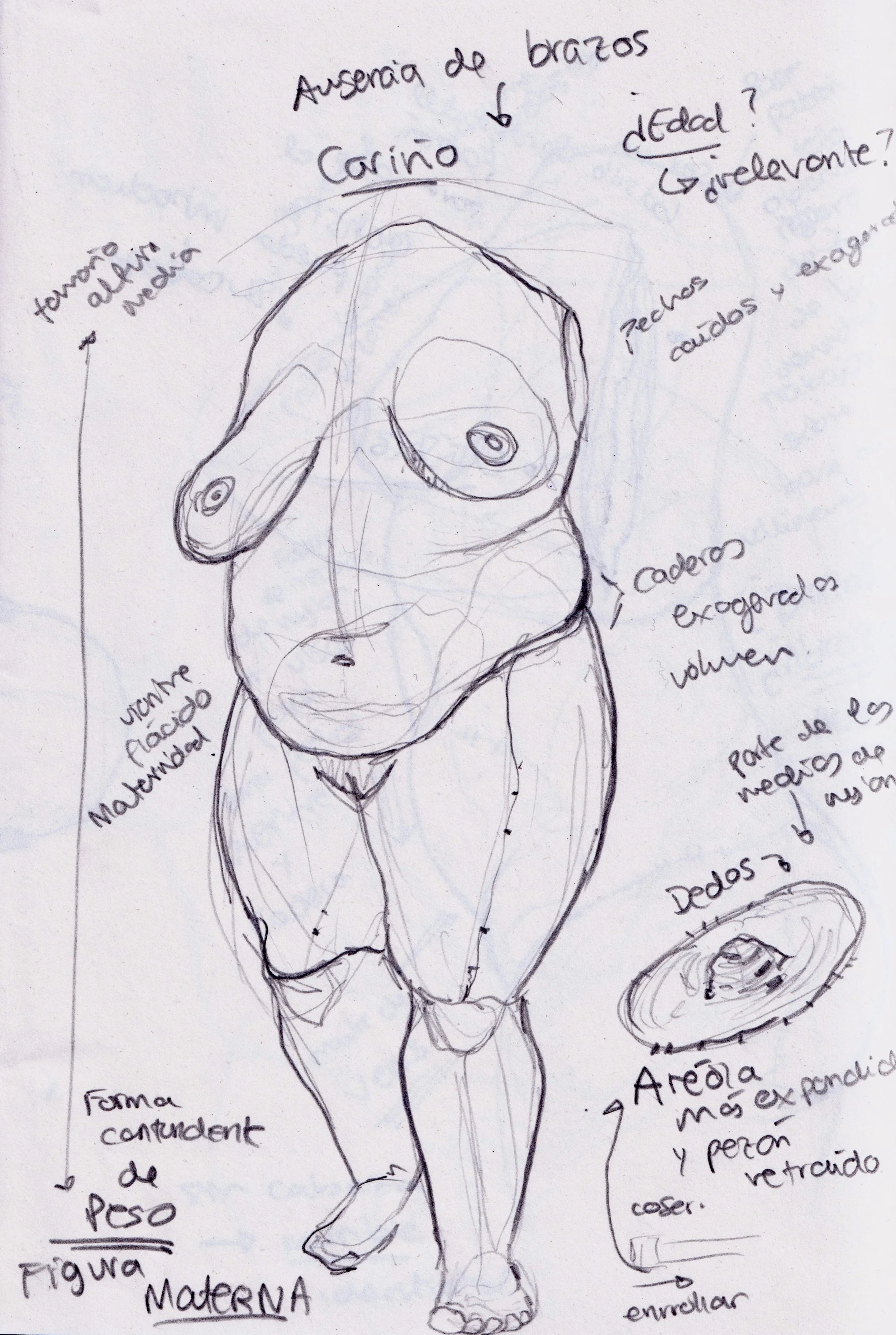 La madre construida tiene rasgos físicos que aluden a lo maternal a través de sus pechos, su vientre hinchado y sus caderas. Sin embargo, la ausencia de rostro de la madre refleja el abandono y la inexistencia del ser. Al carecer de rasgo distintivos(indicadores de identidad individual), a excepción de las orejas que podrían escuchar el llanto del hijo, los demás sentidos(omitidos)hacen hincapié en la ”desmaternalización” o el propio abandono consciente y voluntario del hijo.