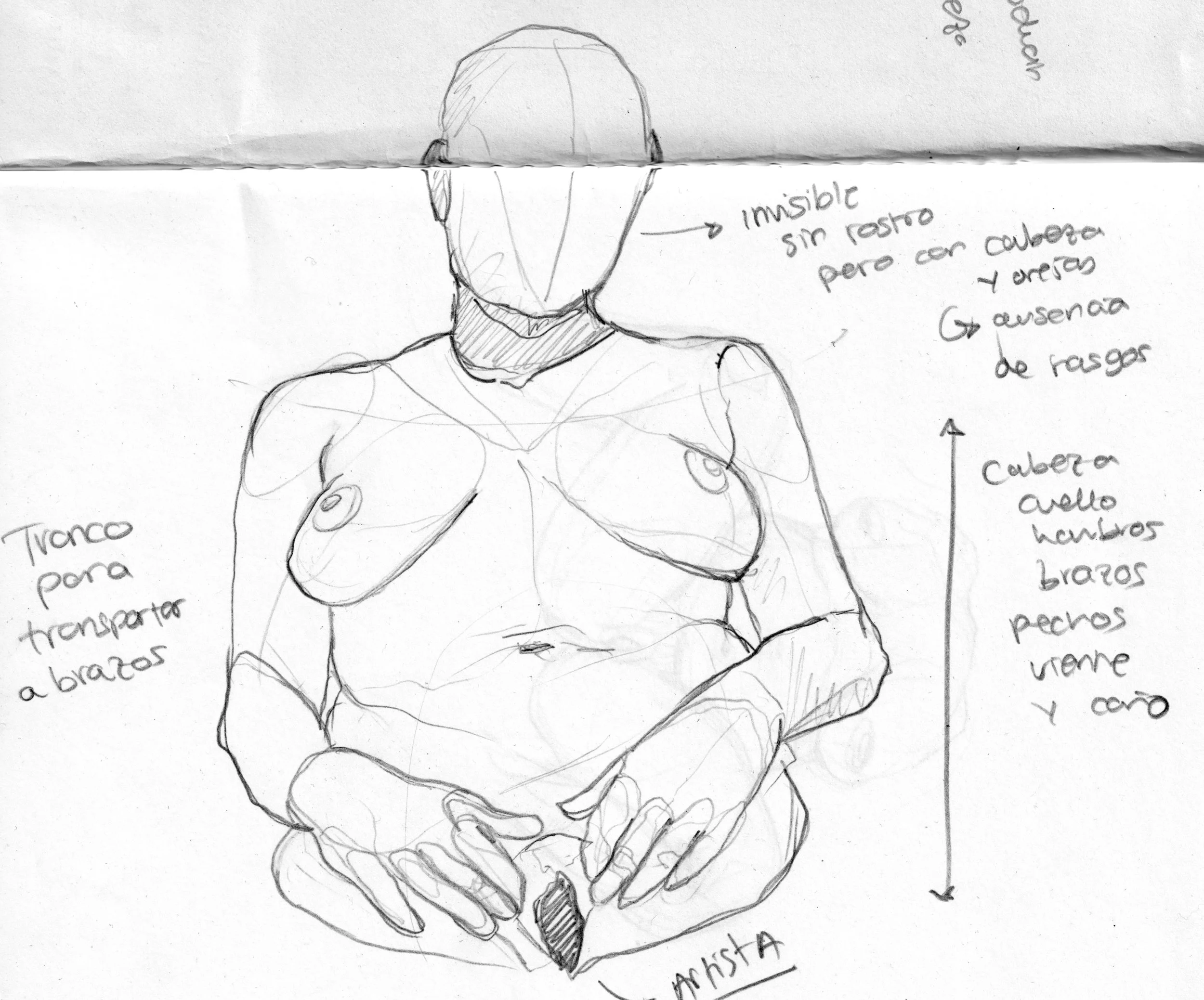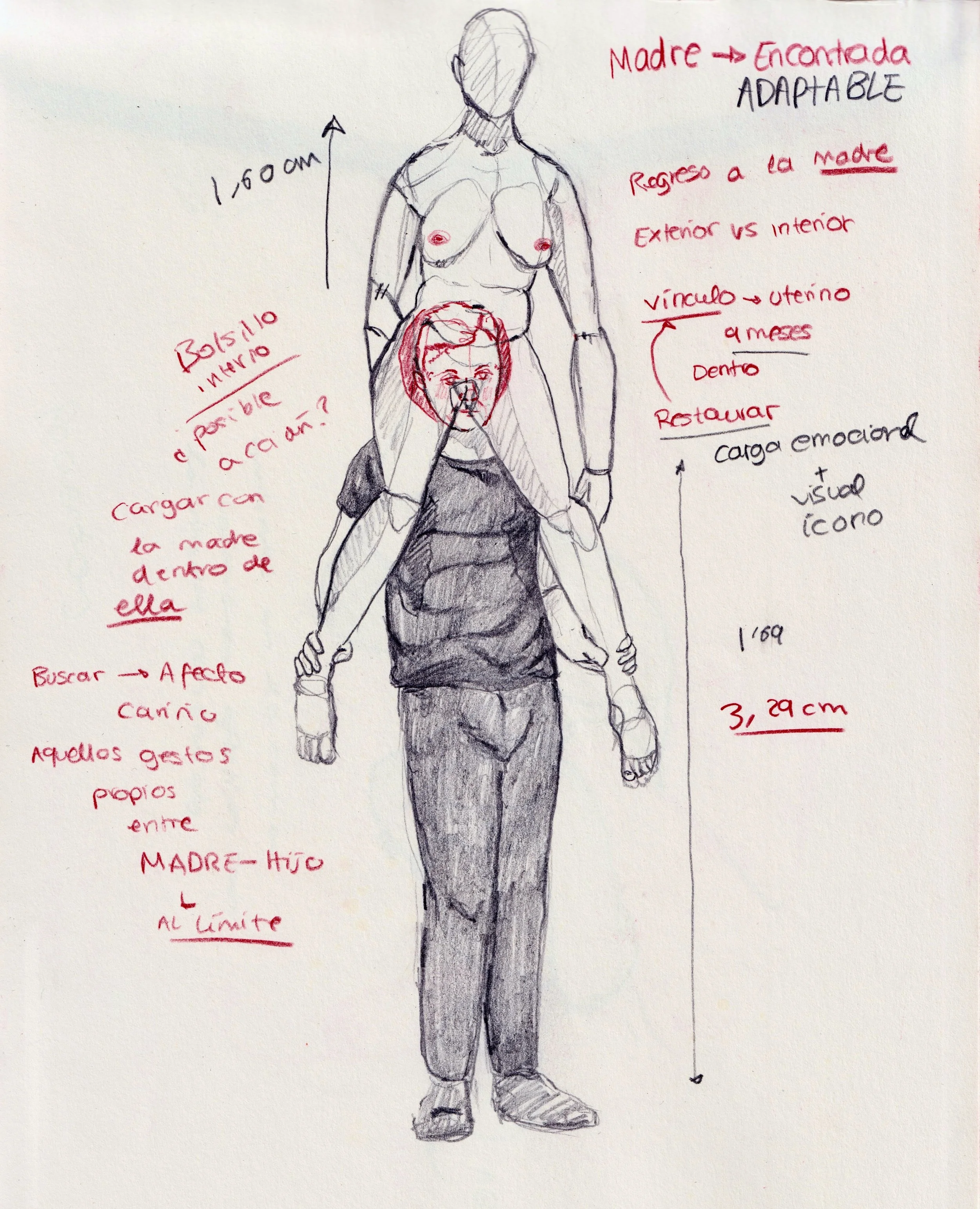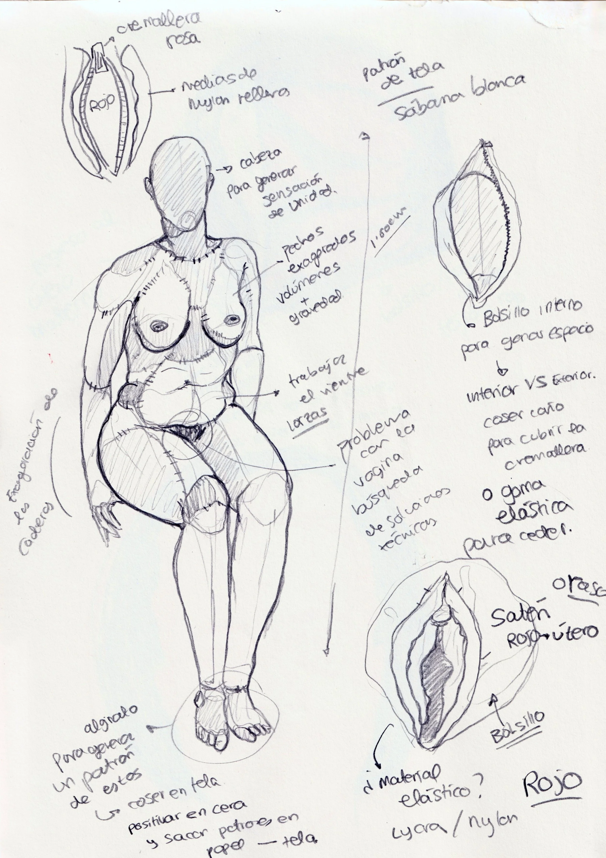 Replacing or substituting a mother is not entirely possible. Adoption or other systems of substitution never work one hundred percent effectively. There are always holes in the clay through which the water seeps. All of my work has consisted of searching for a mother who abandoned me. Many of my pieces are a substitution for that mother. This work is the most evident replacement. I decide to commission a Valencian sculptor specializing in fabric and soft sculpture to create a tailor-made mother. First, we create a series of sketches based on my needs: a soft mother to hug, similar in size to me, where I could at least partially enter if I wanted to return to her interior, a mother who could sit beside me, hang, or stand upright, a mother who would accompany me, be soft and comforting. A soft mother who will not abandon me, who could sleep with me in bed like no one ever did when I was a child, who could be embraced in times of pain or loneliness, or who could replace or make me forget the constant feeling of abandonment that haunts me every day of my life.”