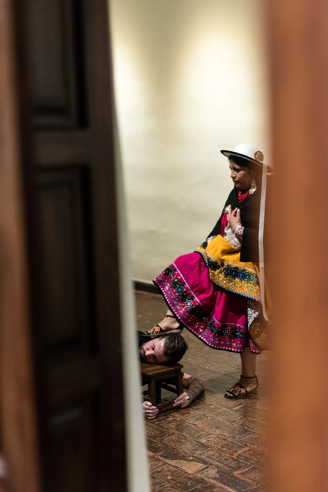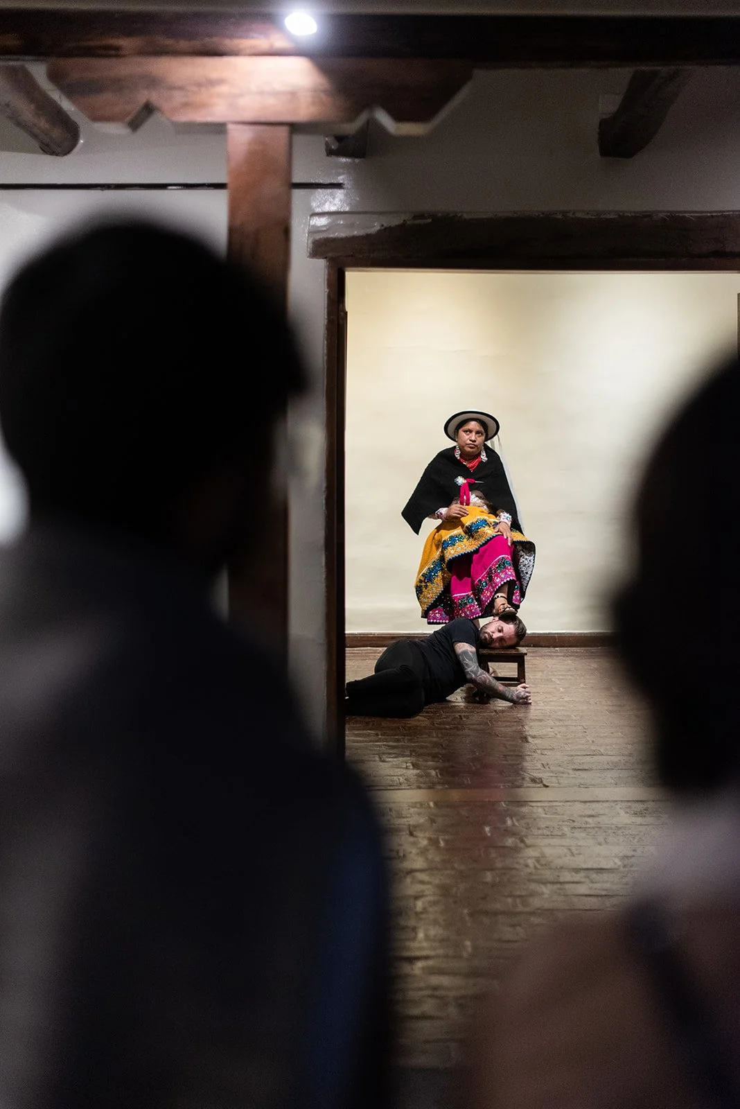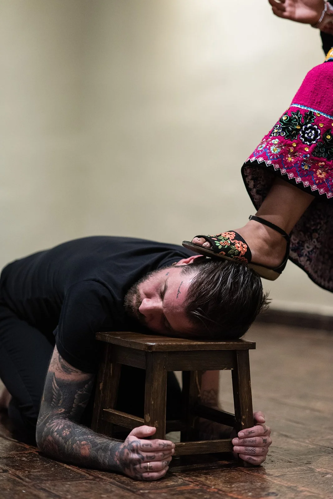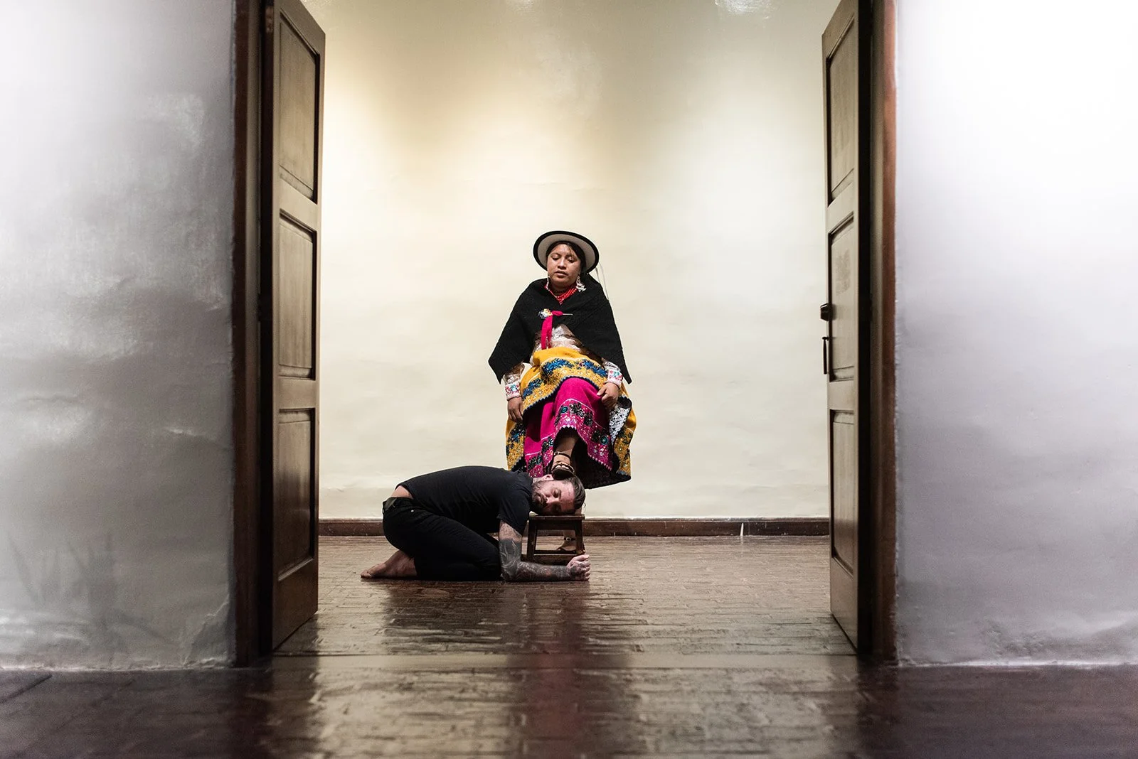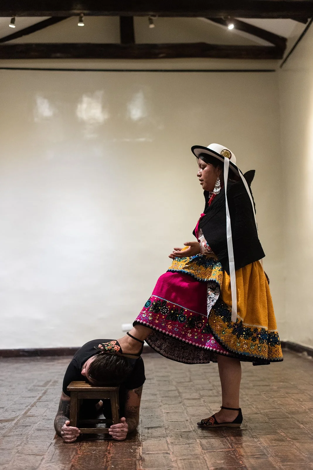 Despite the shades of gray in Azcona's life experience and representation, as he is pursued in his own country with lawsuits, legal proceedings, and complaints, the artist narrates the performance solely in terms of the physical, presenting himself at first glance as a white, cisgender man with the power to shoulder the burden of hatred, memory, and colonial genocide. However, Verónica Solano, through her bodily work in this space of power, feels empathy and affection for the artist. She expresses a song of forgiveness to Azcona, placing her head on his behalf in the name of Spain. The sweet melodies of the Quechua songs cradle the current communication limitations between indigenous nationalities and the colonizing country, addressing the prejudices held on both sides.
