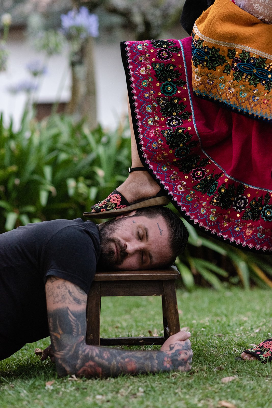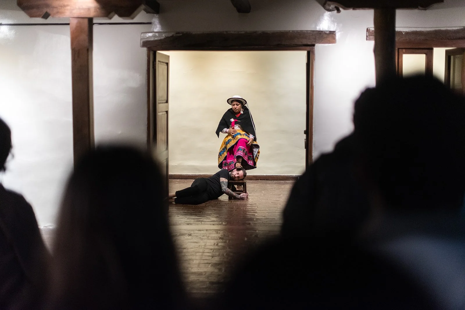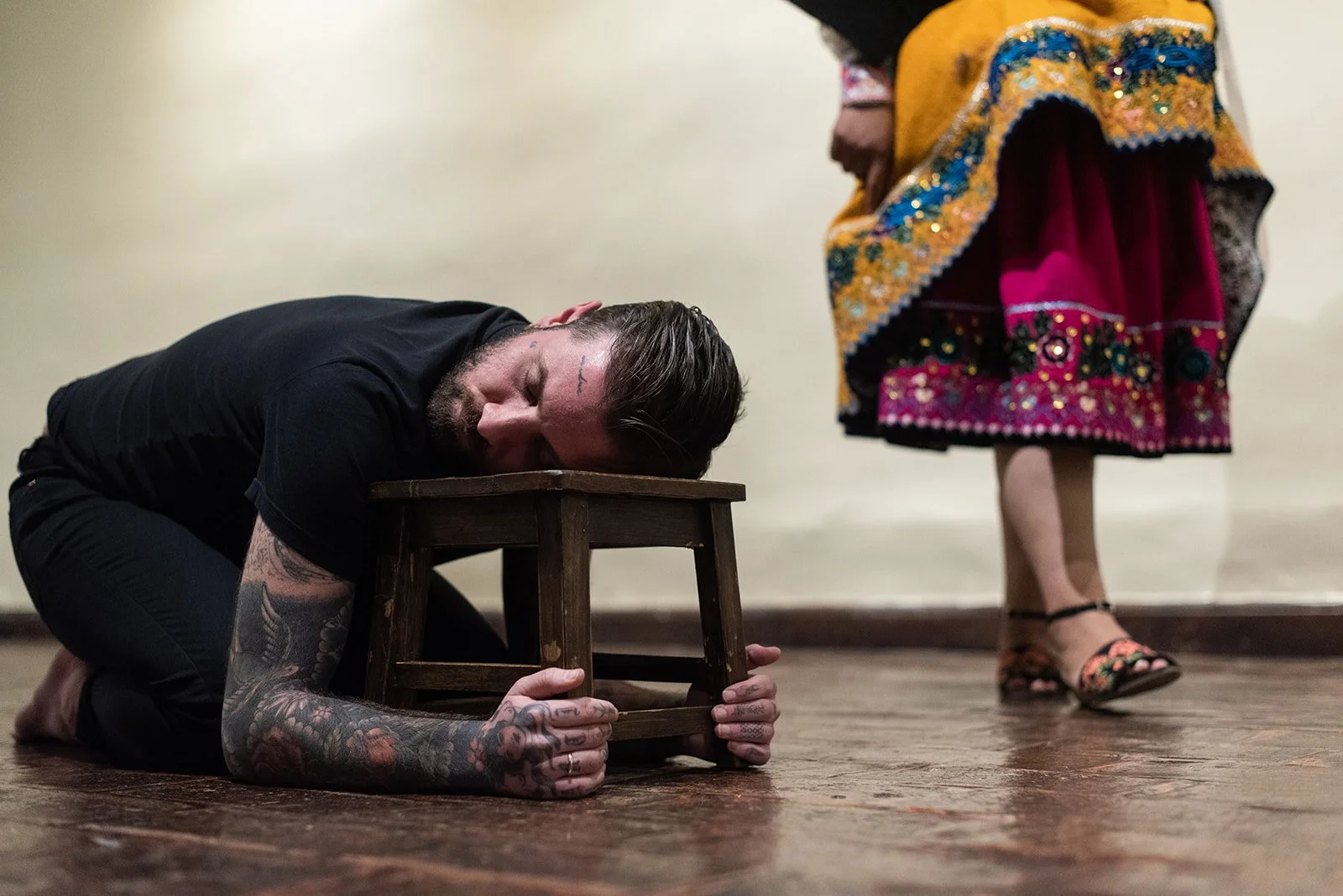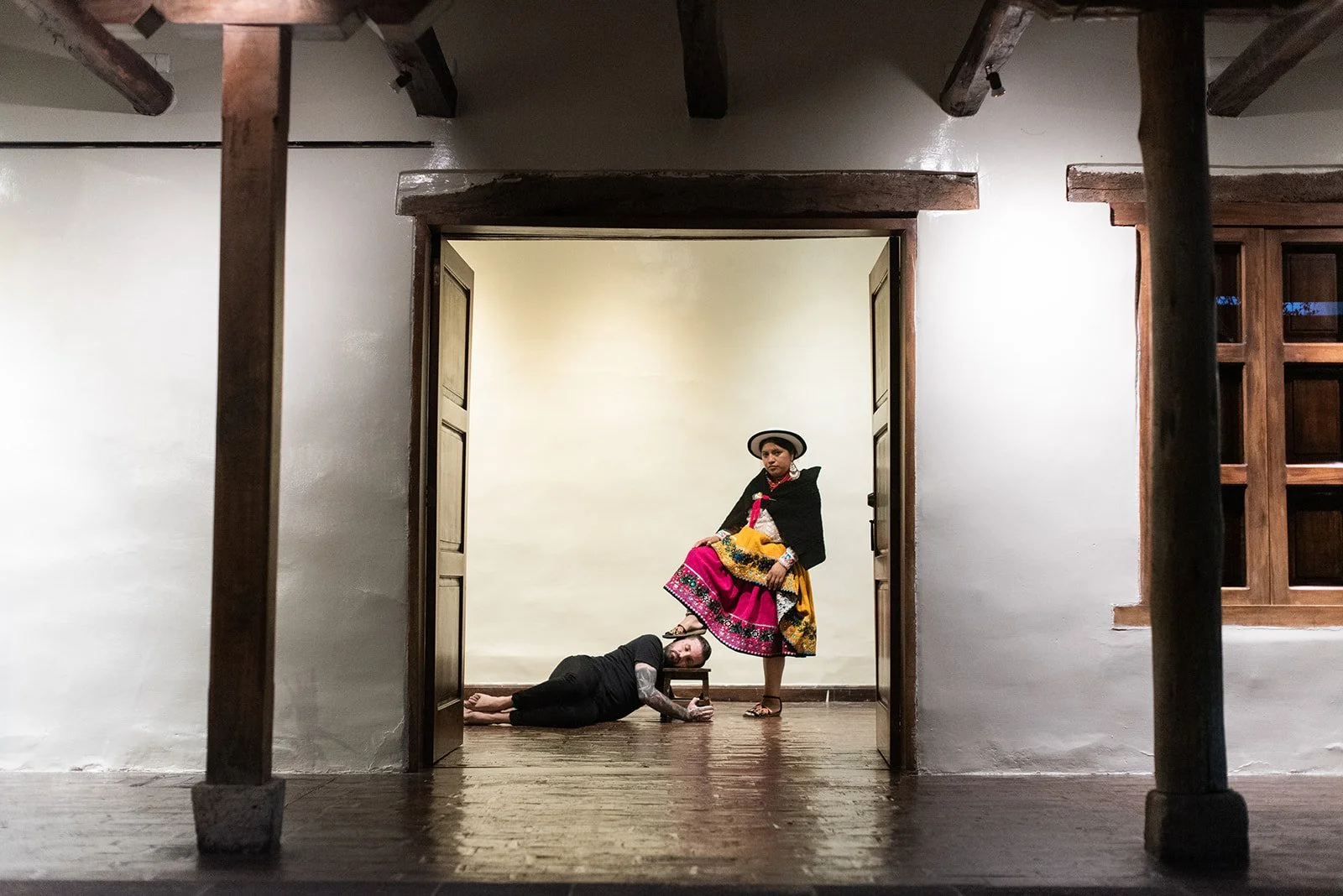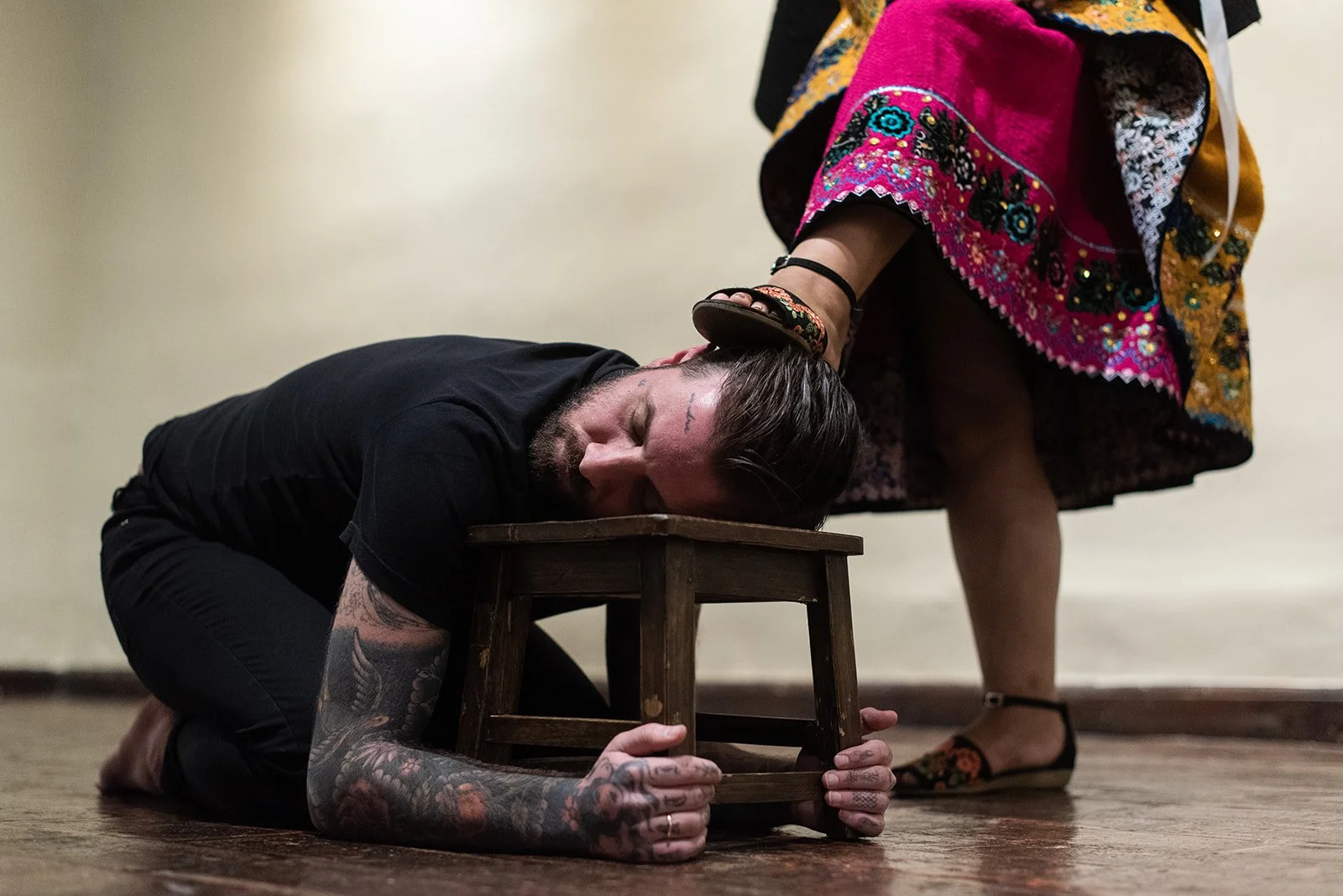 Despite the shades of gray in Azcona's life experience and representation, as he is pursued in his own country with lawsuits, legal proceedings, and complaints, the artist narrates the performance solely in terms of the physical, presenting himself at first glance as a white, cisgender man with the power to shoulder the burden of hatred, memory, and colonial genocide. However, Verónica Solano, through her bodily work in this space of power, feels empathy and affection for the artist. She expresses a song of forgiveness to Azcona, placing her head on his behalf in the name of Spain. The sweet melodies of the Quechua songs cradle the current communication limitations between indigenous nationalities and the colonizing country, addressing the prejudices held on both sides.