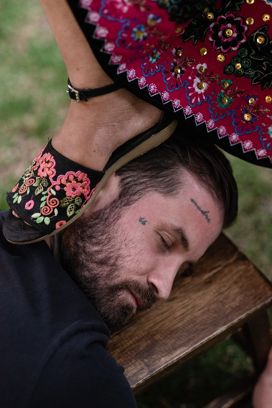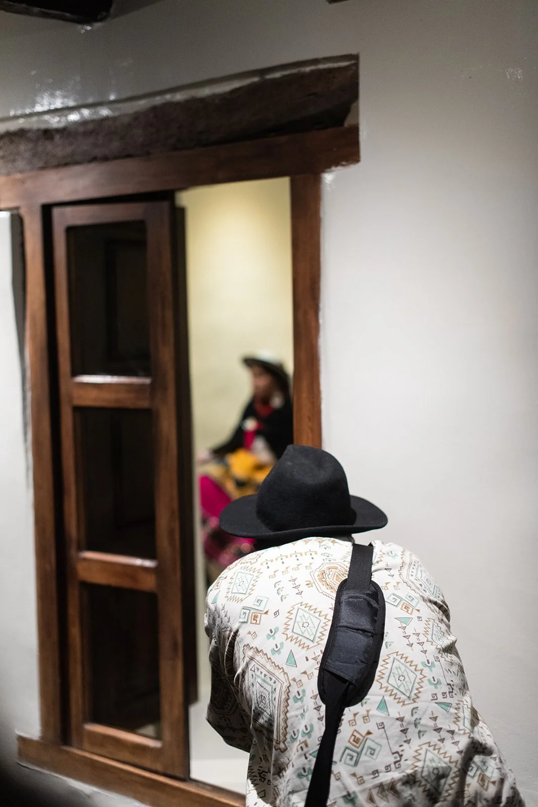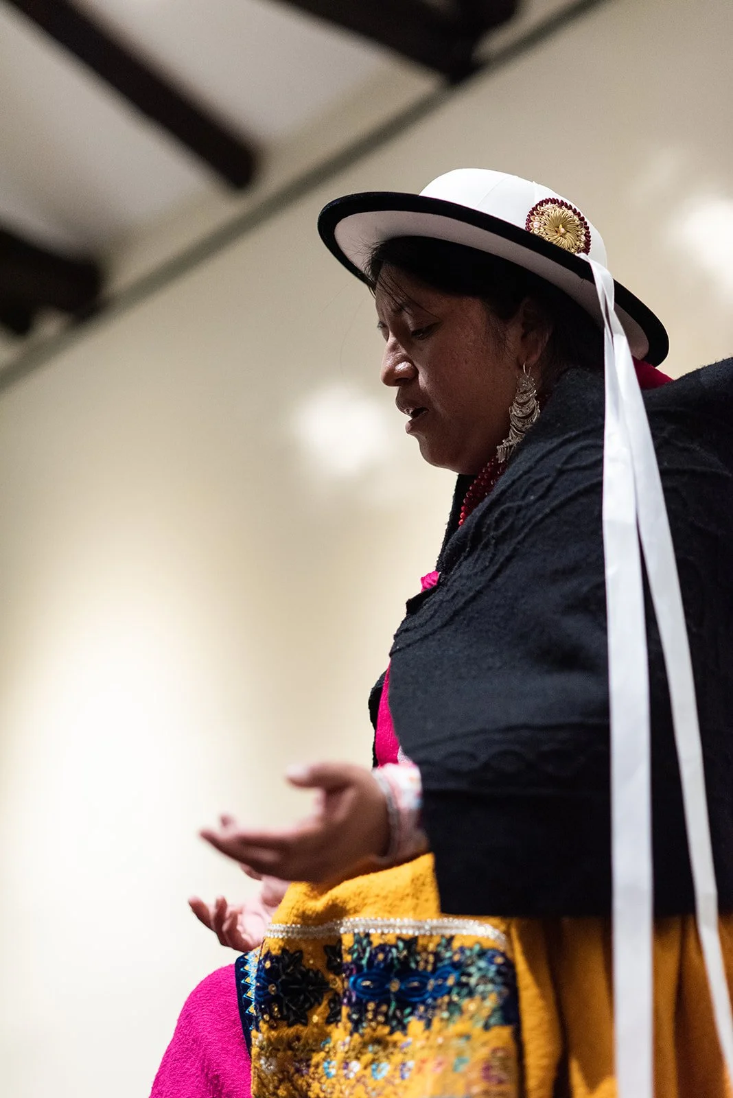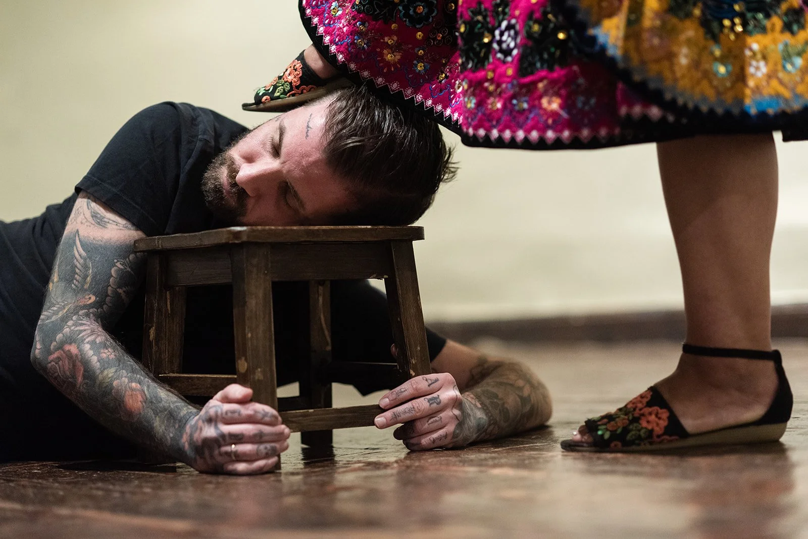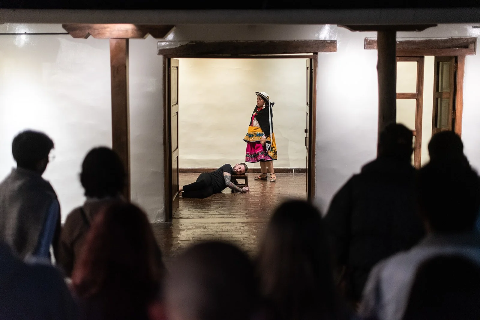 Despite the shades of gray in Azcona's life experience and representation, as he is pursued in his own country with lawsuits, legal proceedings, and complaints, the artist narrates the performance solely in terms of the physical, presenting himself at first glance as a white, cisgender man with the power to shoulder the burden of hatred, memory, and colonial genocide. However, Verónica Solano, through her bodily work in this space of power, feels empathy and affection for the artist. She expresses a song of forgiveness to Azcona, placing her head on his behalf in the name of Spain. The sweet melodies of the Quechua songs cradle the current communication limitations between indigenous nationalities and the colonizing country, addressing the prejudices held on both sides.
