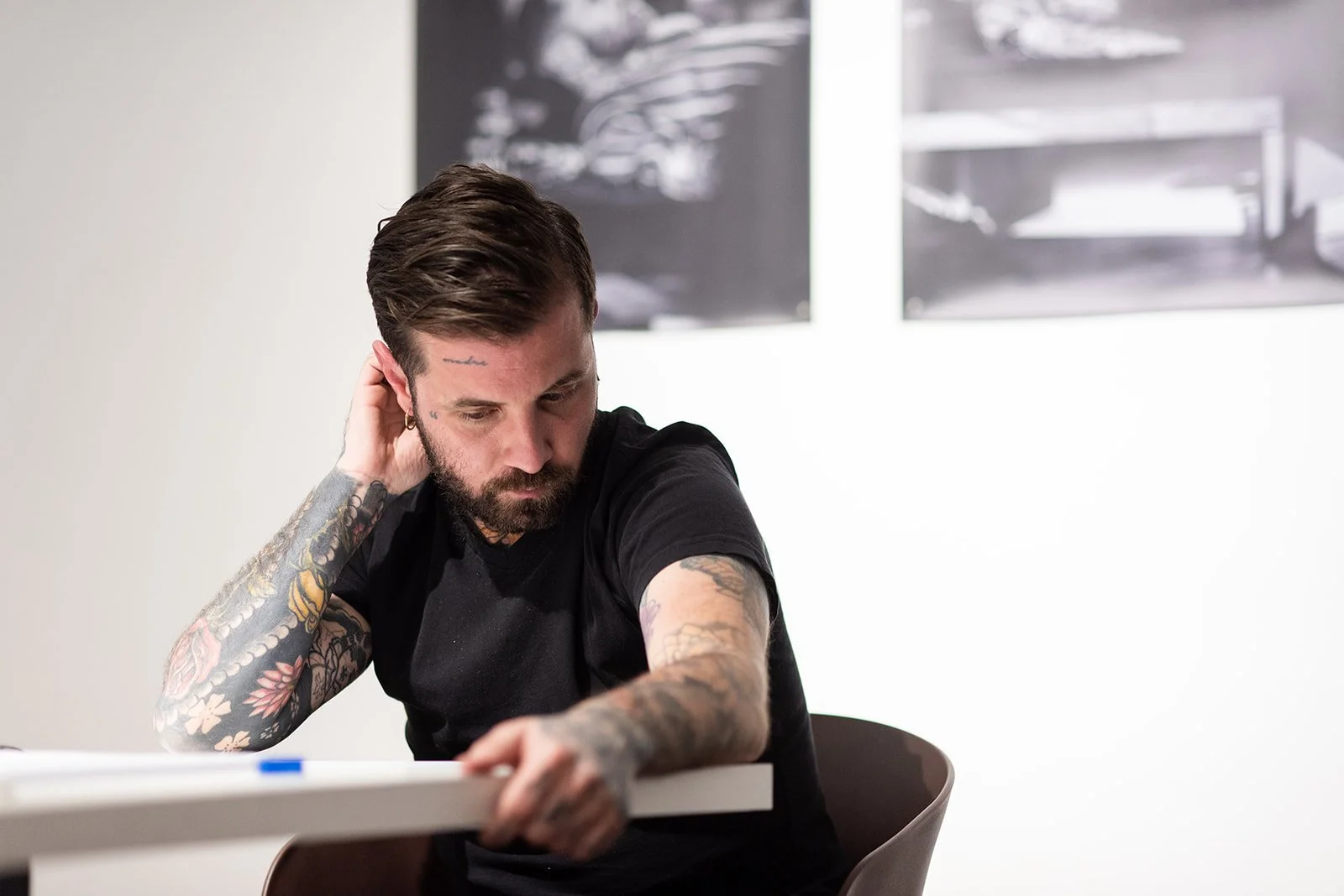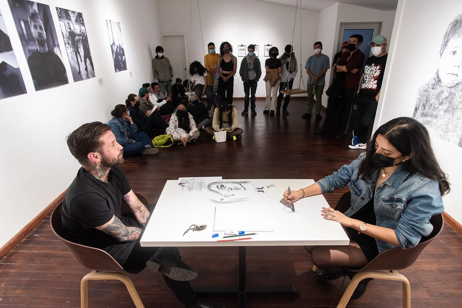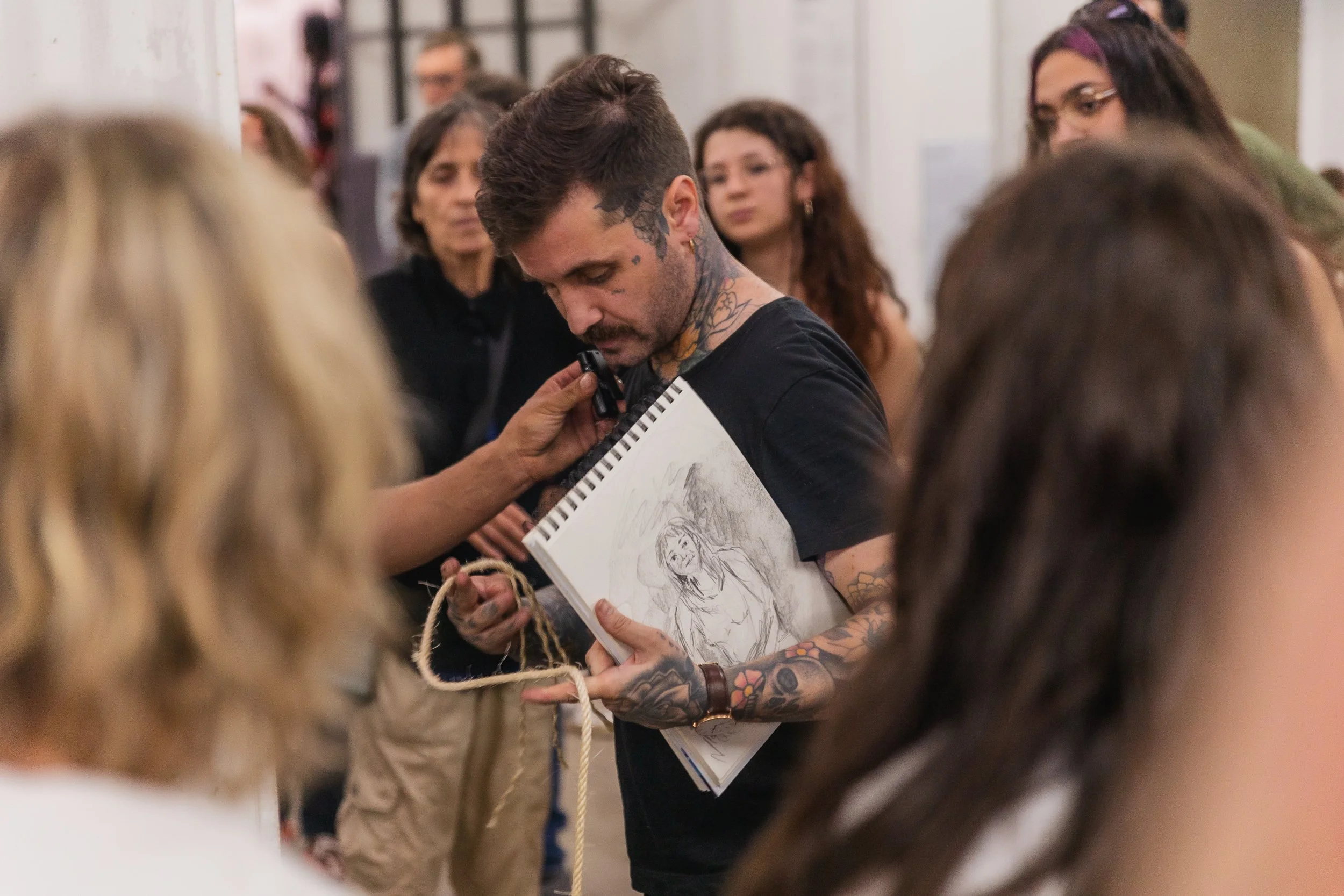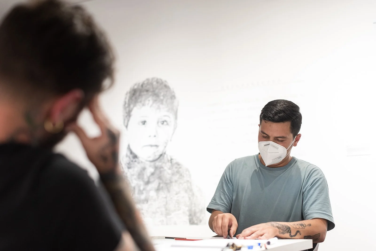 En la primera fase performativa los nueve dibujantes se integraron en la instalación viva diseñada por el artista junto a veinte participantes con experiencia en el ámbito de la orfandad y el abandono.
