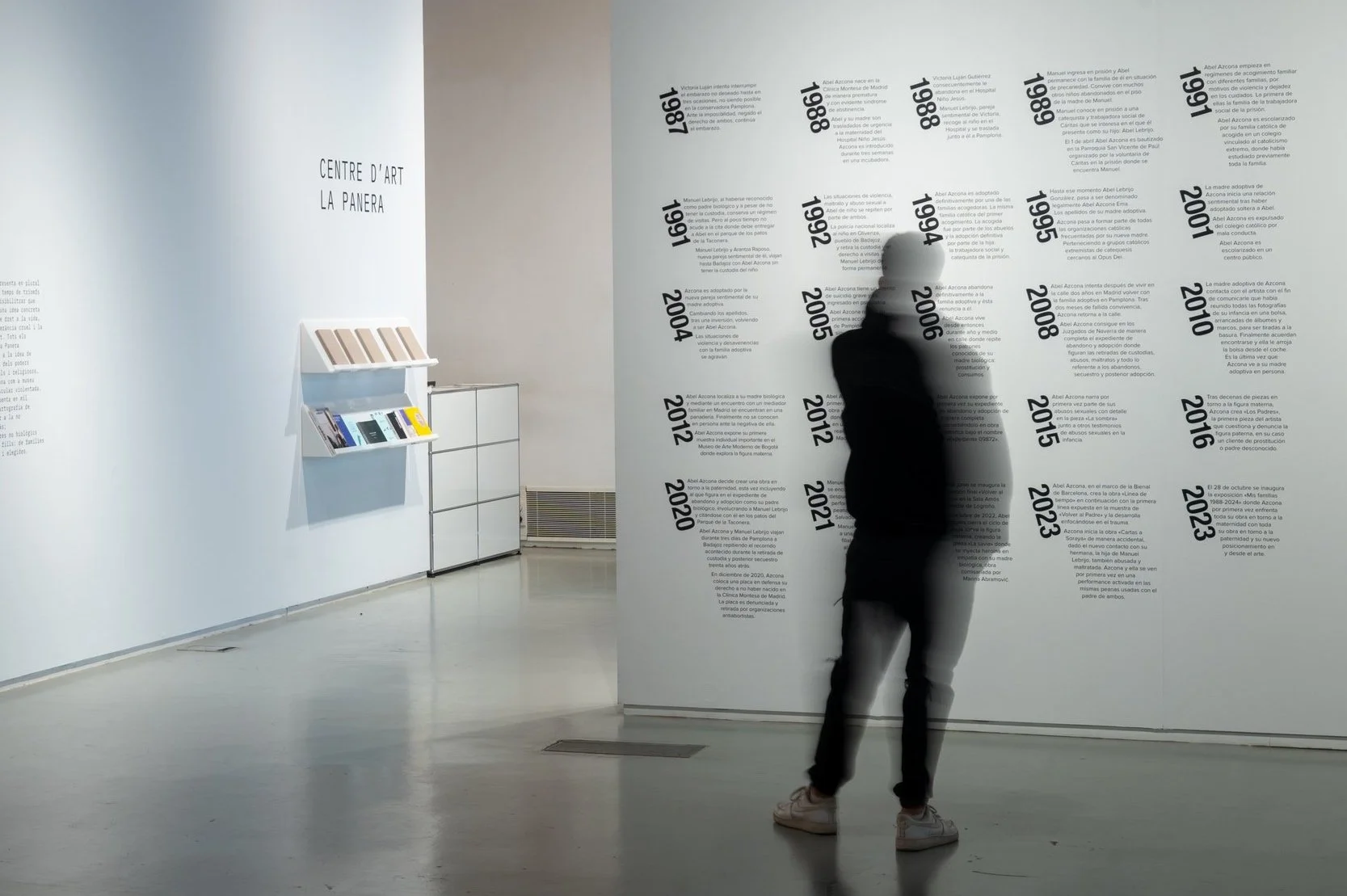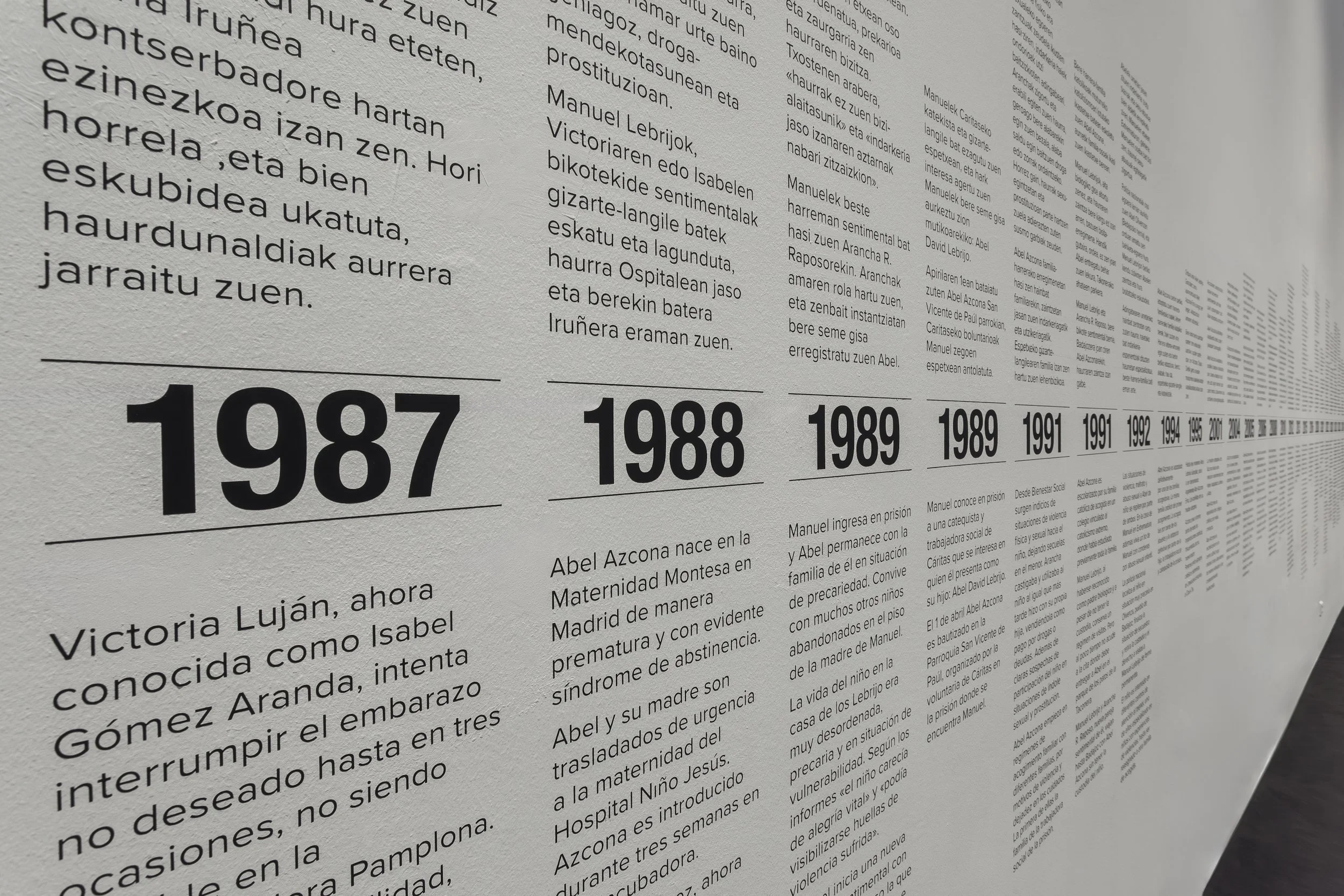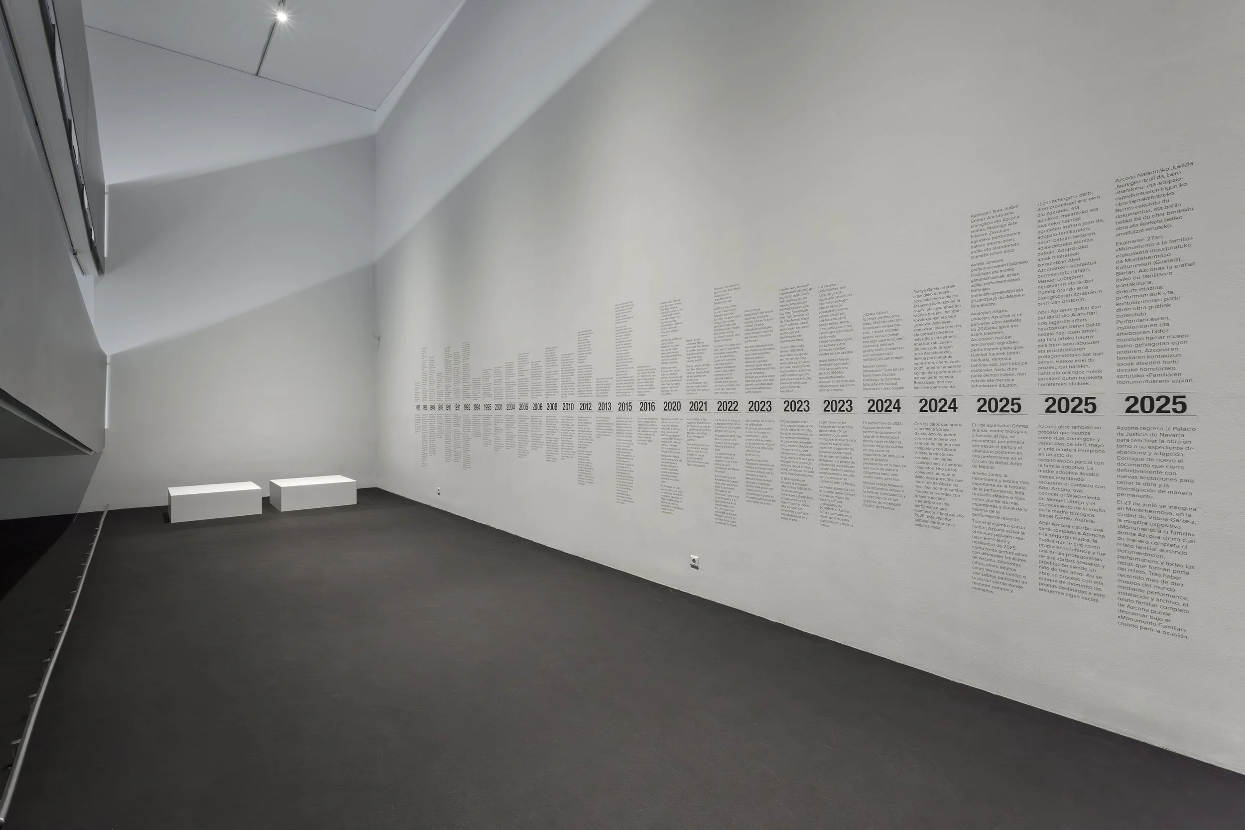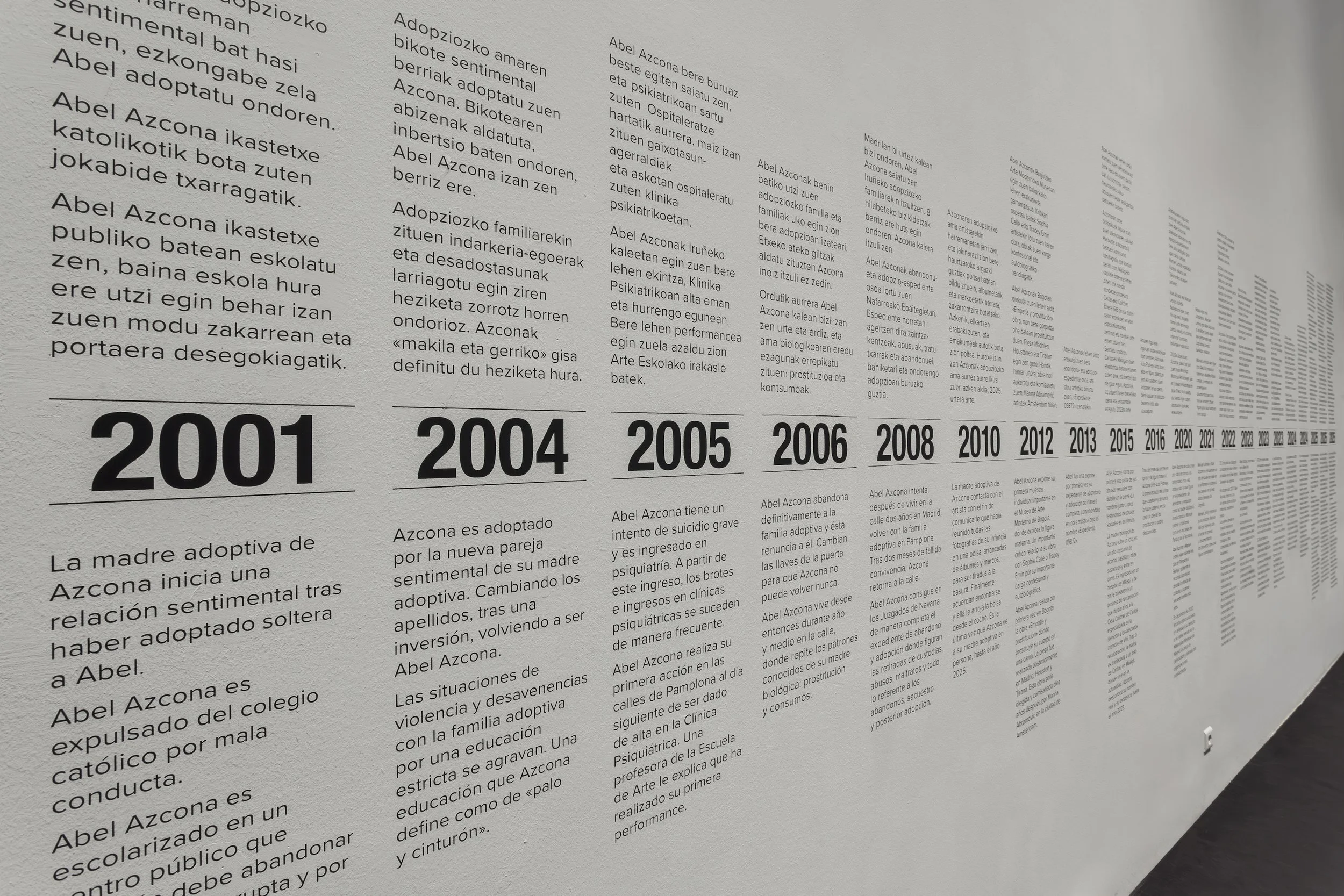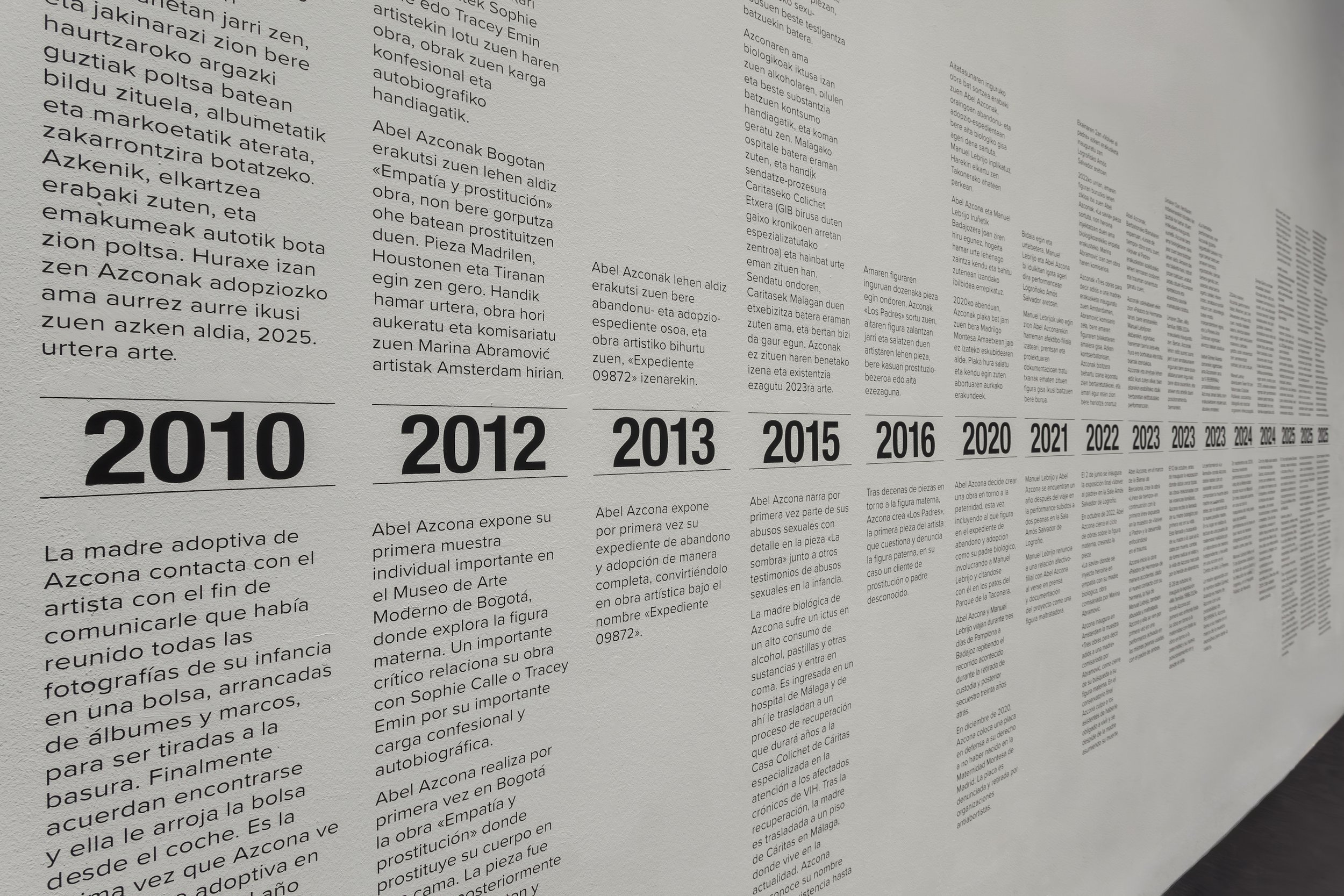At the Barcelona Biennial, Azcona creates the work “Timeline,” continuing the first timeline exhibited in “Return to the Father,” now focusing on trauma.