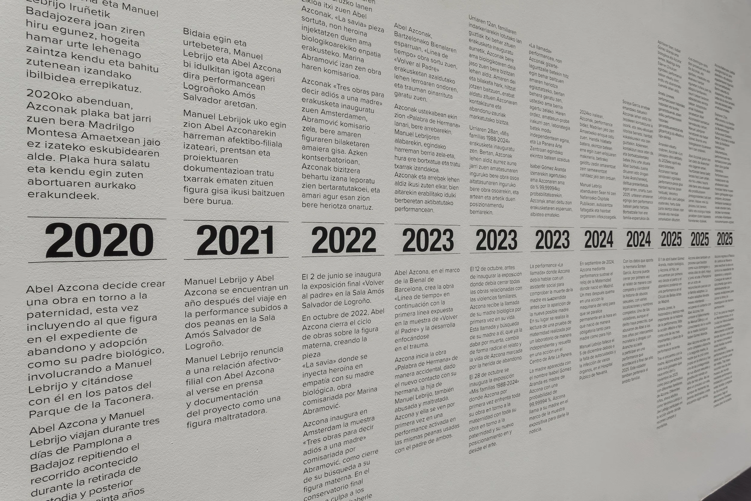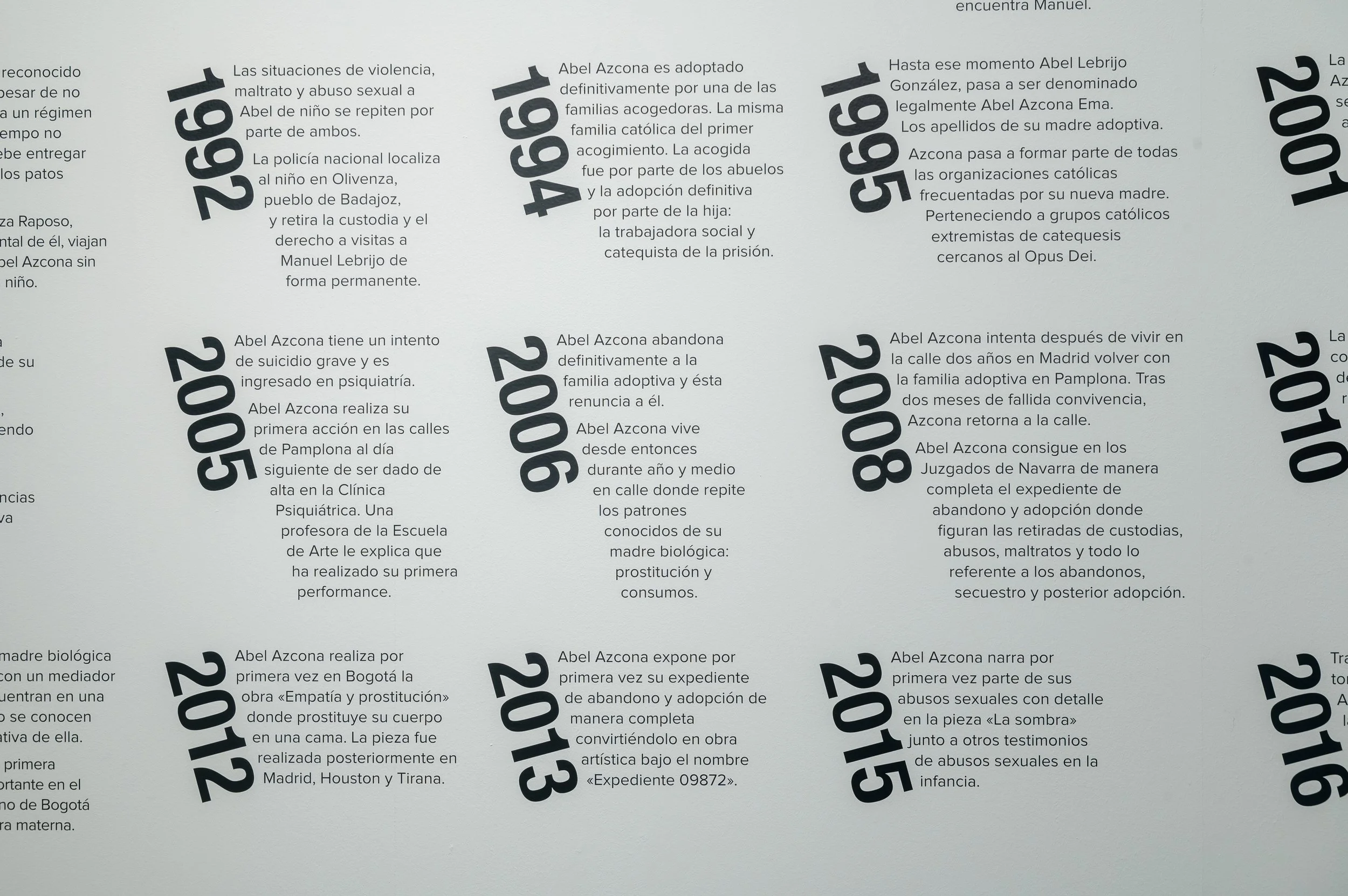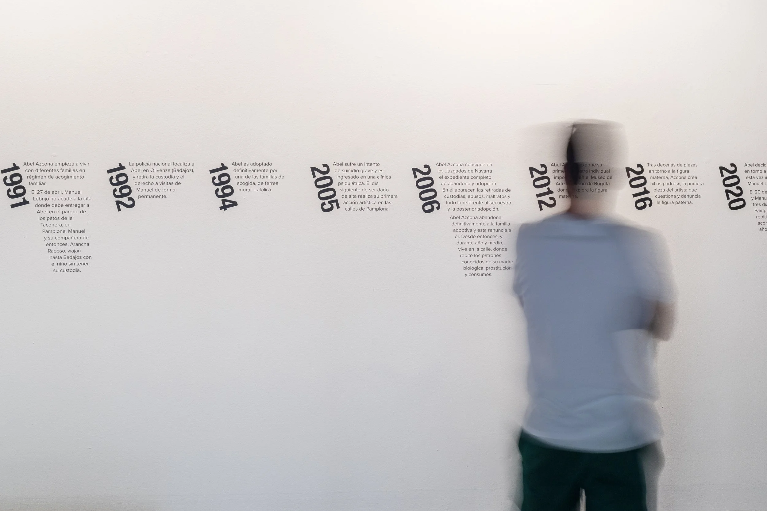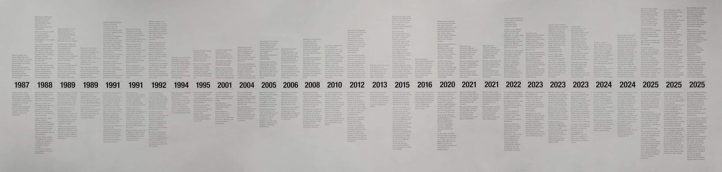 2023 Abel Azcona, in the context of the Biennial of Barcelona, creates the work “Línea de tiempo” [Timeline], as a continuation of the first line exhibited in the exhibition “Volver al Padre” and develops it focusing on trauma.