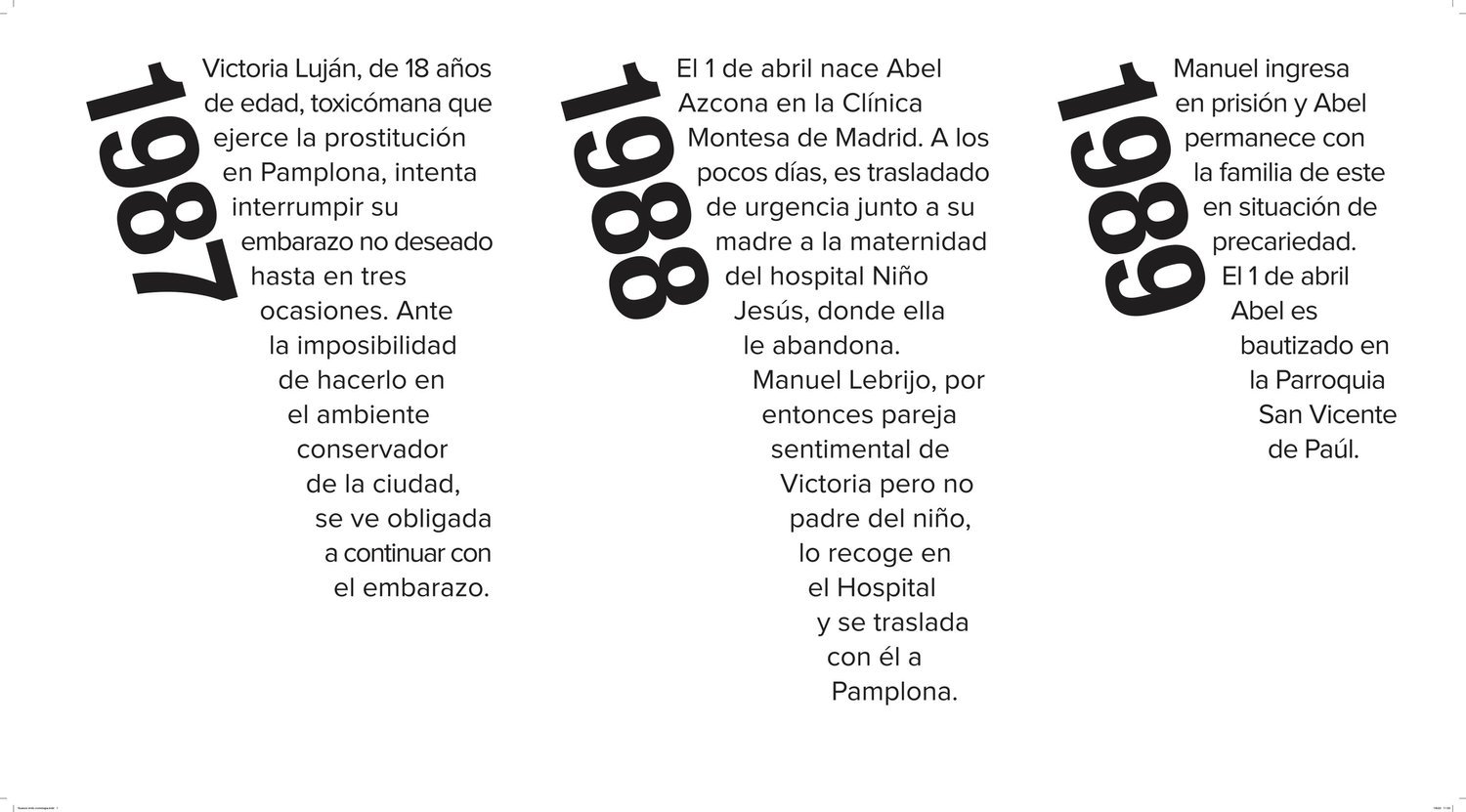 Victoria Luján tries to interrupt her unwanted pregnancy on three occasions, but this is not possible in conservative Pamplona. In the face of this impossibility, with the rights of both denied, she continues with the pregnancy. Abel Azcona is born at the Montesa clinic in Madrid, premature and with evident signs of withdrawal syndrome. Abel and his mother are urgently transferred to the maternity unit of the Niño Jesús hospital. Azcona spends three weeks in an incubator. Victoria Luján Gutiérrez then abandons the child in the hospital. Manuel Lebrijo, Victoria’s romantic partner, collects the child from the hospital and takes him to Pamplona. Manuel is sent to prison and Abel stays with the former’s family in a precarious situation. He lives with many other abandoned children in the apartment of Manuel’s mother. In prison, Manuel meets a catechist and social worker for the Catholic charity Cáritas who is interested in the boy he presents as his son: Abel Lebrijo. On 1 April, Abel Azcona is baptized in the church of San Vincent de Paul, organized by the Cáritas volunteer at the prison where Manuel is detained.