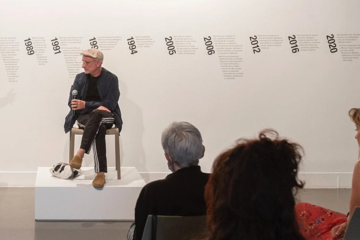 2020 Abel Azcona decides to create a work about fatherhood, this time including the man who appears in the abandonment and adoption certificate as his biological father, involving Manuel Lebrijo and making an appointment to meet him at the duck pond in the Taconera Park.