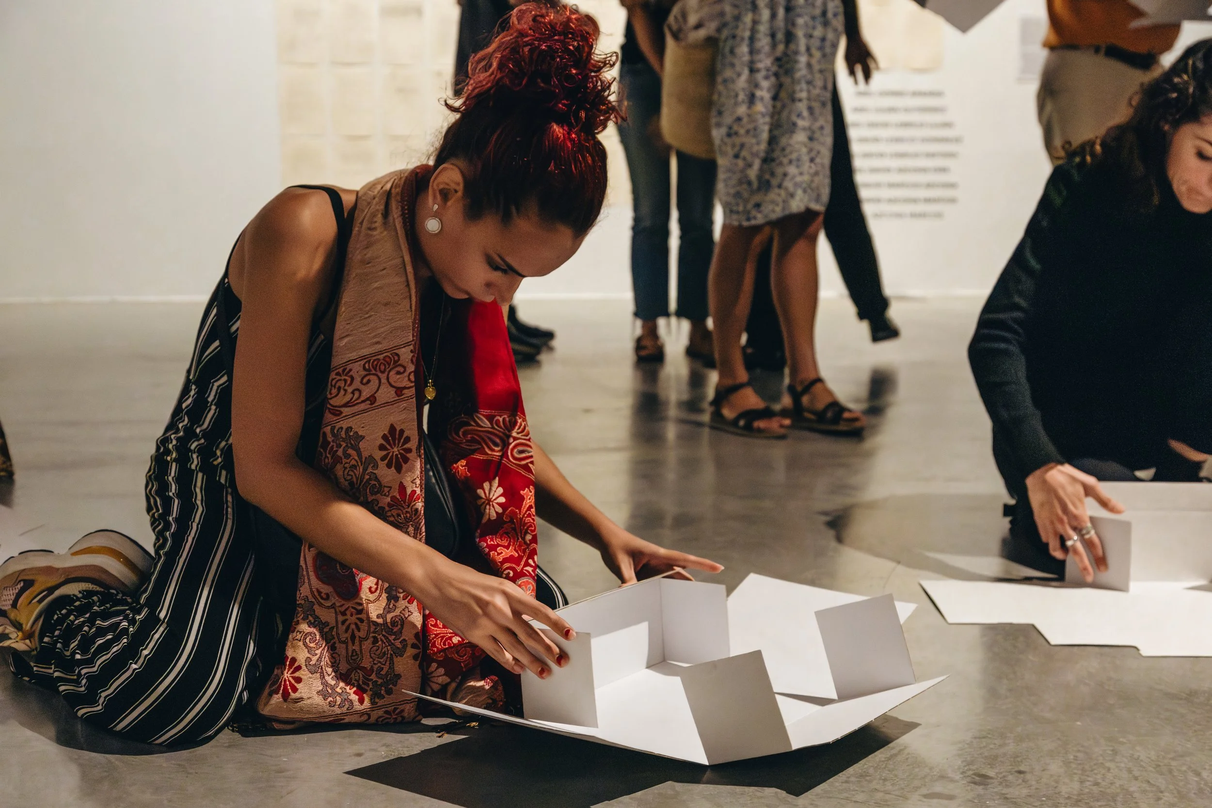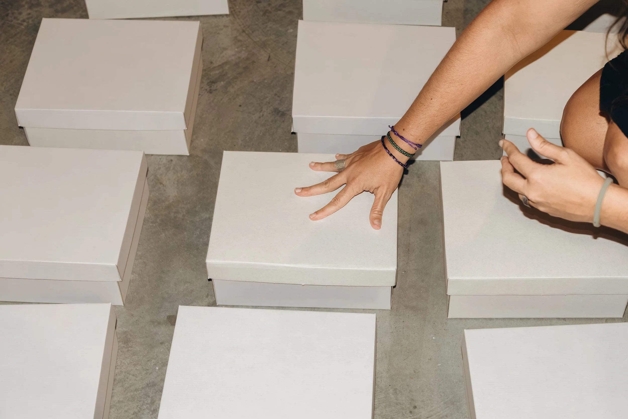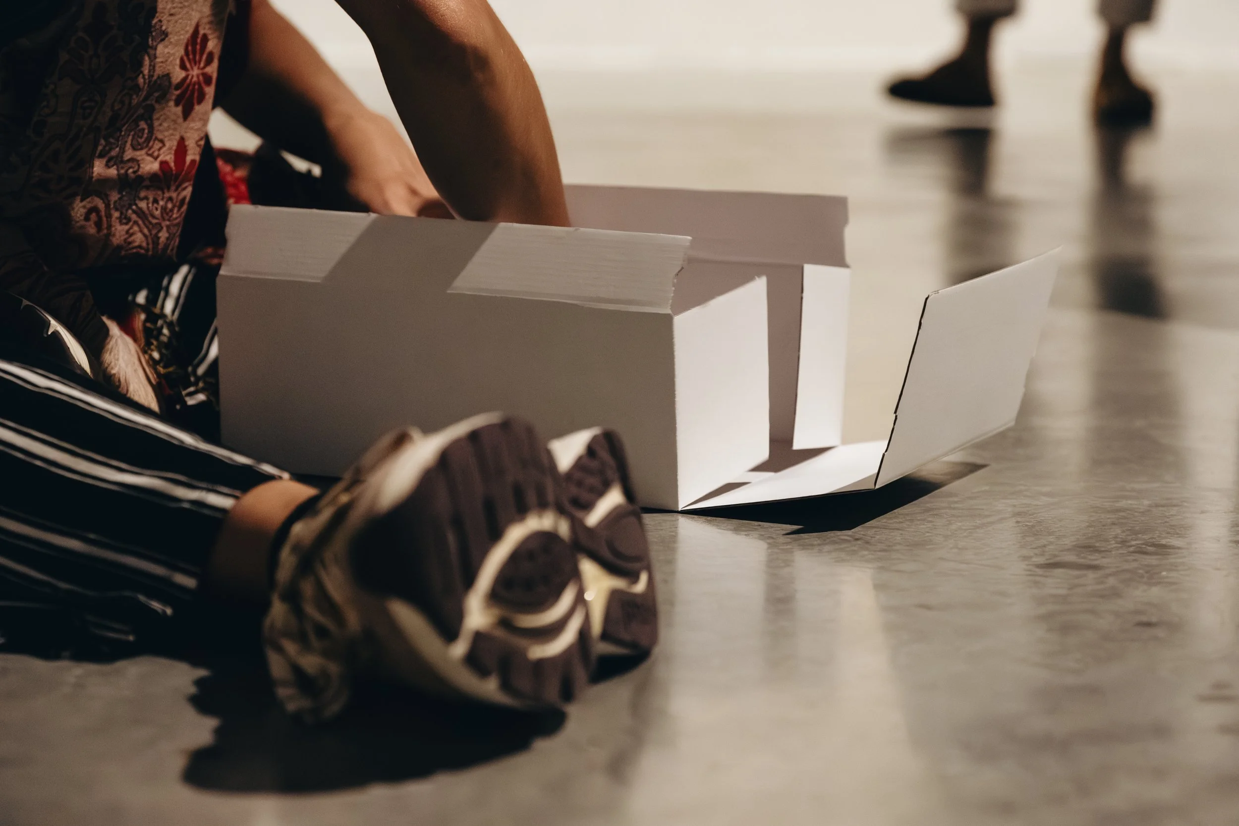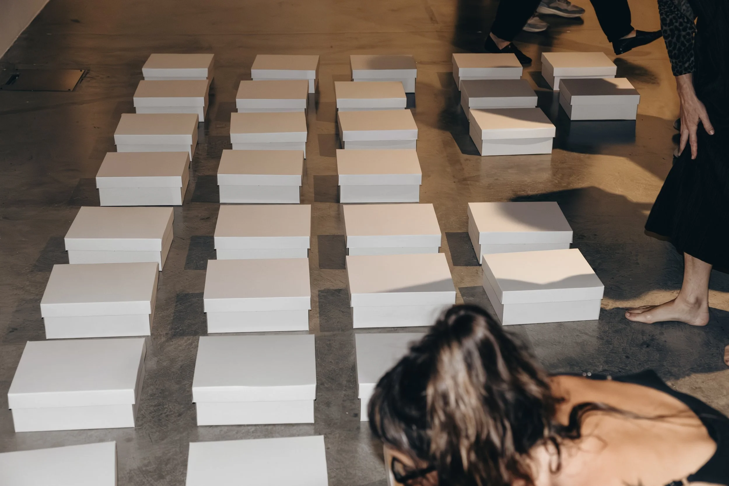 Fifty empty boxes. At the end of 2025, Azcona will present an exhibition featuring twelve large-format works in collaboration with fifty mothers and fifty children separated at birth in different maternity hospitals in Madrid, such as Clínica San Ramón or the Montesa Maternity Hospital, where Azcona himself was born. In September 2025, he began one of the pieces through a performance—an action of construction and protest moving from the individual to the collective, which evolved into an installation. Visitors to the exhibition, some of them children who were stolen at birth, together with Azcona, built fifty white boxes and created the installation collectively.