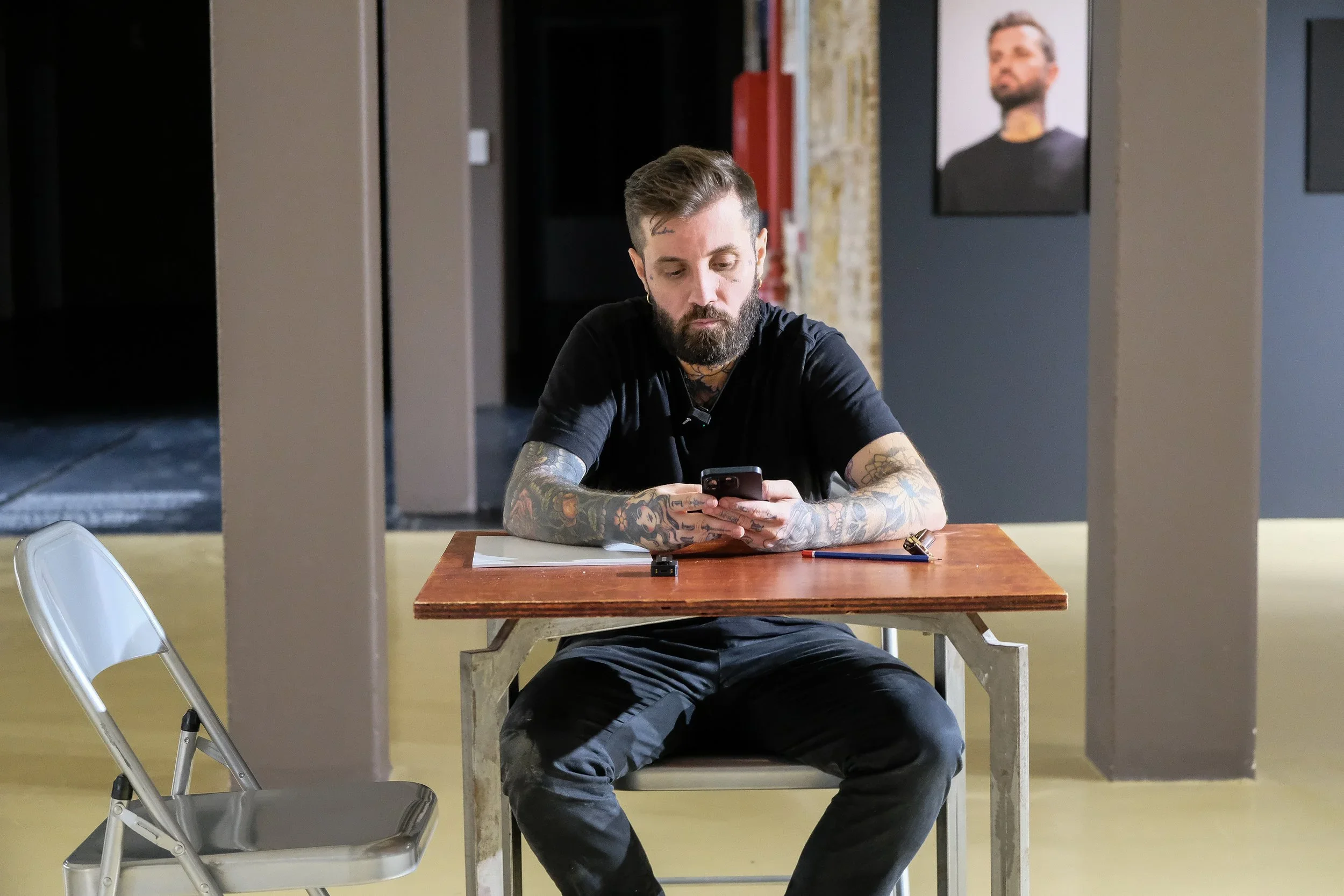 The artist Abel Azcona photographed at the inauguration at the Cuartel de Artillería in Murcia. / El artista Abel Azcona fotografiado elía de la inauguración en el Cuartel de Artillería en Murcia.