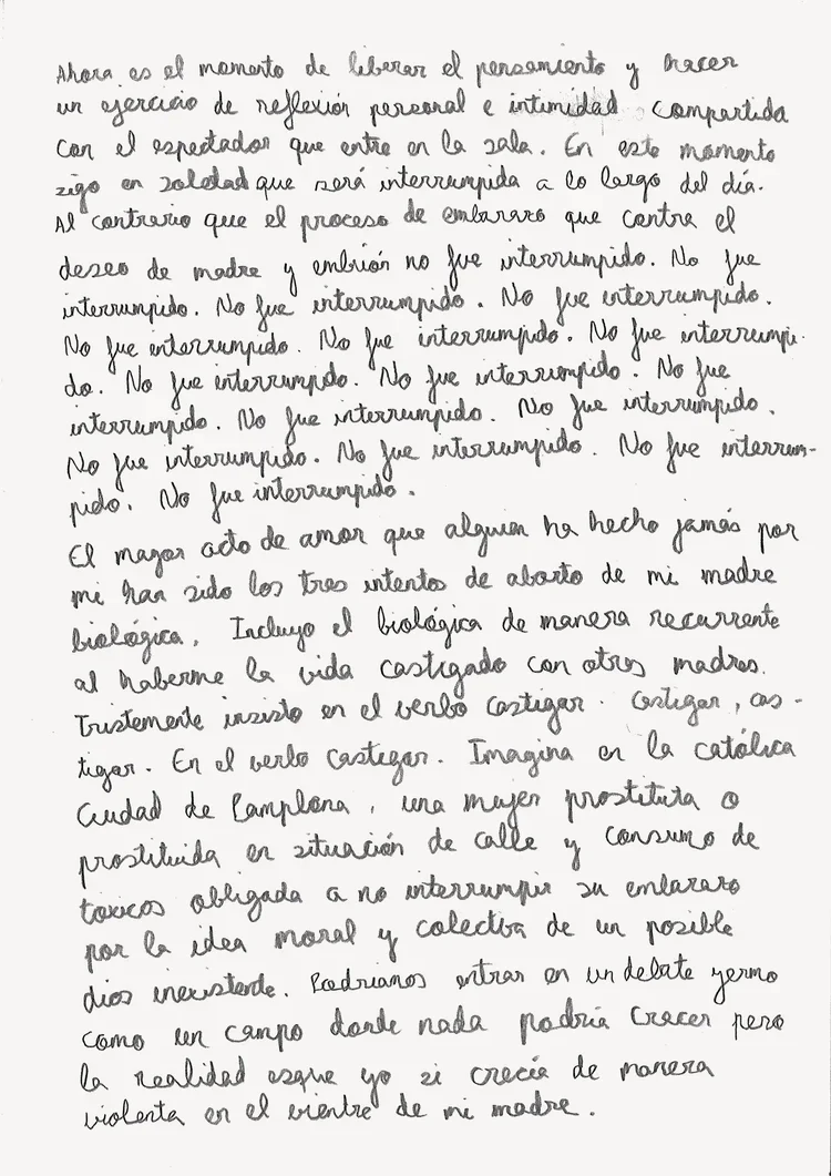 THIRD BRIEF ACTION - PUBLIC AND COLLECTIVE READING OF EXEGESIS OF THE MOTHER. Seventy handwritten pages with the testimony, life, and experience of Azcona's biological mother are one of the steps taken by the artist and his mother before meeting at the end of this year in a performance. In this brief action, there will be a first performative reading of the manuscript, through word and body, with the collaboration of the audience.