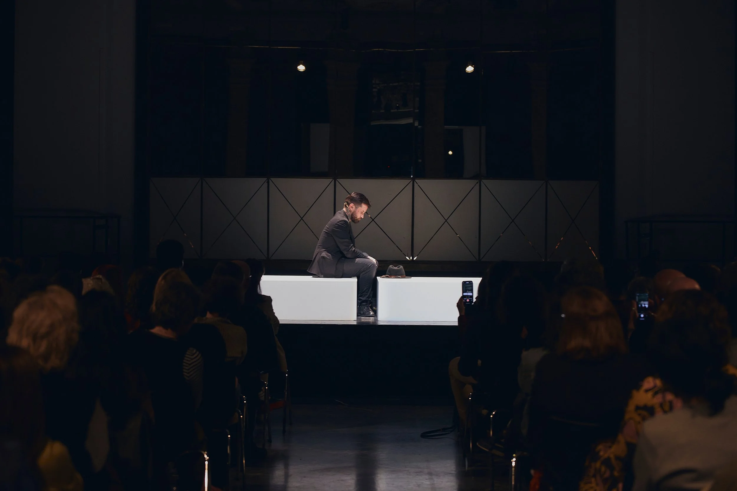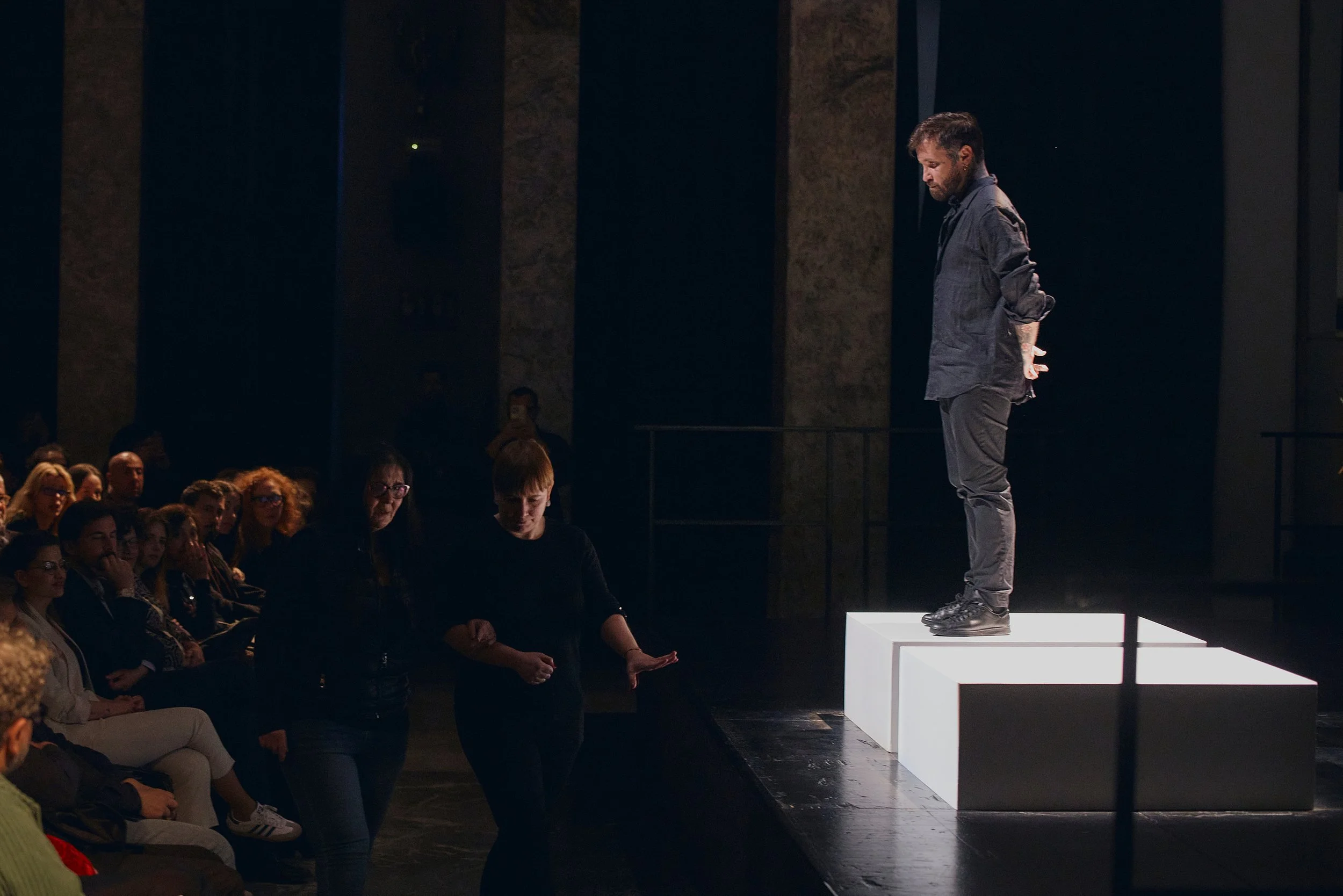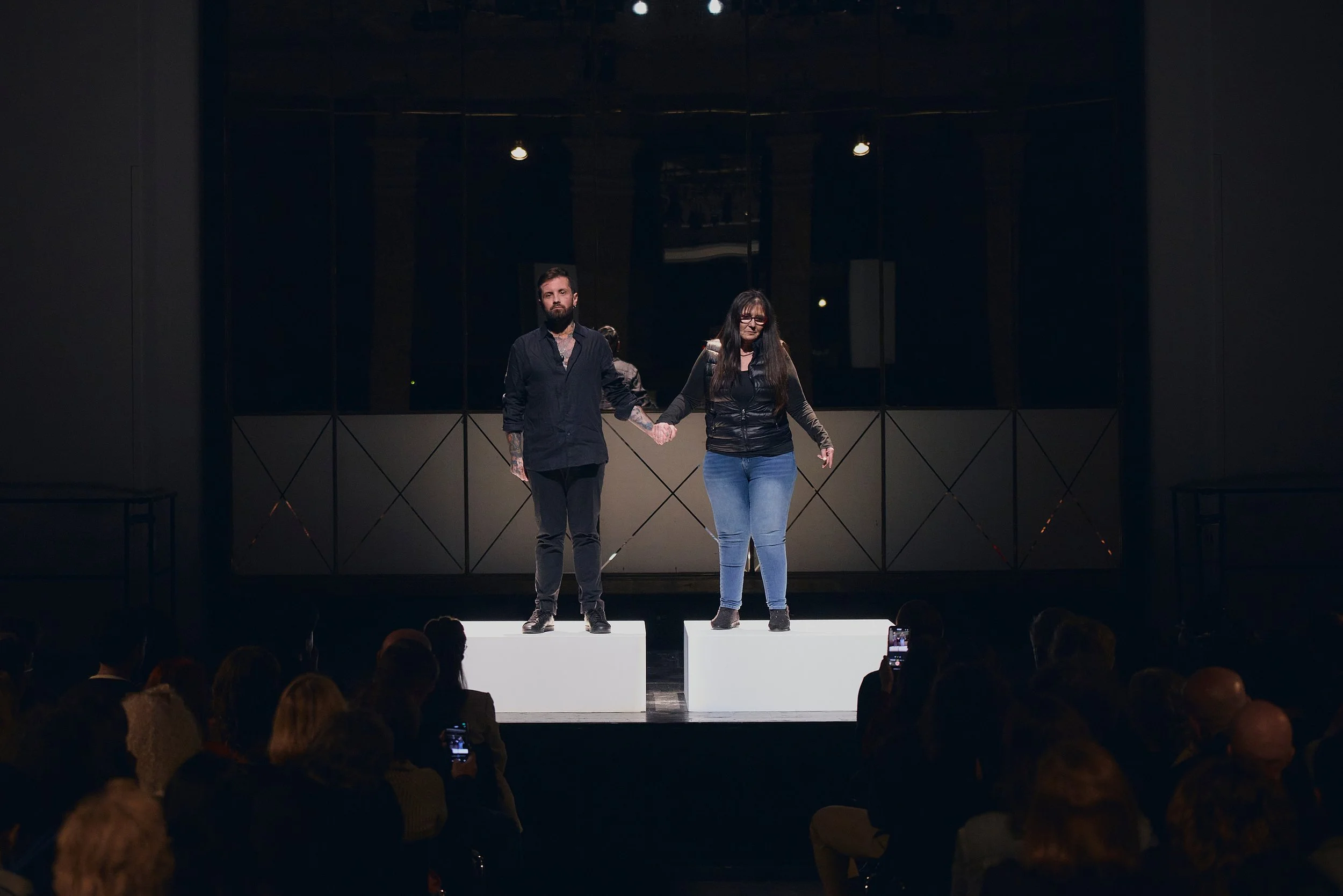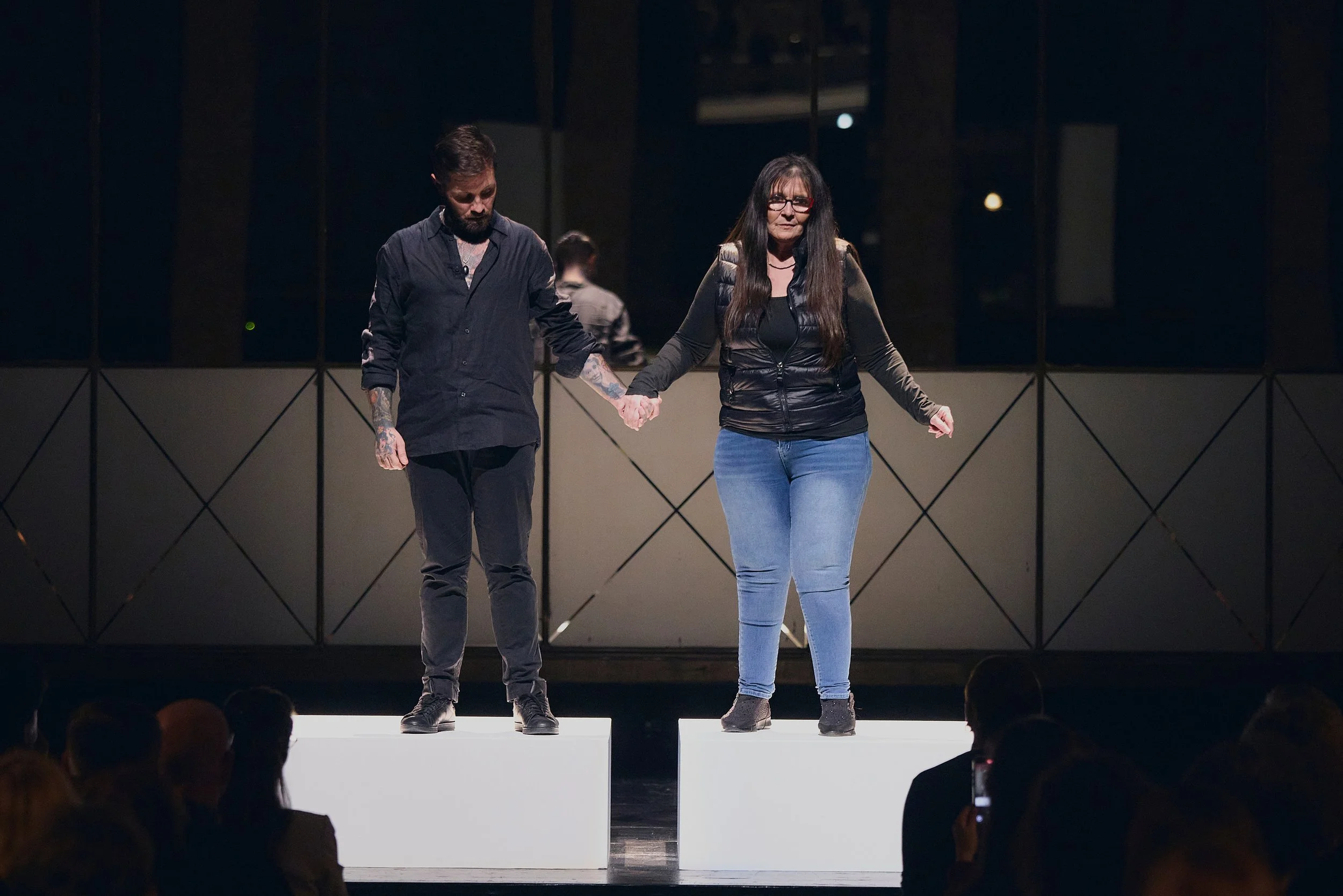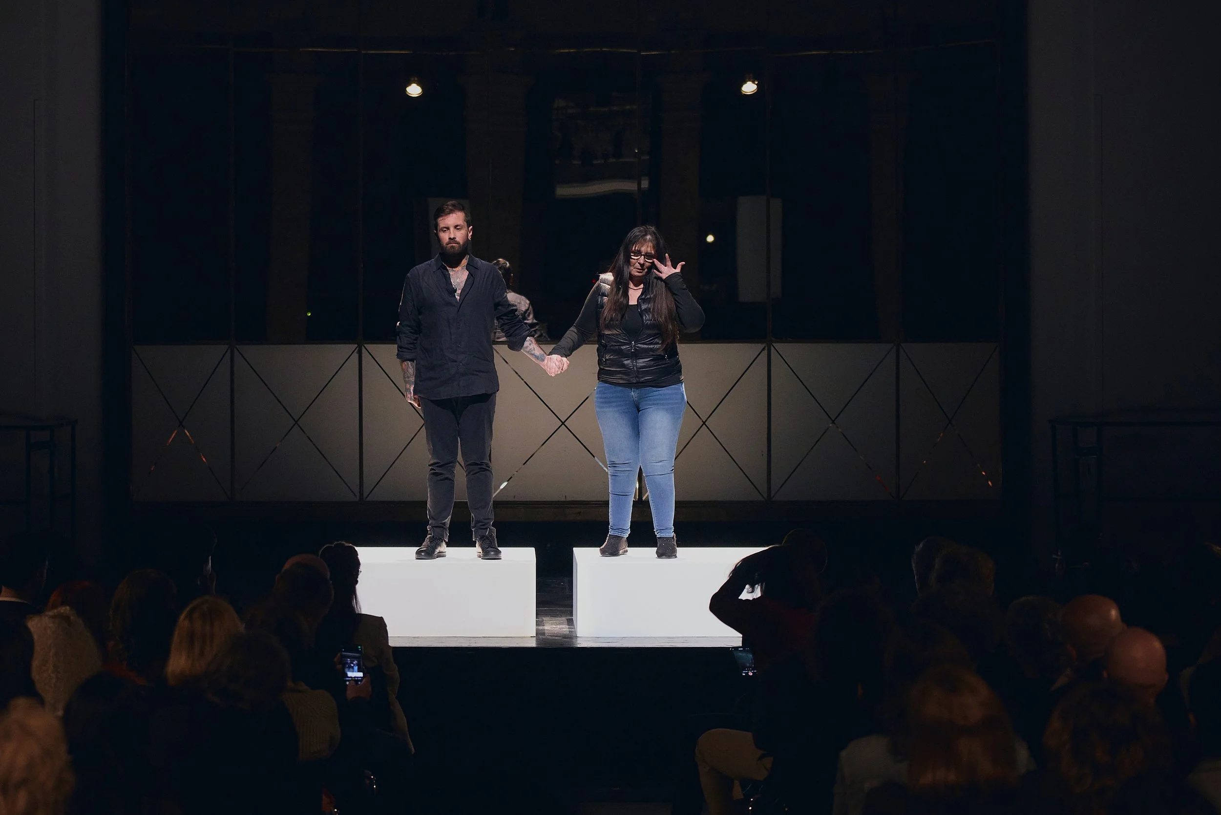 After saying a few words to explain their story to the audience, Azcona took off his blazer, rolled up his shirt sleeves, and waited, standing on a pedestal, for Isabel Gómez Aranda to step up onto the one left empty beside him. But the woman who crossed the aisle of the Hall of Columns, hidden behind dark glasses, eyes cast down, trembling, and assisted by the performance curator, Semíramis González, did not look like the same figure who for years had haunted the Spanish creator’s story with her absence. Instead, she appeared as a vulnerable woman, as much as (or even more than) he was, willing to enter the world of her artist son and to trade a private dinner or coffee for a stage full of strangers. And Azcona knew it: “The one who is coming is not the mother who abandoned me, but the mother who came looking for me.” Why meet her in a performance? “I don’t know if I could have done it otherwise. You are here partly to take responsibility as a society for having forced me to be born, and partly so I could feel your company,” the artist said at the end.