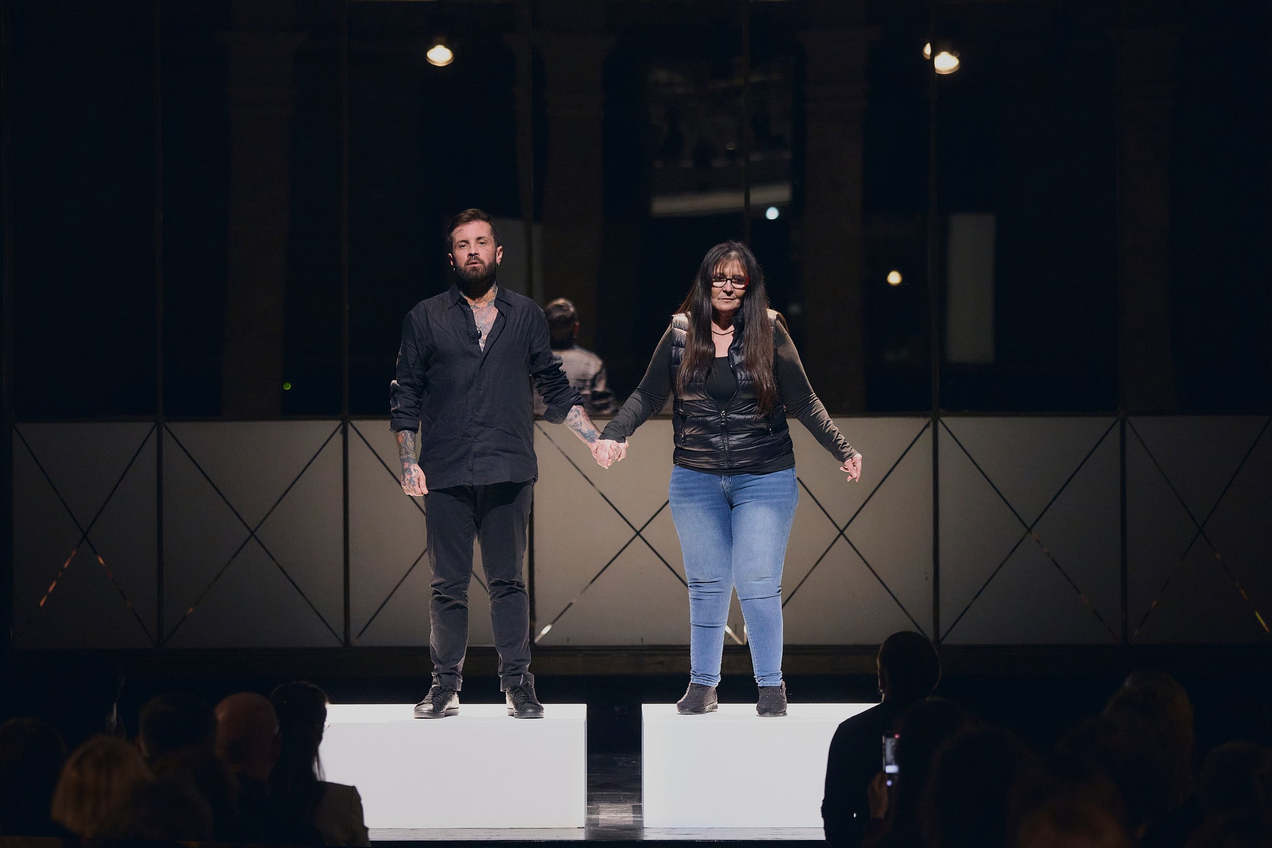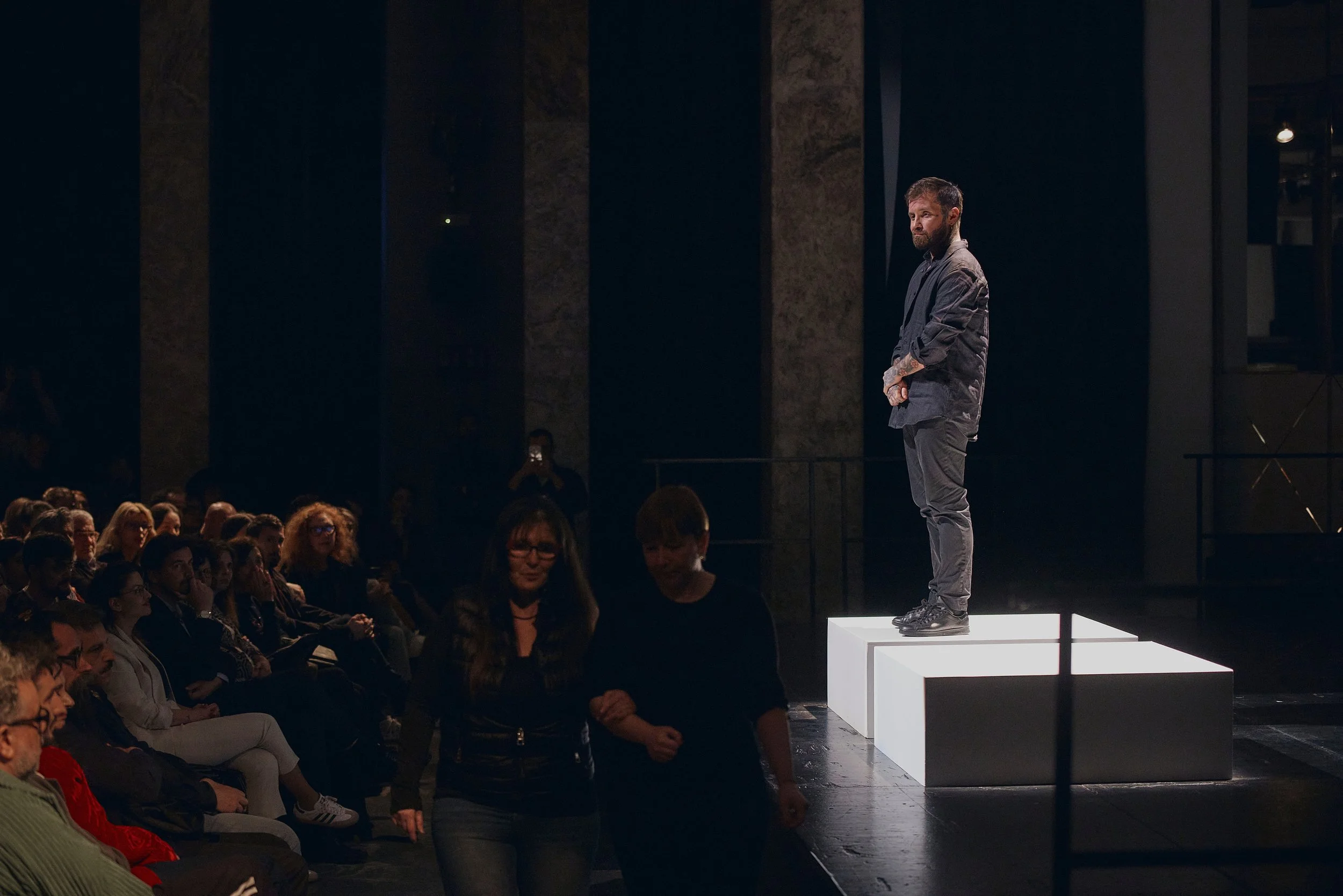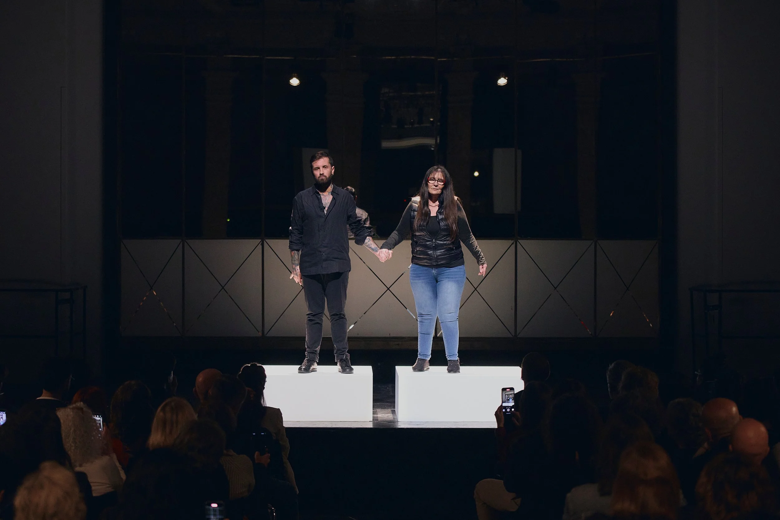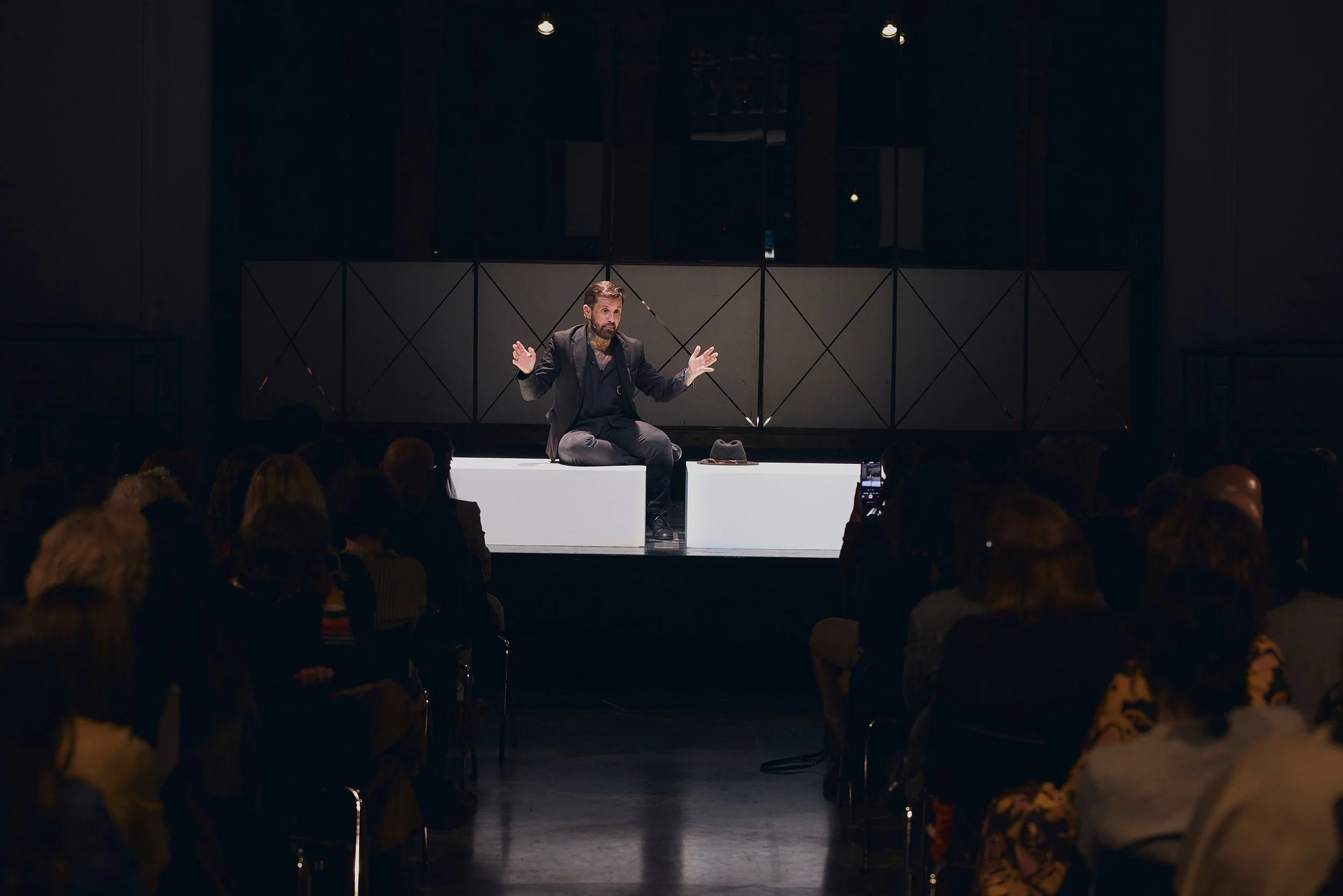 After saying a few words to explain their story to the audience, Azcona took off his blazer, rolled up his shirt sleeves, and waited, standing on a pedestal, for Isabel Gómez Aranda to step up onto the one left empty beside him. But the woman who crossed the aisle of the Hall of Columns, hidden behind dark glasses, eyes cast down, trembling, and assisted by the performance curator, Semíramis González, did not look like the same figure who for years had haunted the Spanish creator’s story with her absence. Instead, she appeared as a vulnerable woman, as much as (or even more than) he was, willing to enter the world of her artist son and to trade a private dinner or coffee for a stage full of strangers. And Azcona knew it: “The one who is coming is not the mother who abandoned me, but the mother who came looking for me.” Why meet her in a performance? “I don’t know if I could have done it otherwise. You are here partly to take responsibility as a society for having forced me to be born, and partly so I could feel your company,” the artist said at the end.