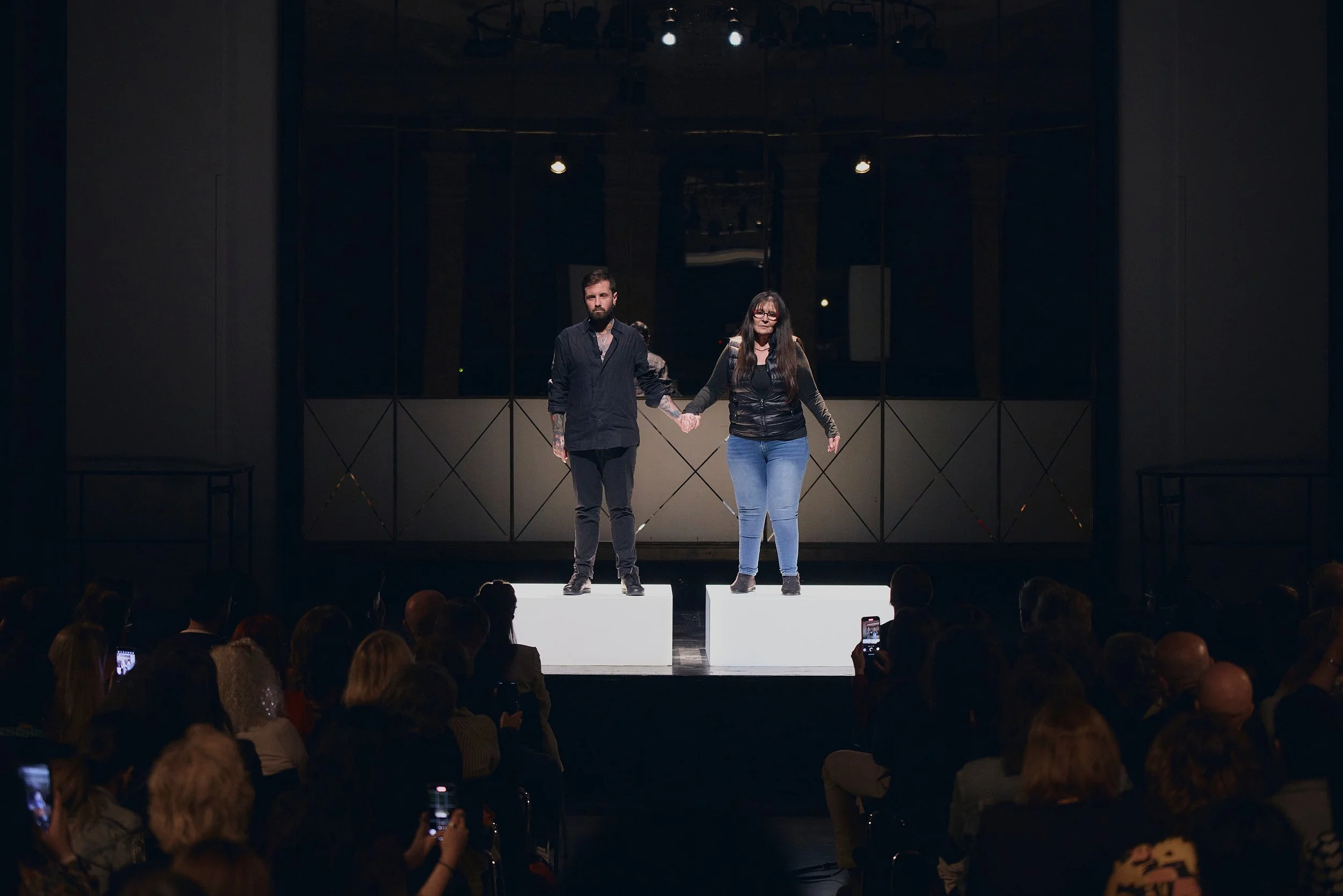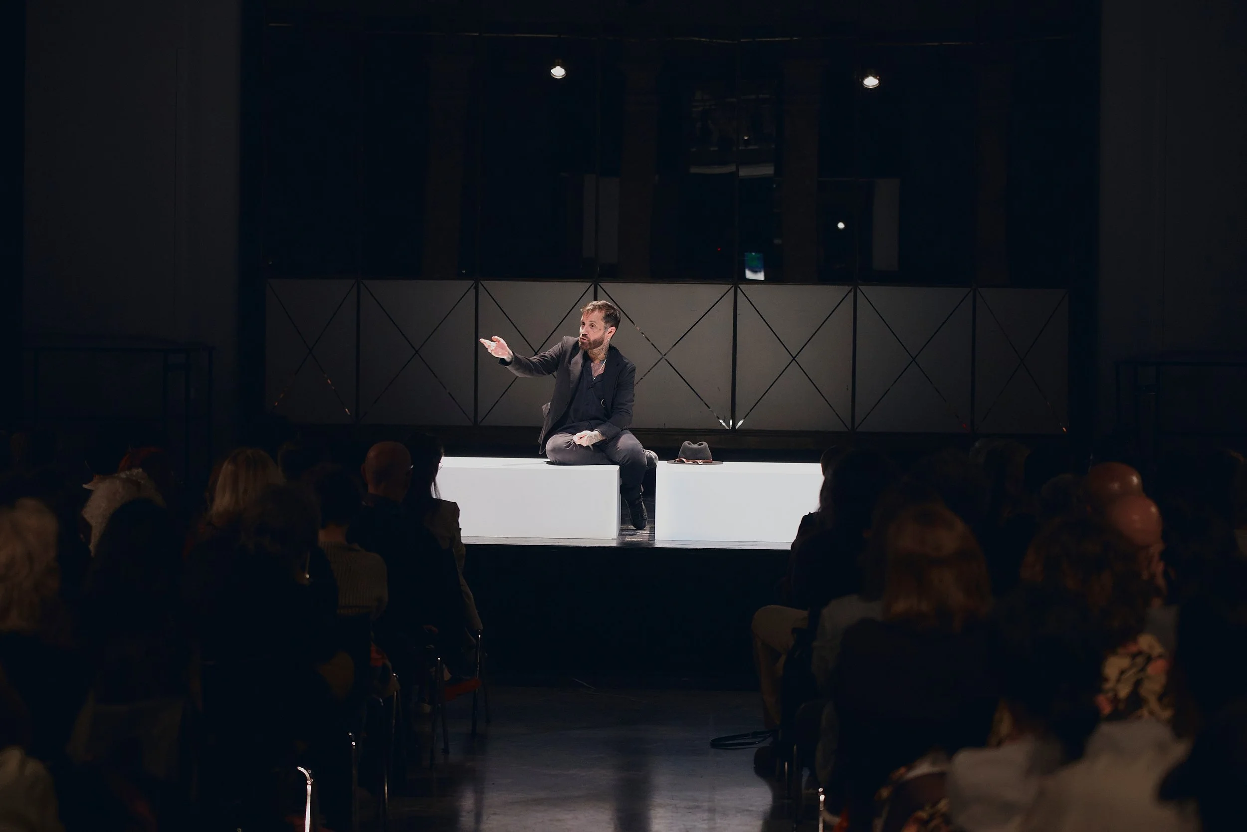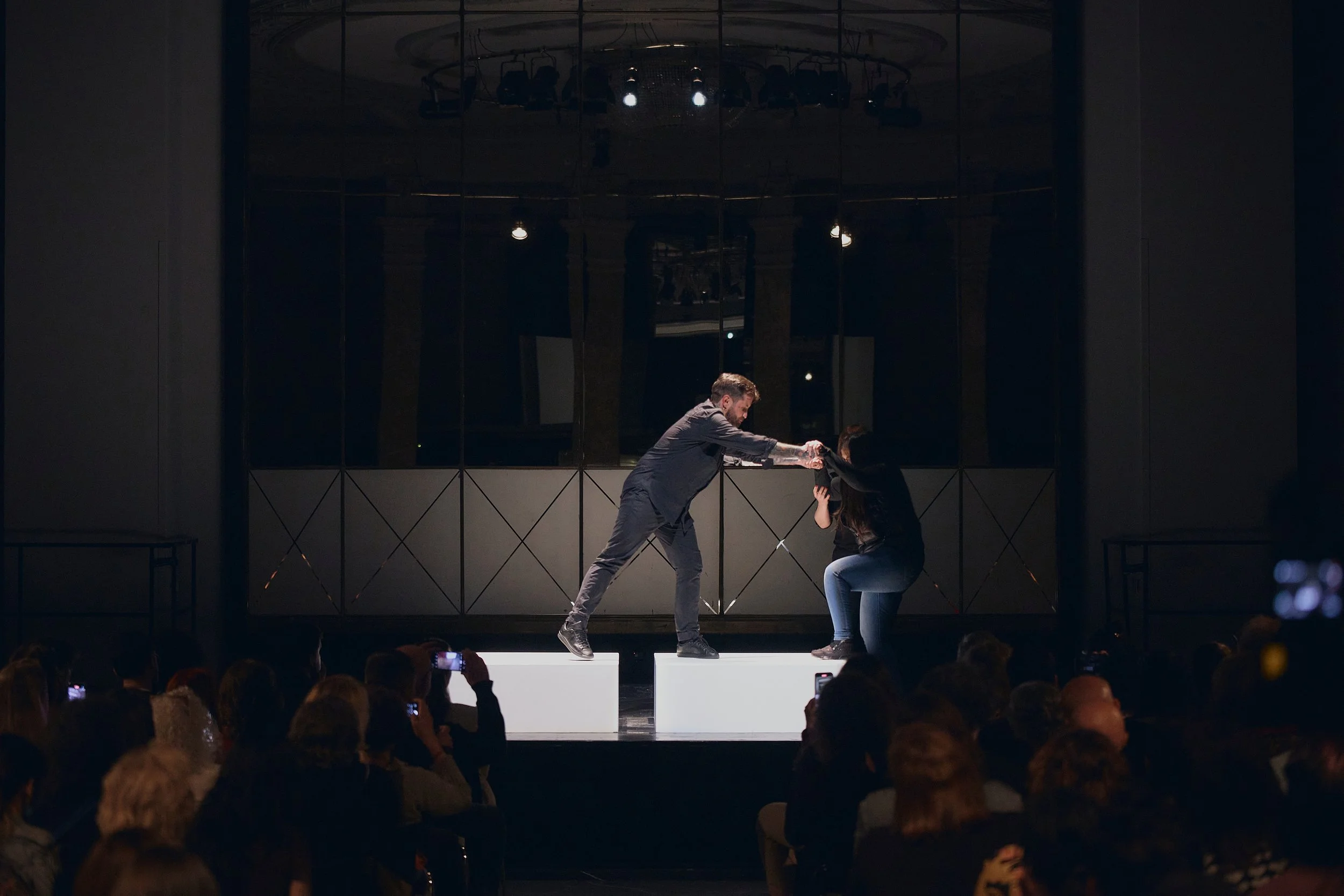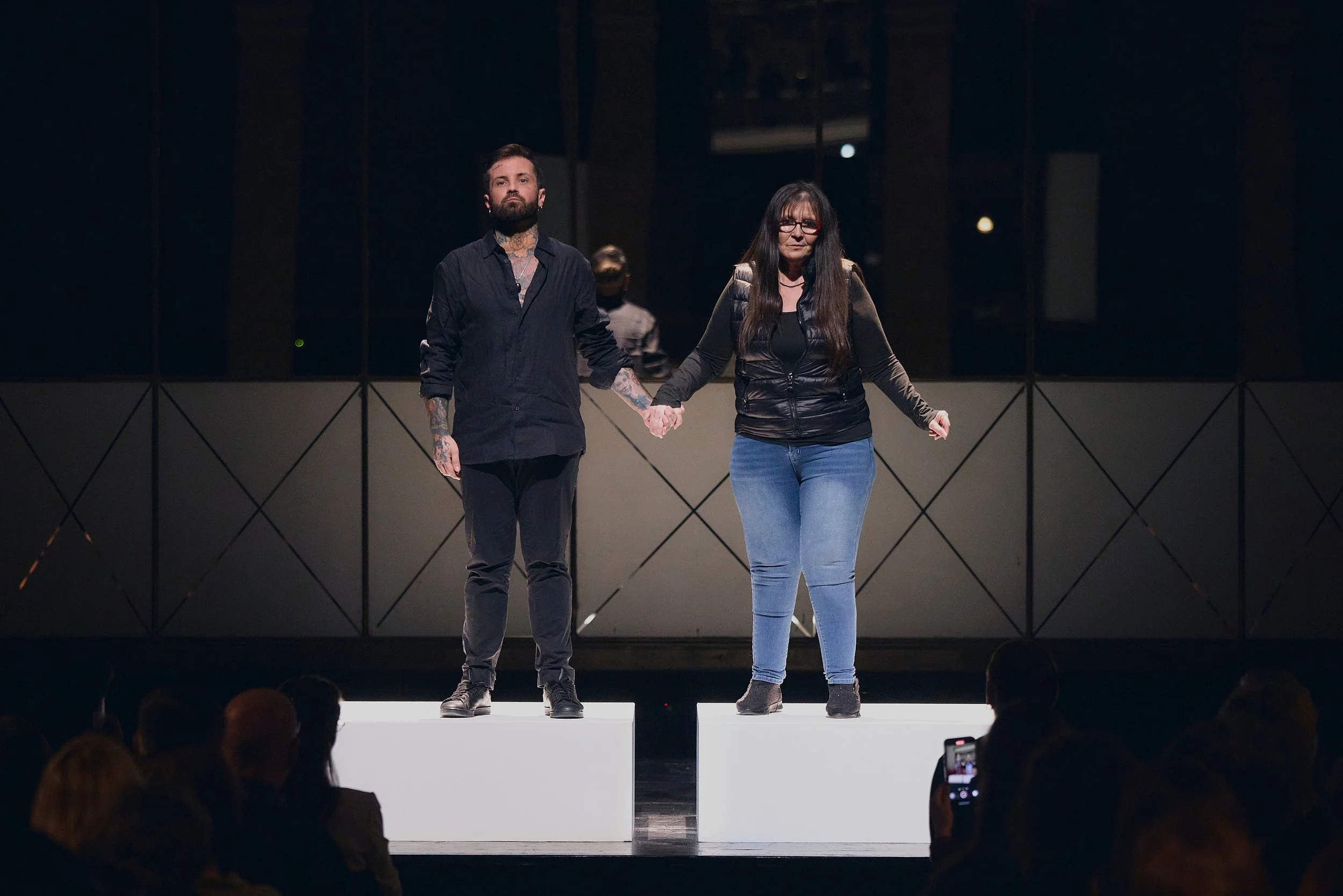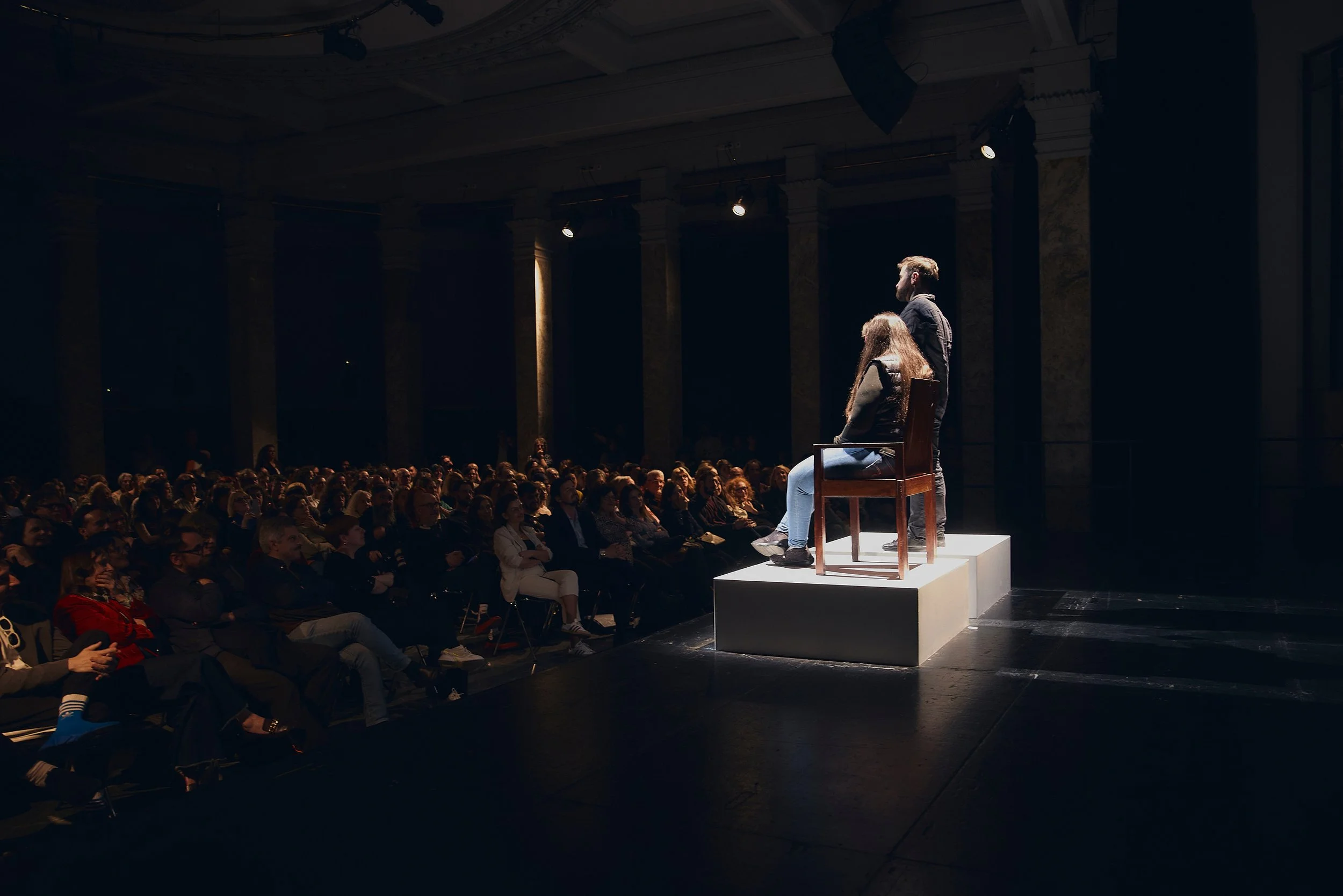After saying a few words to explain their story to the audience, Azcona took off his blazer, rolled up his shirt sleeves, and waited, standing on a pedestal, for Isabel Gómez Aranda to step up onto the one left empty beside him. But the woman who crossed the aisle of the Hall of Columns, hidden behind dark glasses, eyes cast down, trembling, and assisted by the performance curator, Semíramis González, did not look like the same figure who for years had haunted the Spanish creator’s story with her absence. Instead, she appeared as a vulnerable woman, as much as (or even more than) he was, willing to enter the world of her artist son and to trade a private dinner or coffee for a stage full of strangers. And Azcona knew it: “The one who is coming is not the mother who abandoned me, but the mother who came looking for me.” Why meet her in a performance? “I don’t know if I could have done it otherwise. You are here partly to take responsibility as a society for having forced me to be born, and partly so I could feel your company,” the artist said at the end.