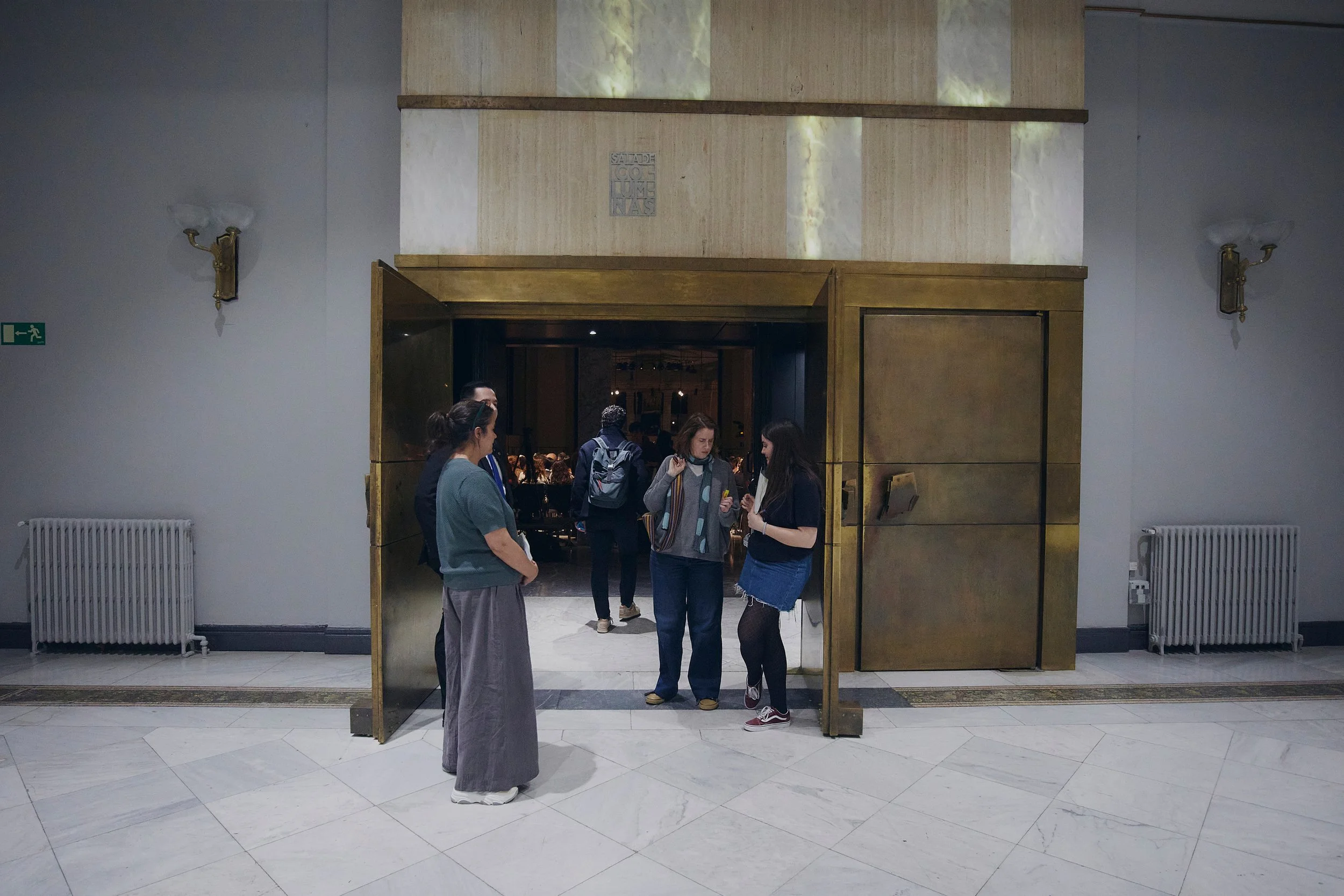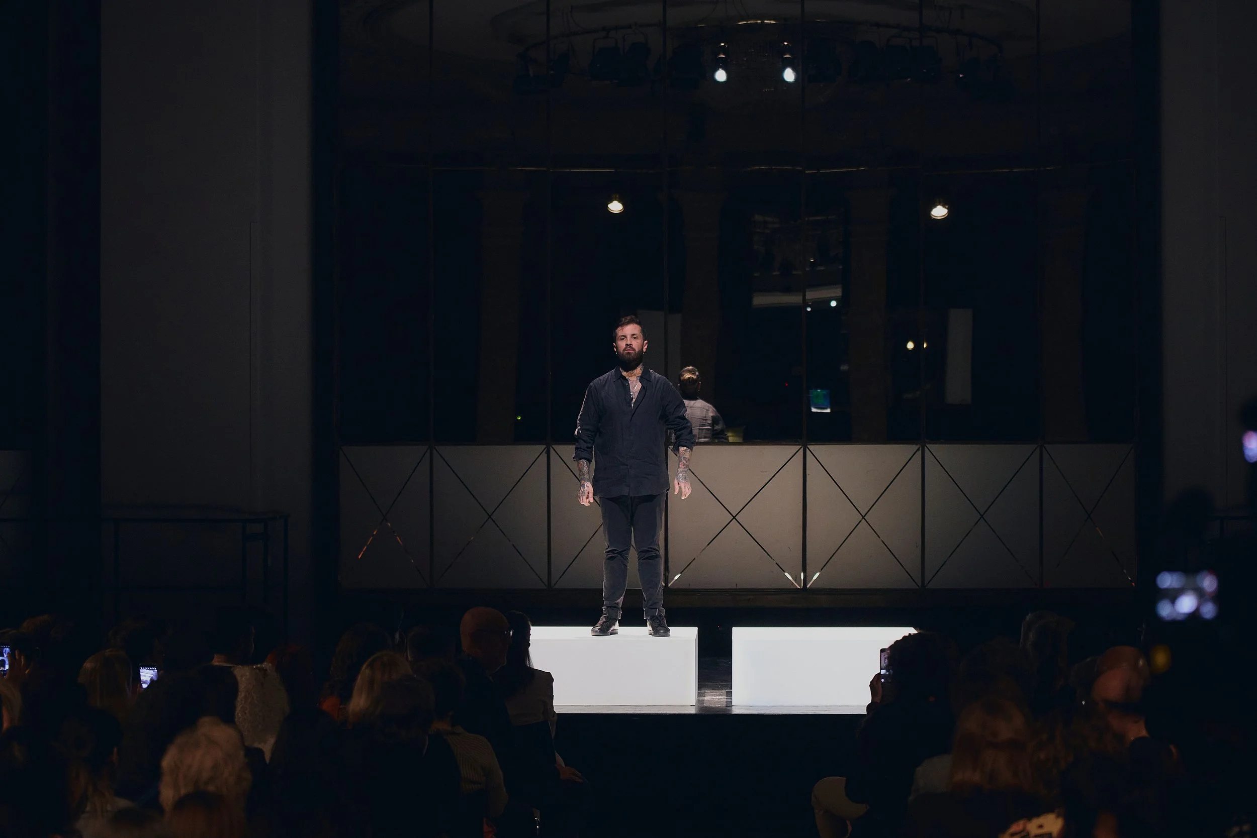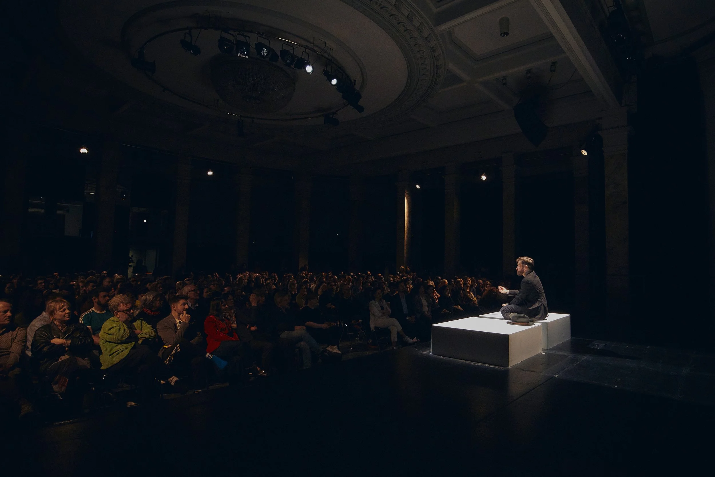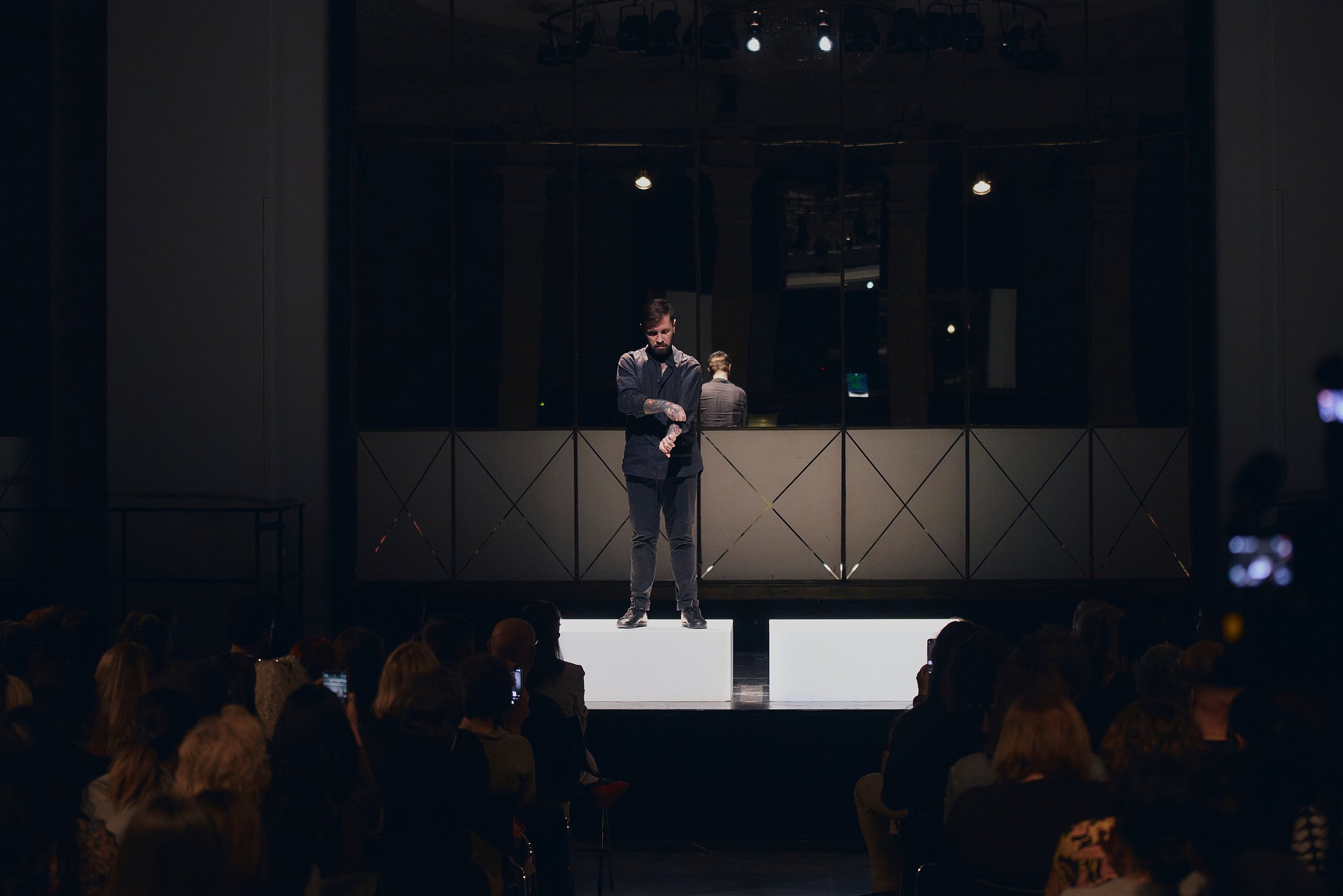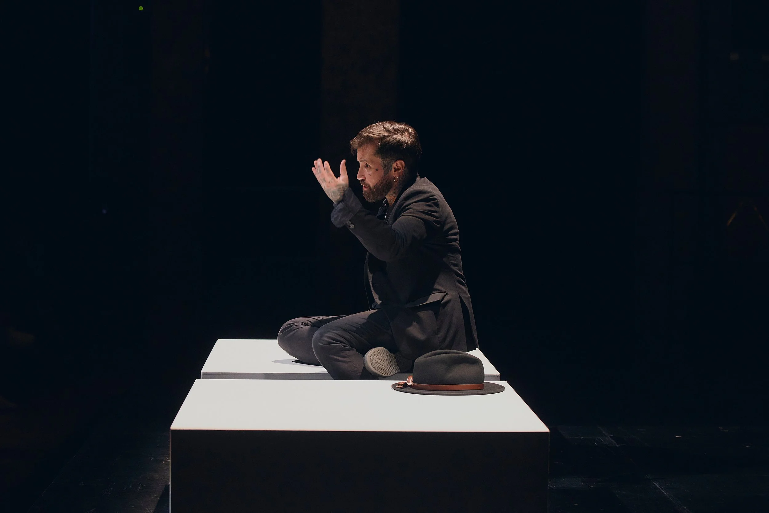 After saying a few words to explain their story to the audience, Azcona took off his blazer, rolled up his shirt sleeves, and waited, standing on a pedestal, for Isabel Gómez Aranda to step up onto the one left empty beside him. But the woman who crossed the aisle of the Hall of Columns, hidden behind dark glasses, eyes cast down, trembling, and assisted by the performance curator, Semíramis González, did not look like the same figure who for years had haunted the Spanish creator’s story with her absence. Instead, she appeared as a vulnerable woman, as much as (or even more than) he was, willing to enter the world of her artist son and to trade a private dinner or coffee for a stage full of strangers. And Azcona knew it: “The one who is coming is not the mother who abandoned me, but the mother who came looking for me.” Why meet her in a performance? “I don’t know if I could have done it otherwise. You are here partly to take responsibility as a society for having forced me to be born, and partly so I could feel your company,” the artist said at the end.