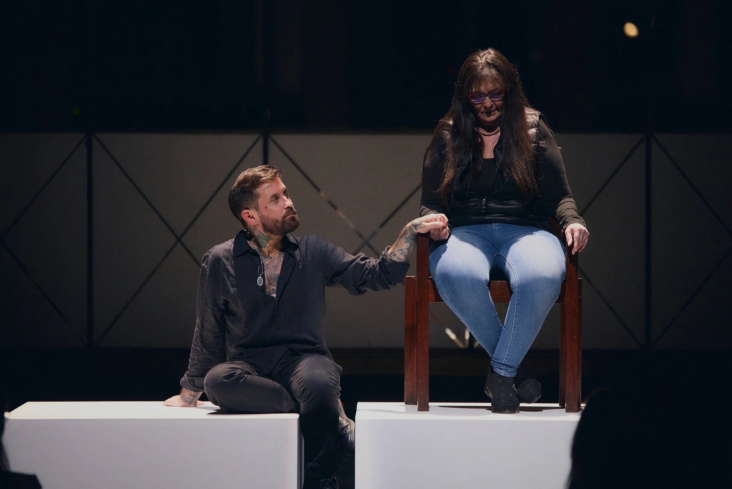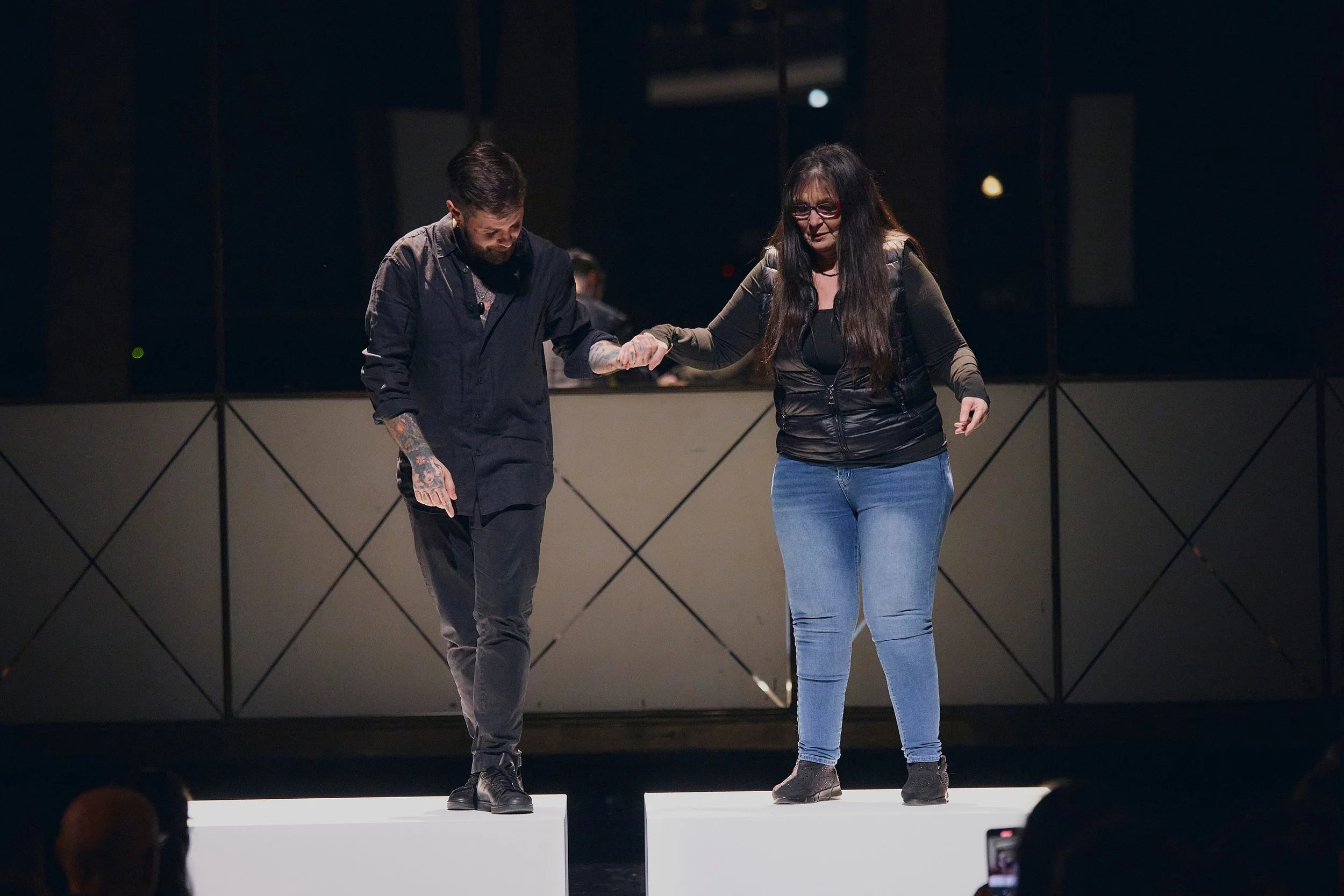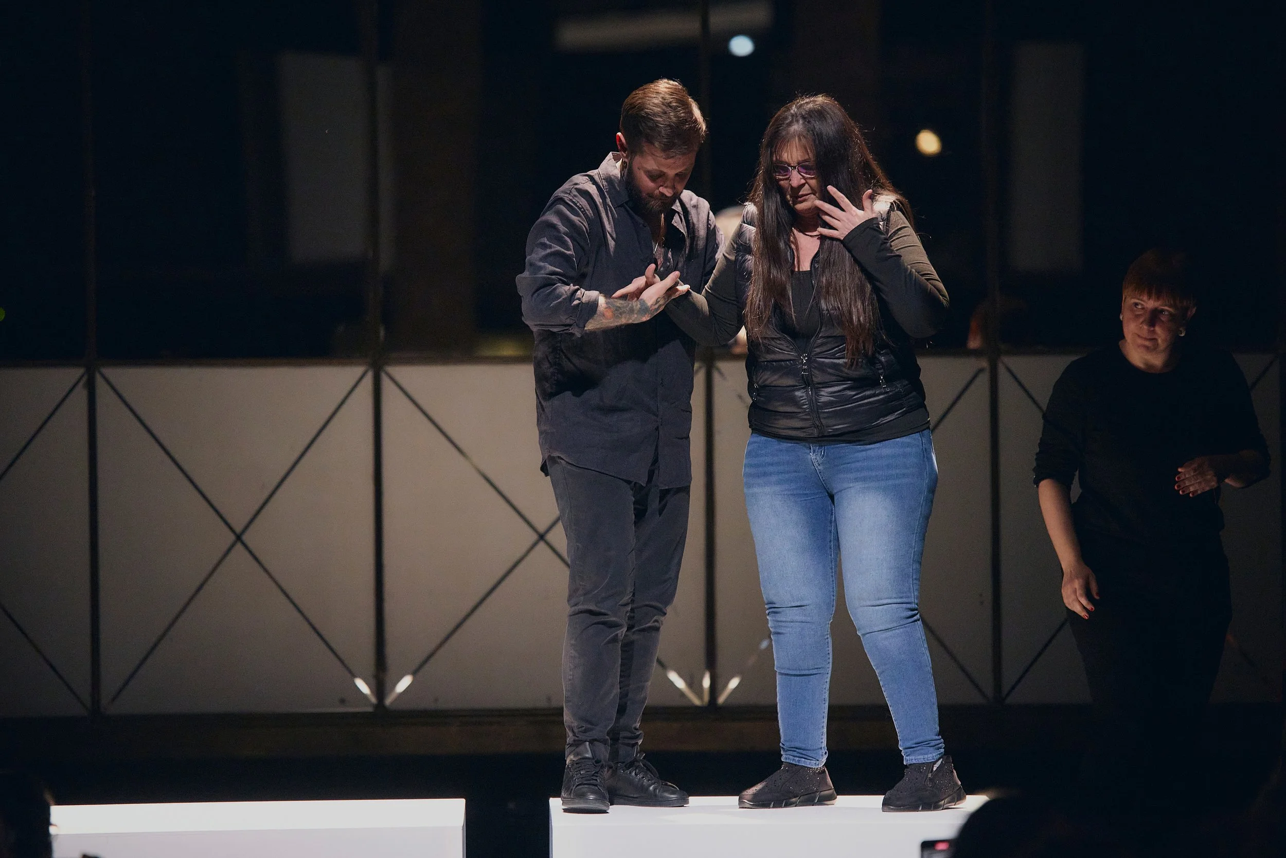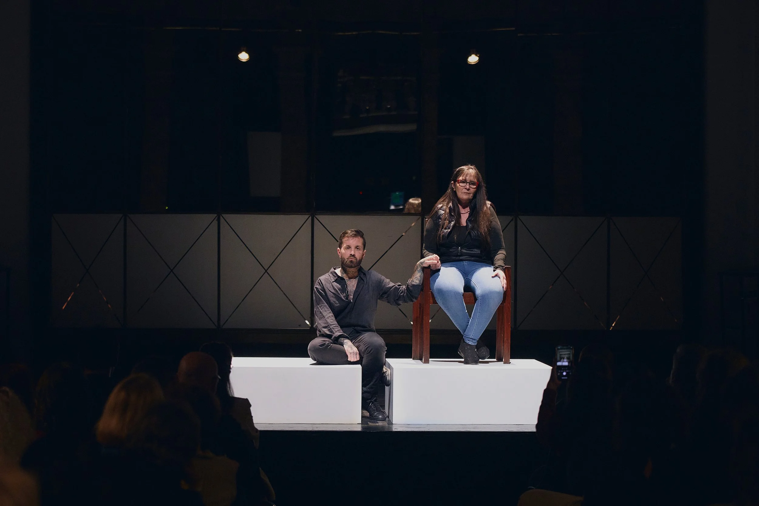 The first physical contact Isabel Gómez Aranda had with her son came when she leaned on his hands to climb onto the platform. Then they shook hands. And that’s how they stayed for an hour —first standing, later sitting— exchanging occasional glances, whispers, a faint laugh. Sixty minutes in which, without seeking anything to happen, nothing happened. Hundreds of people holding the raw, silent vulnerability of two strangers. The nothingness of a conceptual art piece, bound to life and untouched, capable of stirring emotions among the attendees, who broke the silence by blowing their noses.