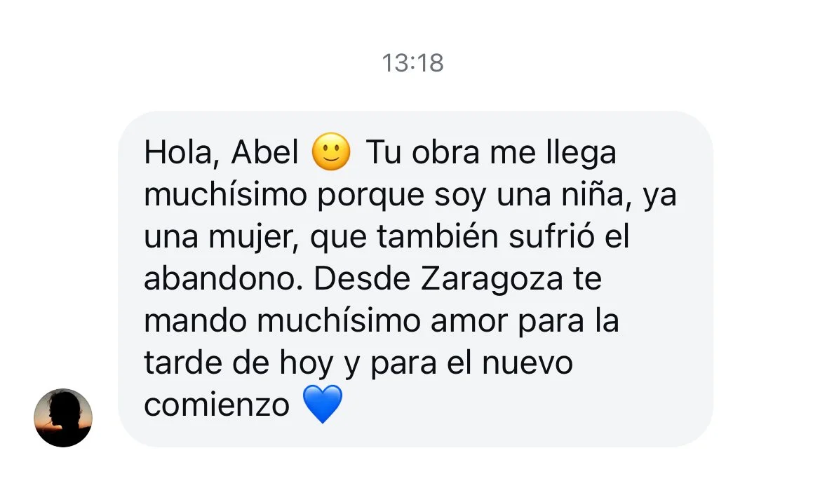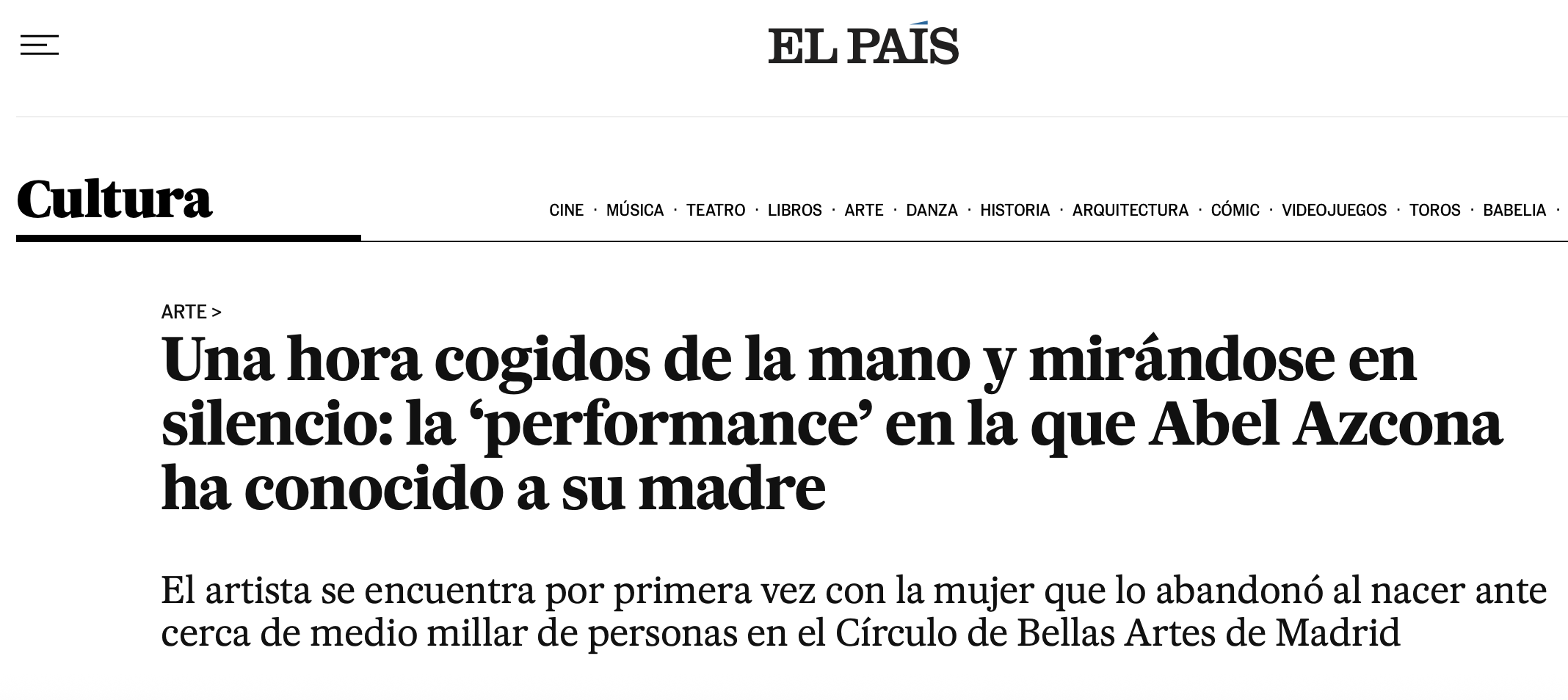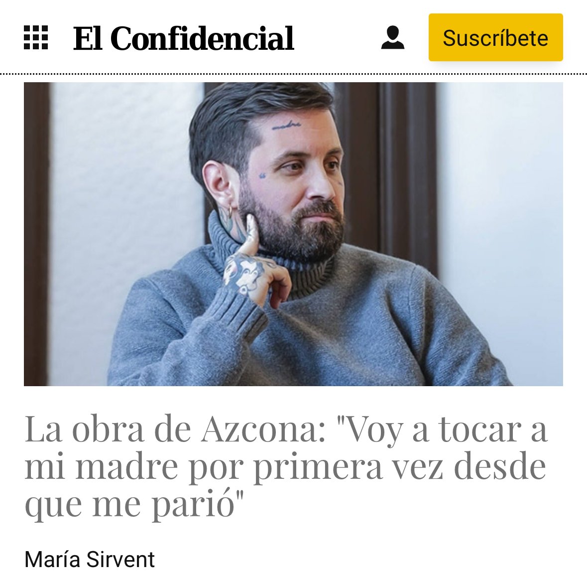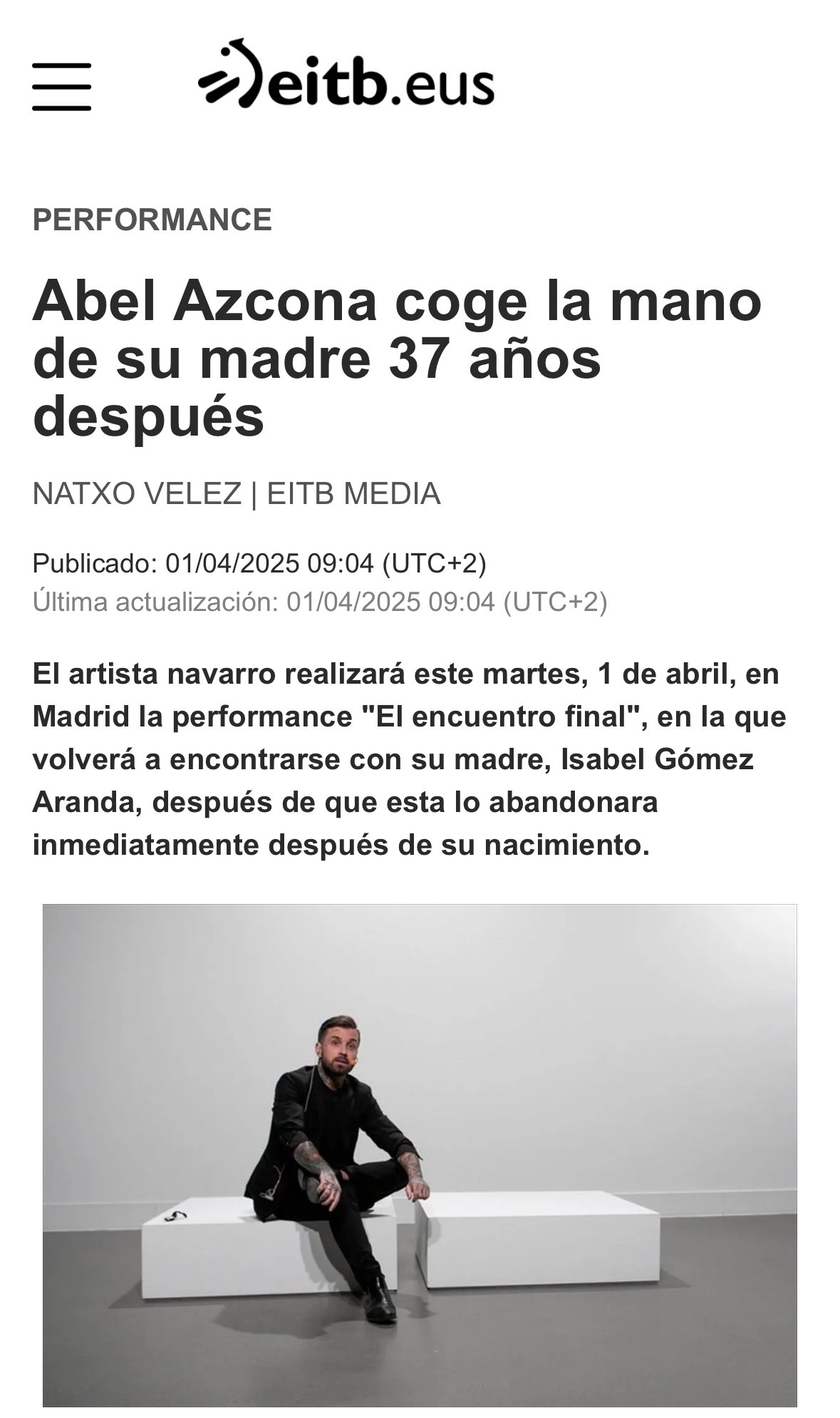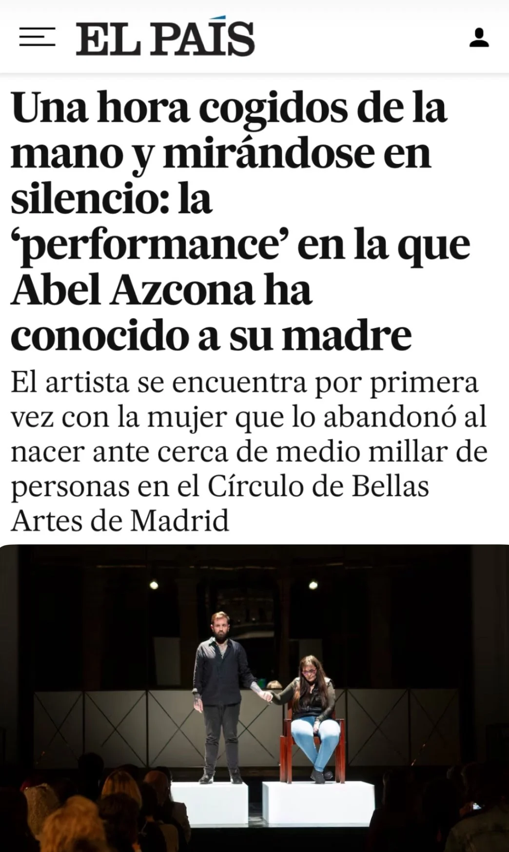 On April 1, 1988, Isabel Gómez Aranda gave birth to Abel Azcona and abandoned him between the Montesa Maternity Hospital—frequented by Carmelite Teresian nuns—and the Niño Jesús Hospital, where the newborn, suffering from withdrawal syndrome, was taken to an incubator. From that day on, mother and son never saw each other in person again. On the night of October 12, 2023, Isabel Gómez Aranda contacted her son for the first time, he having believed a reunion was no longer possible. On April 1, 2025, thirty-seven years after his birth, Isabel and Abel—mother and son—met, saw each other, and held hands for the first time since the delivery. The Círculo de Bellas Artes in Madrid houses one of the artist’s most important works.