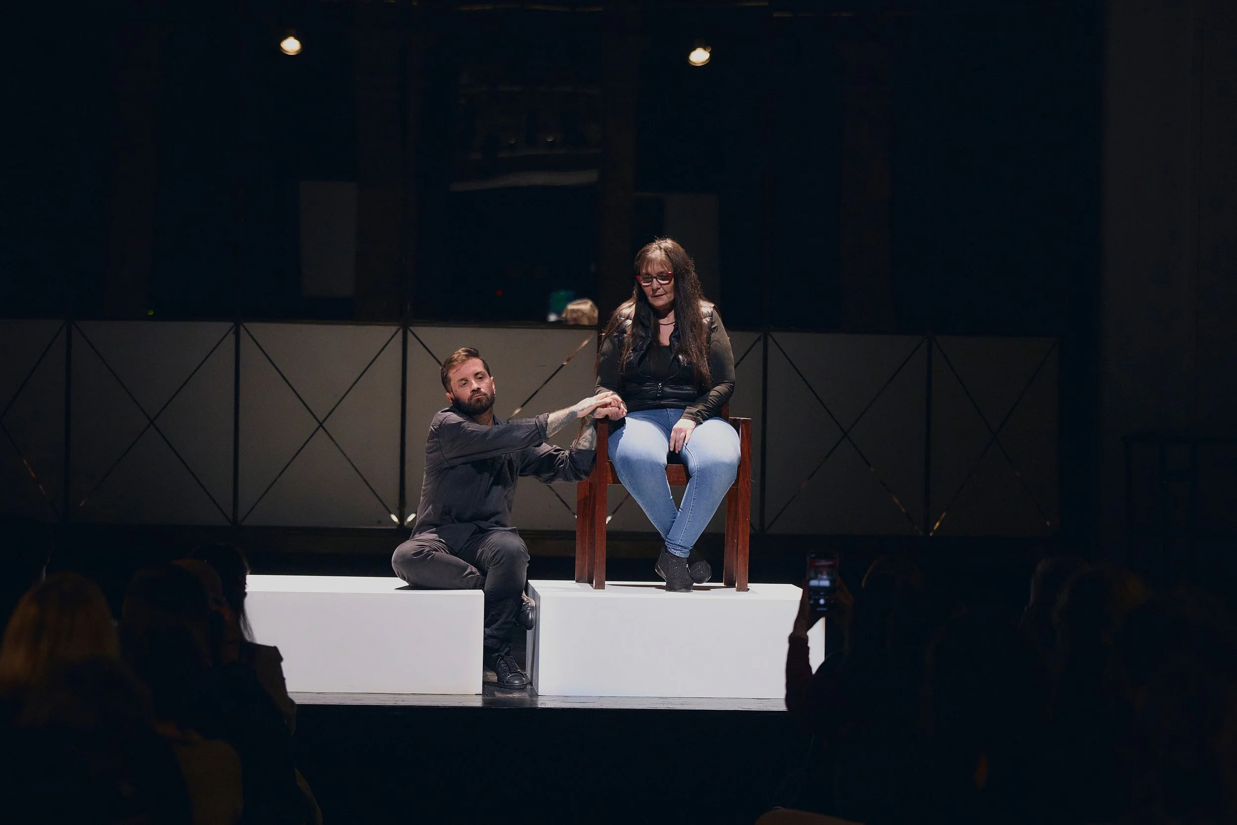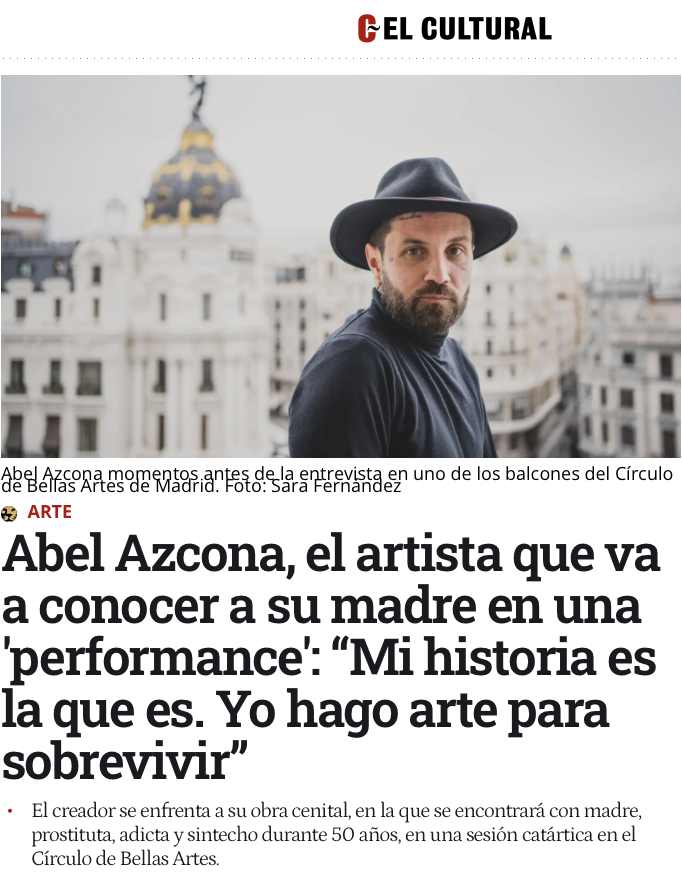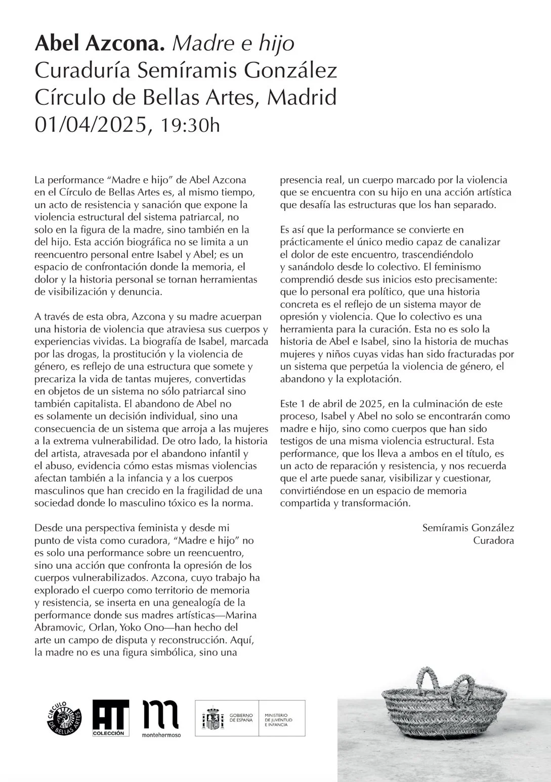 “The performance “Mother and Son” by Abel Azcona at the Círculo de Bellas Artes is, at the same time, an act of resistance and healing that exposes the structural violence of the patriarchal system, not only through the figure of the mother but also through that of the son. This biographical action is not limited to a personal reunion between Isabel and Abel; it is a space of confrontation where memory, pain, and personal history become tools of visibility and denunciation. Through this work, Azcona and his mother embody a story of violence that traverses their bodies and lived experiences. Isabel’s biography—marked by drugs, prostitution, and gender-based violence—is a reflection of a structure that subjugates and precarizes the lives of so many women, turned into objects of a system that is not only patriarchal but also capitalist. Abel’s abandonment is not merely an individual decision, but the consequence of a system that casts women into extreme vulnerability. On the other hand, the artist’s story, marked by childhood abandonment and abuse, shows how these same forms of violence also affect childhood and male bodies that have grown up in the fragility of a society where toxic masculinity is the norm. From a feminist perspective and from my point of view as a curator, *Mother and Son* is not just a performance about a reunion, but an action that confronts the oppression of vulnerable bodies. Azcona, whose work has explored the body as a territory of memory and resistance, inserts himself into a genealogy of performance art where his artistic mothers—Marina Abramović, Orlan, Yoko Ono—have made art a field of dispute and reconstruction. Here, the mother is not a symbolic figure, but a real presence—a body marked by violence—that meets her son in an artistic action that challenges the structures that have separated them.”
