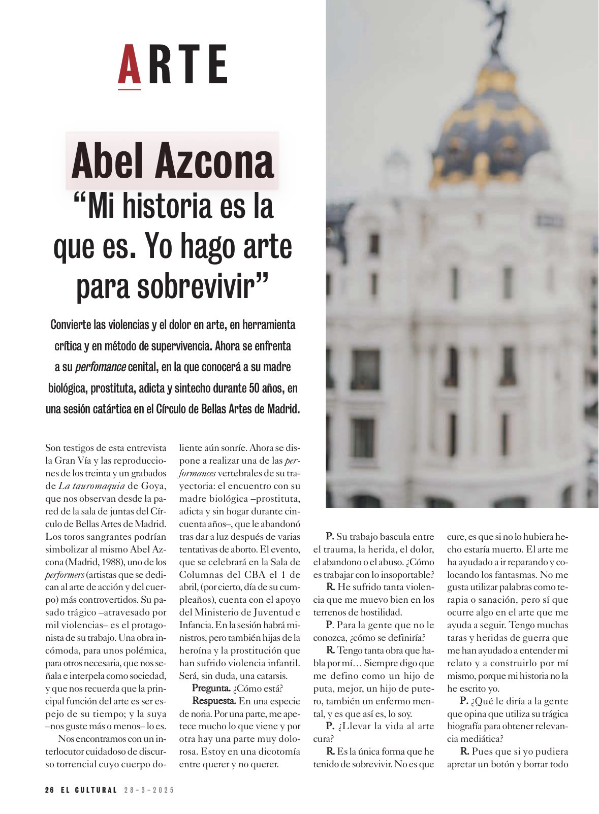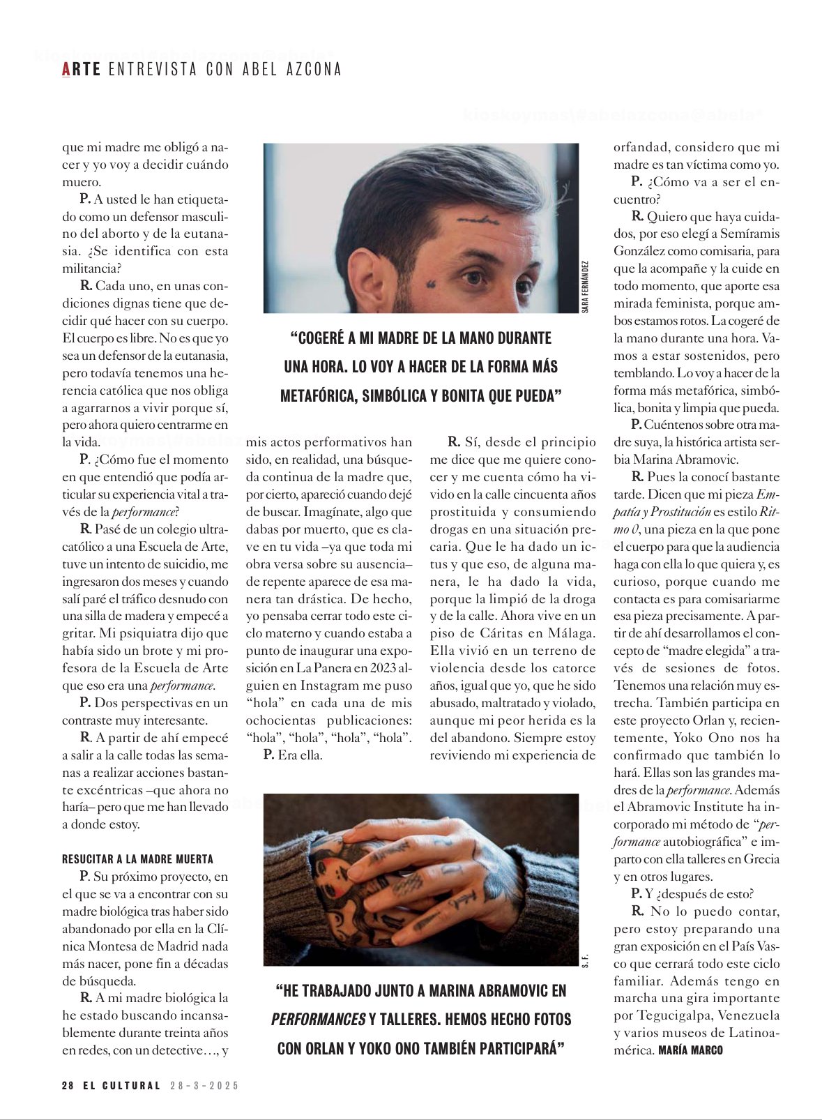 El 1 de abril realizará la 'performance' más importante de su trayectoria, en la que se reencontrará con su madre biológica. Ella lo abandonó recién nacido, cuando era prostituta y drogadicta. Una sala, dos peanas, una madre y un hijo de la mano. Sesenta minutos. Seiscientas personas en silencio. Ya está. Abel Azcona se despoja de cualquier ornamentación superficial y nos enfrenta a los elementos más crudos de la experiencia humana en un acto de vulnerabilidad radical. Esos dos cuerpos ahí puestos, resistiendo, diciendo, recordando. “A lo mejor una silla”, me dice Abel, por si la madre necesita sentarse en algún momento. Ese gesto. Esa gente. Esa madre ahí.