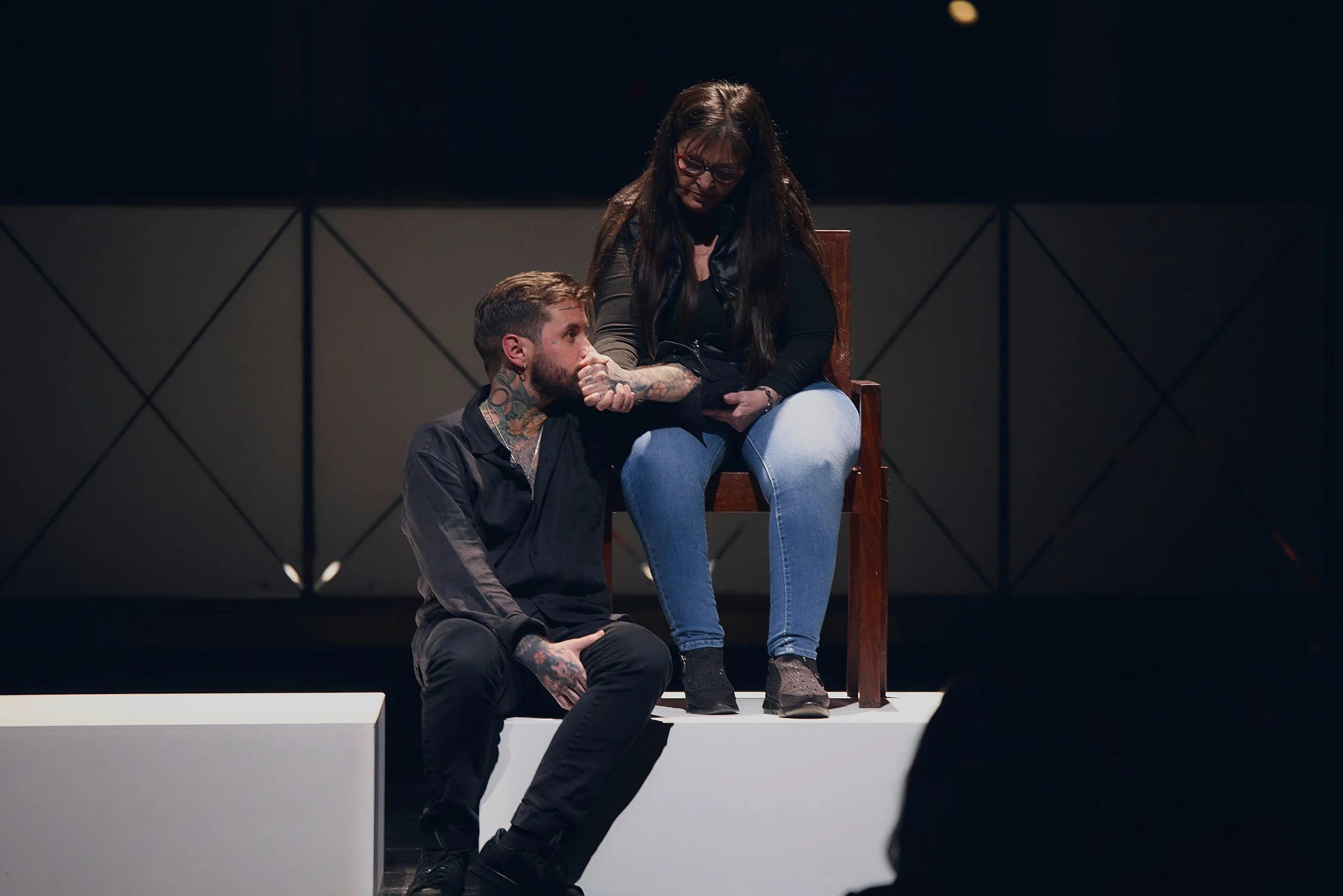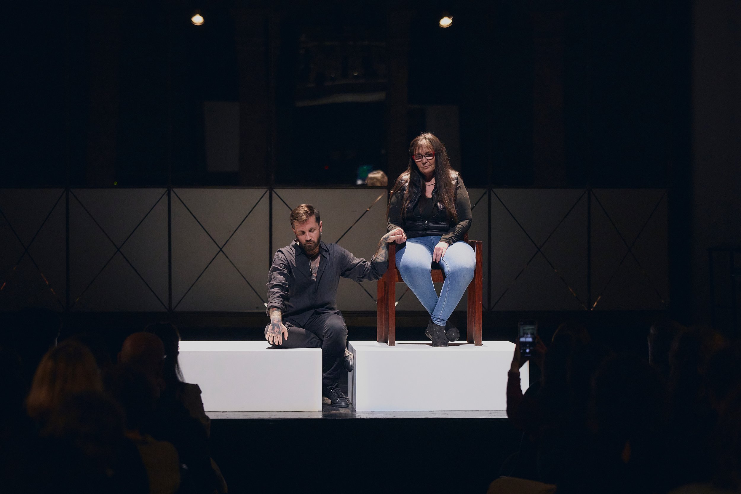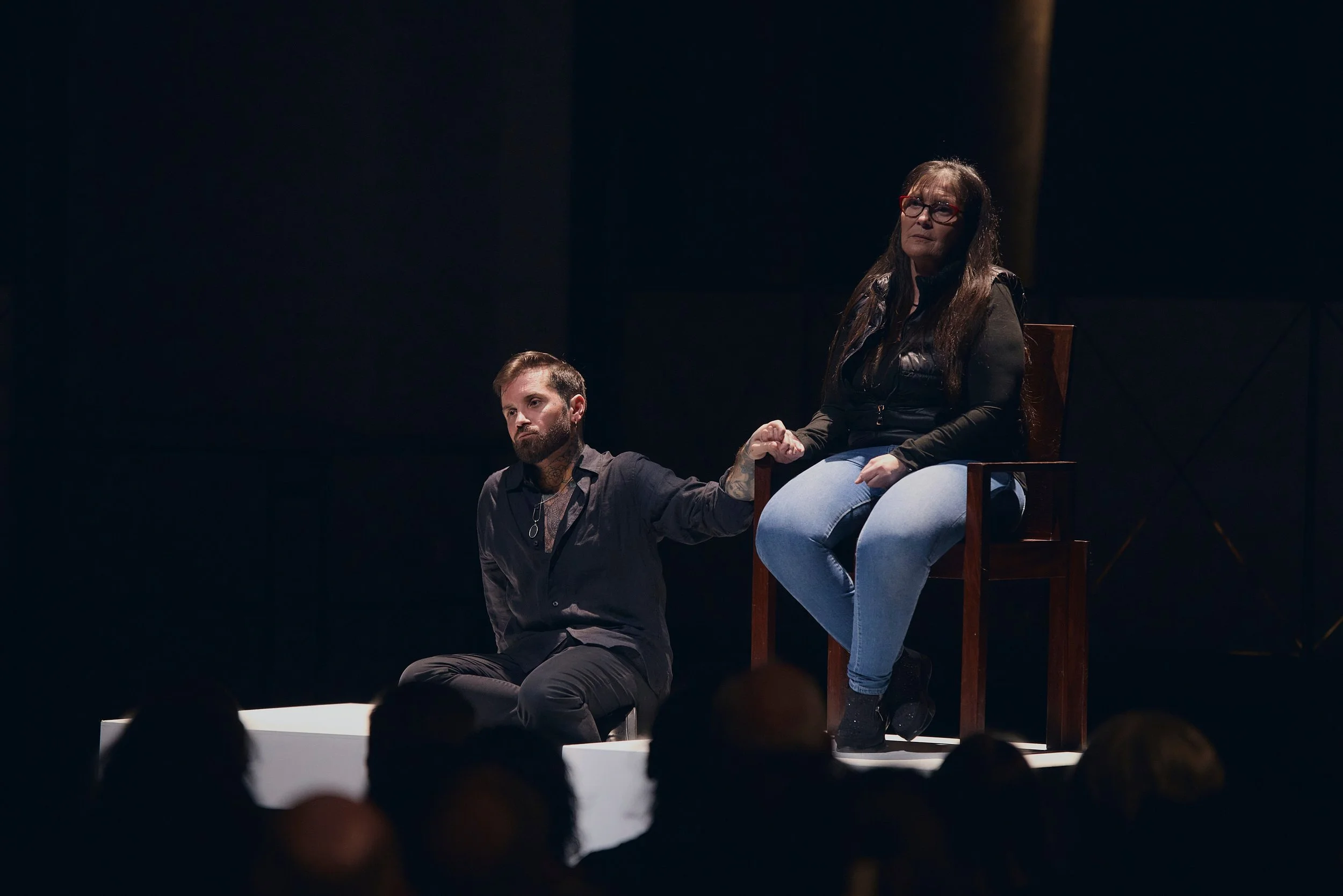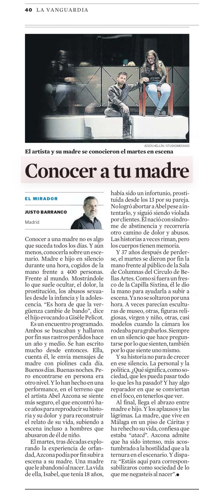 Madre e hijo se dan la mano treinta y siete años después. Se siente el silencio activo de los asistentes. Las personalidades de la cultura, sentadas en las primeras filas, quizá sean las que más llamen la atención de los medios, pero no son las más importantes. La sala está llena de las seguidoras fieles del artista, con las que lleva años compartiendo historias de abandono y violencia, que han viajado desde lejos para participar en esta comunión de cuerpos. Cuerpos que enmudecen de asombro y emoción. Se mantiene la respiración hasta el abrazo final de madre e hijo, un abrazo que rompe el silencio en aplausos.