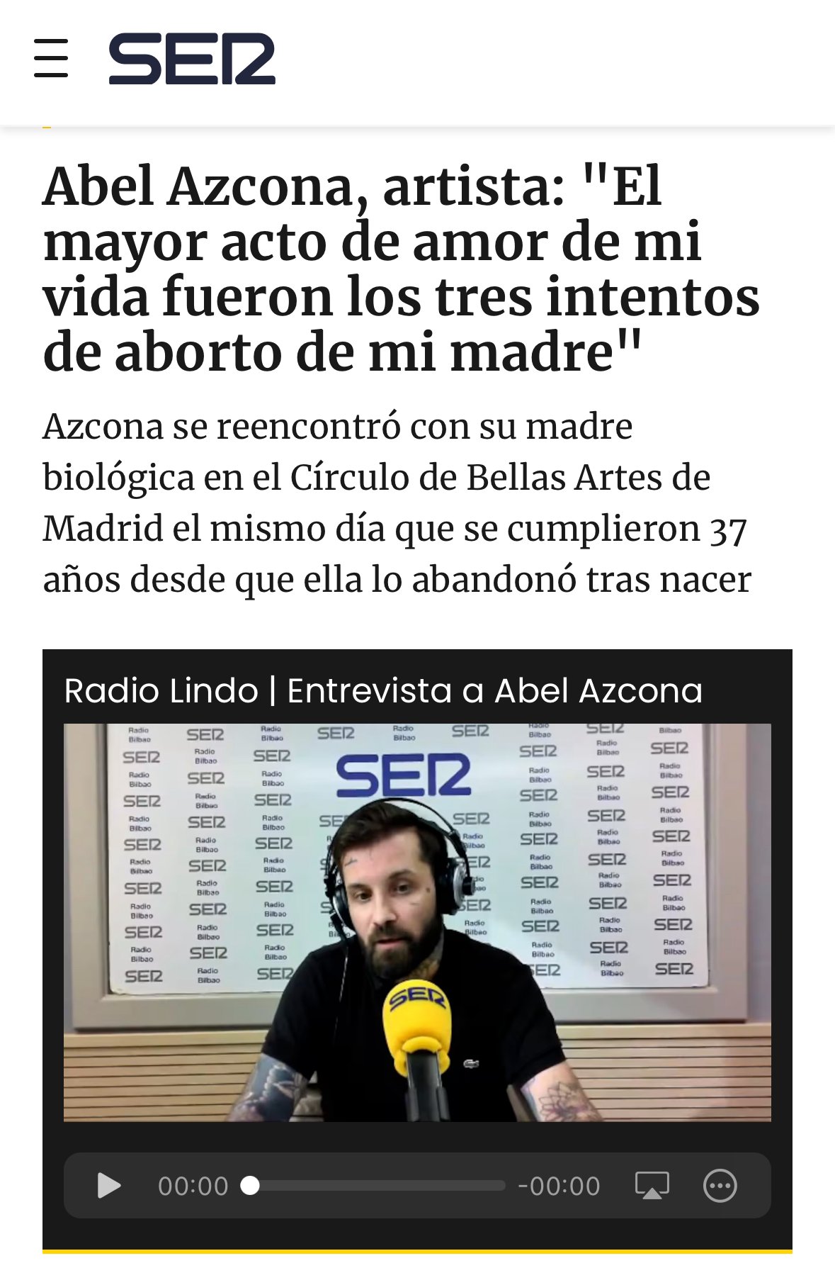 El mismo 1 de abril de 1988, Isabel Gómez Aranda parió y abandonó a Abel Azcona entre la Maternidad de Montesa frecuentada por monjas Carmelitas Teresianas y el Hospital Niño Jesús donde trasladaron al recién nacido con síndrome de abstinencia a una incubadora. Desde ese día, madre e hijo nunca volvieron a verse en persona. La noche del 12 de octubre de 2023 Isabel Gómez Aranda contacta con su hijo por primera vez, creyendo este ya imposible el reencuentro. El 1 de abril de 2025, treinta y siete años después del nacimiento, Isabel y Abel, madre e hijo se encuentran, ven y dan la mano por primera vez desde el parto. El Círculo de Bellas Artes de Madrid alberga una de las obras más importantes del artista.