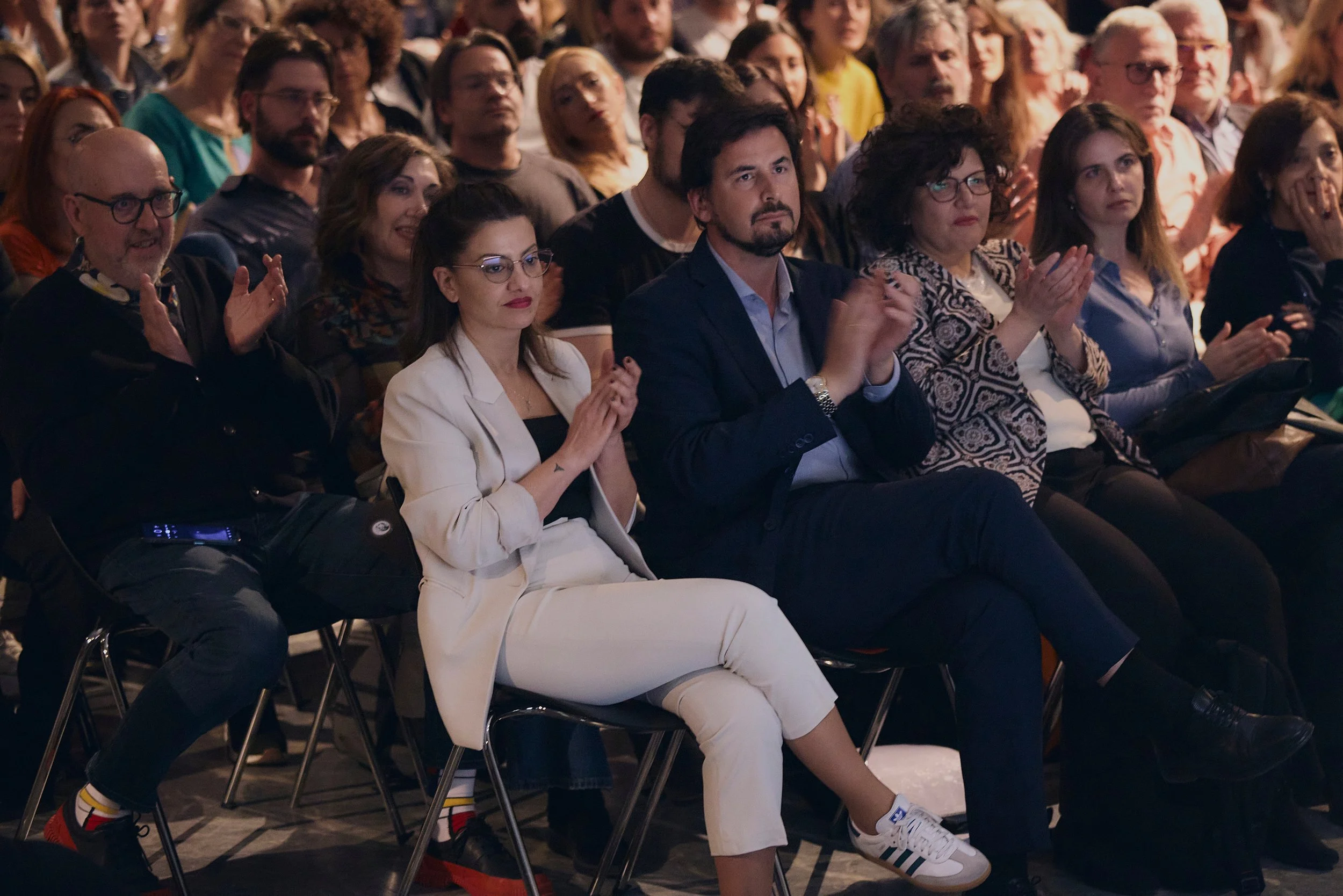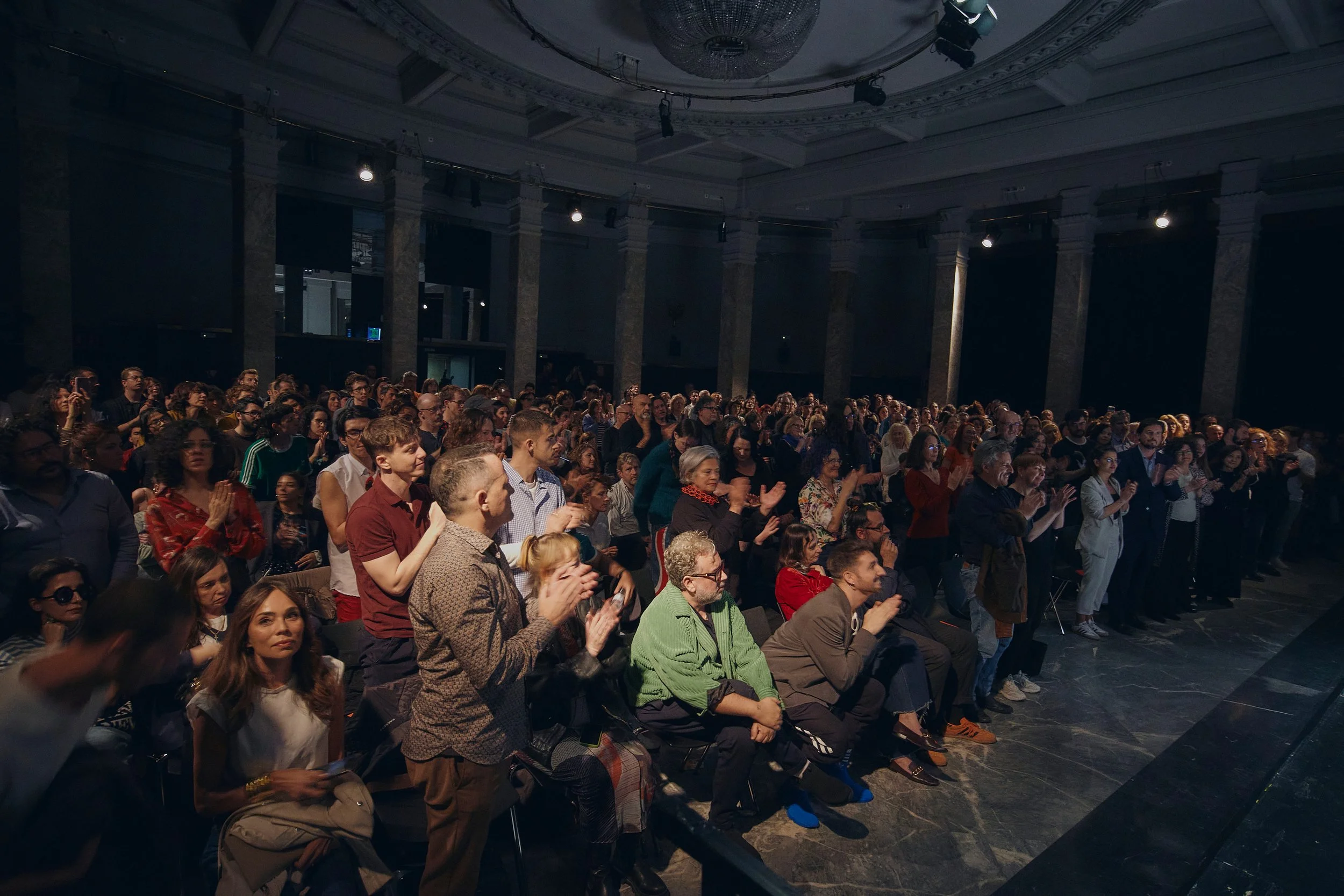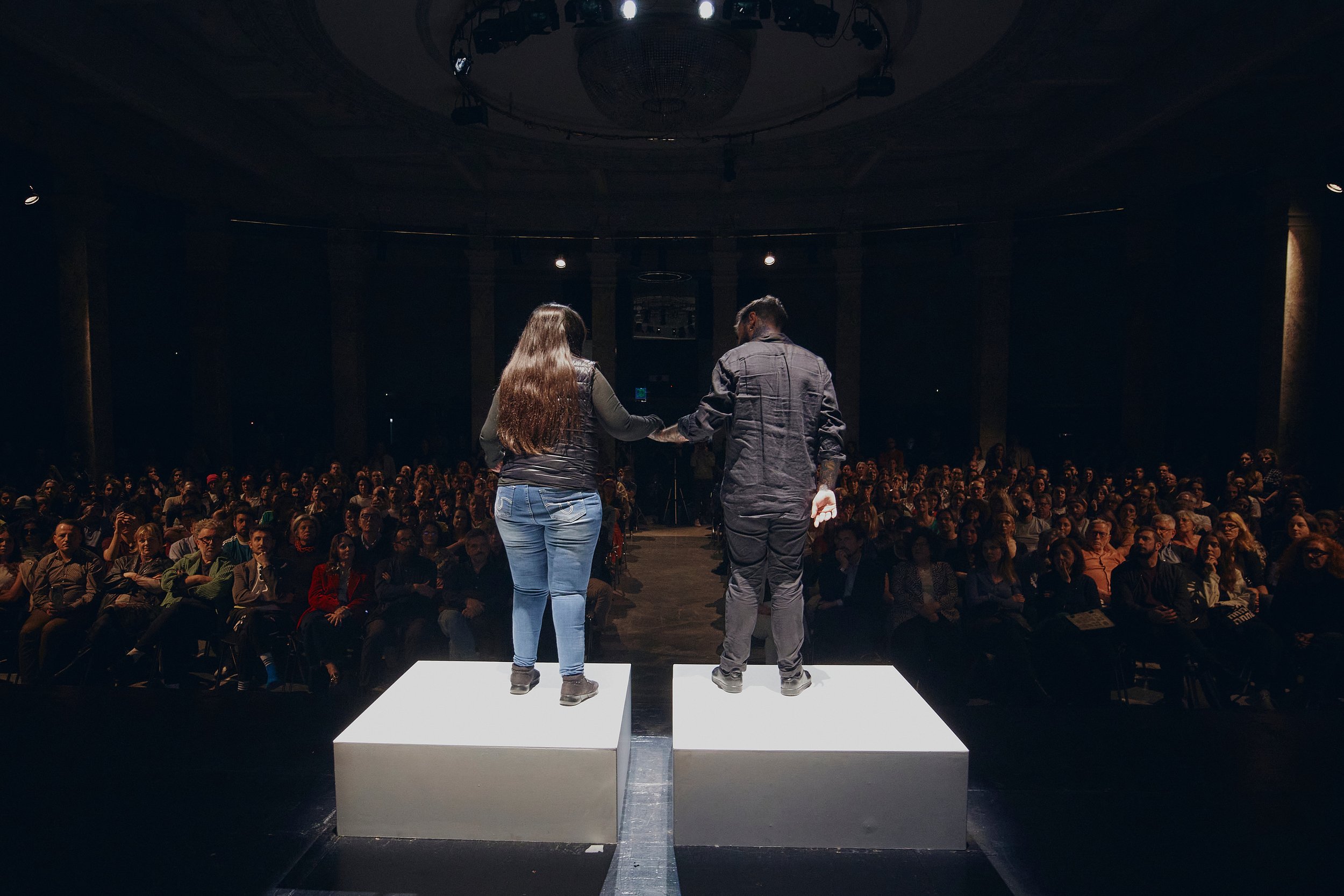 After the performance, with more than five hundred people standing, the piece ended with the first embrace between them. The first of many. / Tras la performance y con las más de quinientas personas en pie la obra se cerró con el primer abrazo entre ambos. El primero de muchos.
