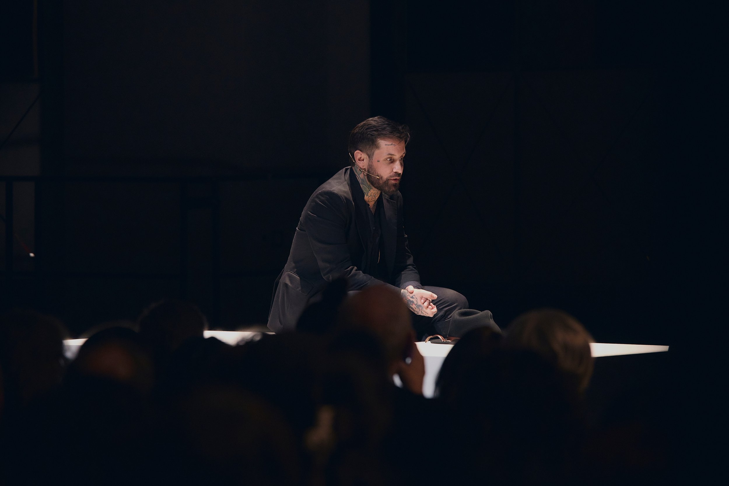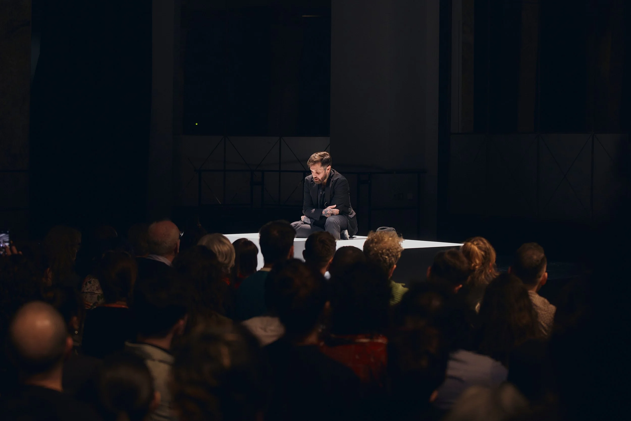 Mother and son hold hands thirty-seven years later. The active silence of the attendees can be felt. Cultural figures, seated in the front rows, may be those who most draw the media’s attention, but they are not the most important. The room is filled with the artist’s loyal followers, with whom he has shared stories of abandonment and violence for years, and who have traveled from afar to take part in this communion of bodies. Bodies struck dumb with awe and emotion. Breath is held until the final embrace of mother and son—an embrace that breaks the silence into applause.