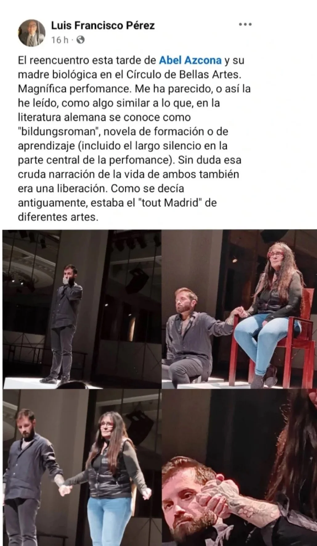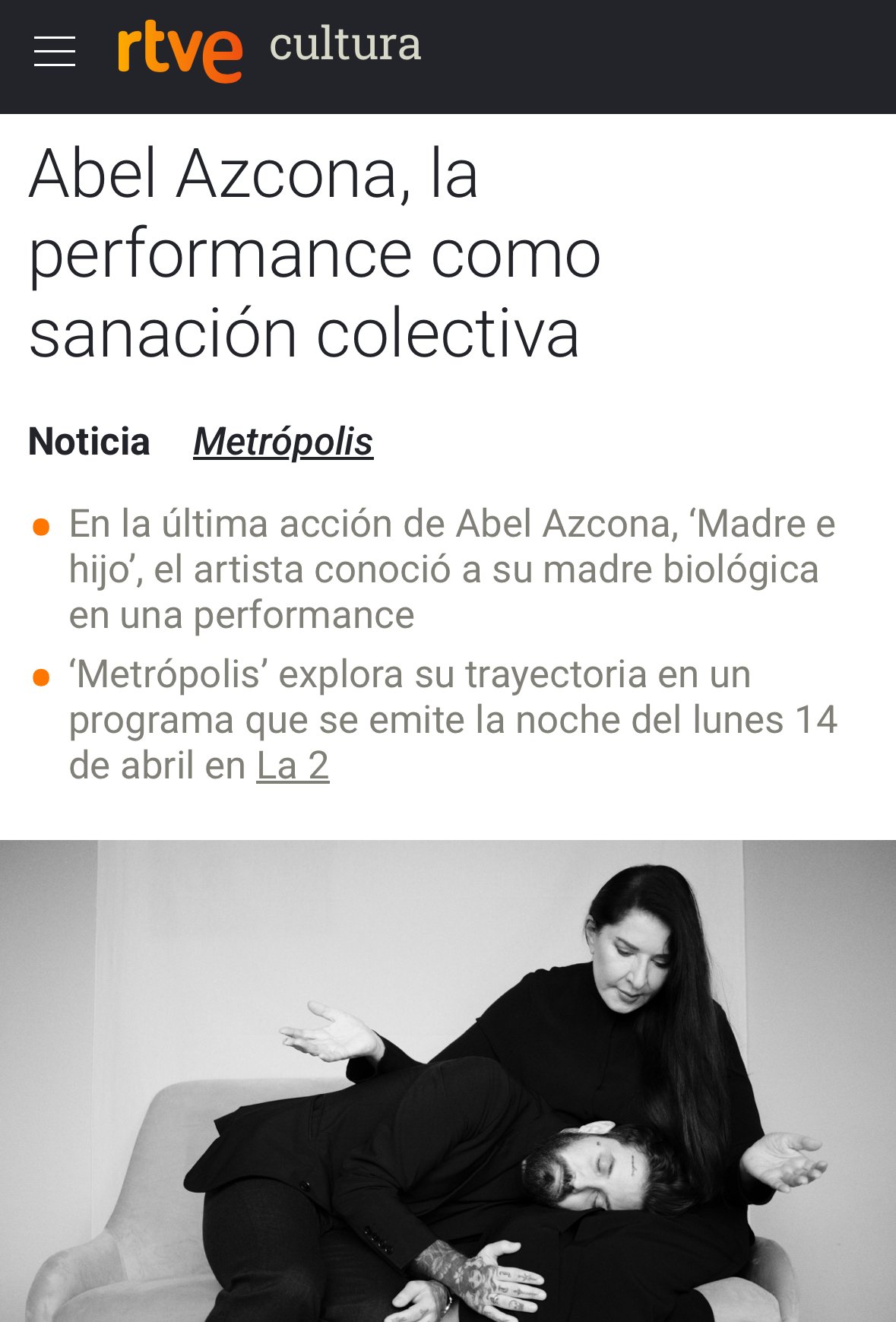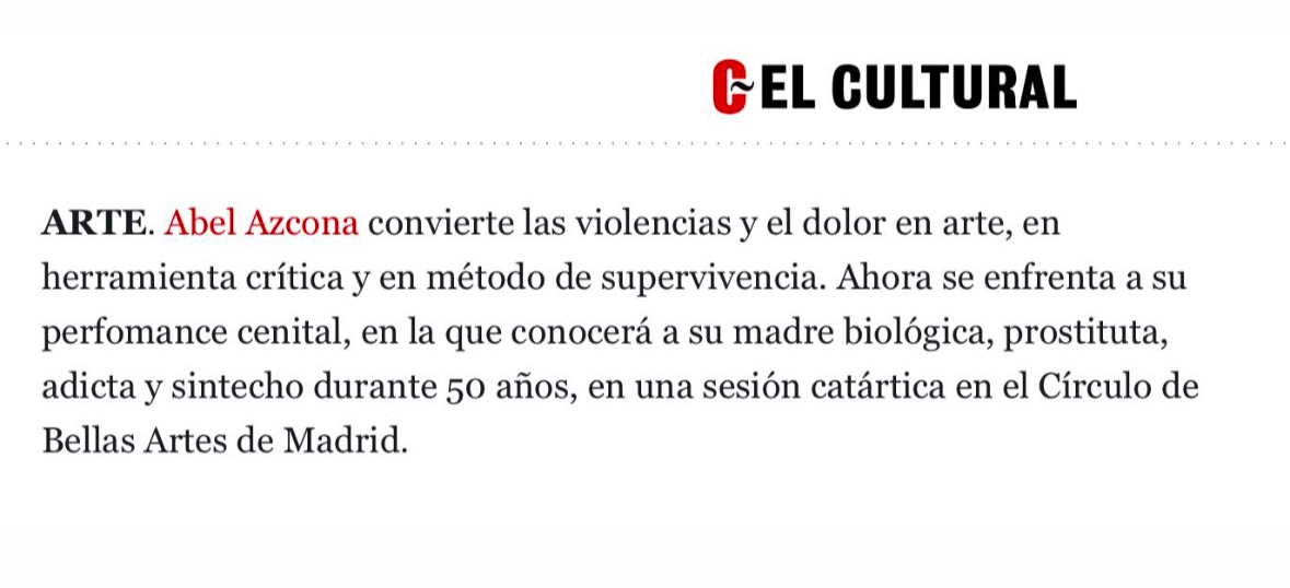 “La performance “Madre e hijo” de Abel Azcona en el Círculo de Bellas Artes es, al mismo tiempo, un acto de resistencia y sanación que expone la violencia estructural del sistema patriarcal, no solo en la figura de la madre, sino también en la del hijo. Esta acción biográfica no se limita a un reencuentro personal entre Isabel y Abel; es un espacio de confrontación donde la memoria, el dolor y la historia personal se tornan herramientas de visibilización y denuncia. A través de esta obra, Azcona y su madre acuerpan una historia de violencia que atraviesa sus cuerpos y experiencias vividas. La biografía de Isabel, marcada por las drogas, la prostitución y la violencia de género, es reflejo de una estructura que somete y precariza la vida de tantas mujeres, convertidas en objetos de un sistema no sólo patriarcal sino también capitalista. El abandono de Abel no es solamente un decisión individual, sino una consecuencia de un sistema que arroja a las mujeres a la extrema vulnerabilidad. De otro lado, la historia del artista, atravesada por el abandono infantil y el abuso, evidencia cómo estas mismas violencias afectan también a la infancia y a los cuerpos masculinos que han crecido en la fragilidad de una sociedad donde lo masculino tóxico es la norma. Desde una perspectiva feminista y desde mi punto de vista como curadora, “Madre e hijo” no es solo una performance sobre un reencuentro, sino una acción que confronta la opresión de los cuerpos vulnerabilizados. Azcona, cuyo trabajo ha explorado el cuerpo como territorio de memoria y resistencia, se inserta en una genealogía de la performance donde sus madres artísticas—Marina Abramović, Orlan, Yoko Ono—han hecho del arte un campo de disputa y reconstrucción. Aquí, la madre no es una figura simbólica, sino una presencia real, un cuerpo marcado por la violencia que se encuentra con su hijo en una acción artística que desafía las estructuras que los han separado.”