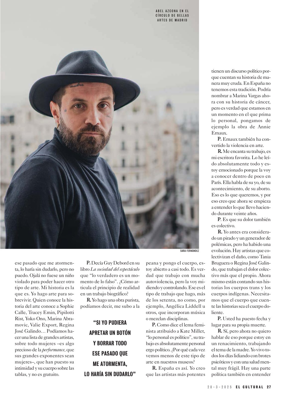 Puede decirse que la vida de Abel Azcona tiene dos fechas trascendentales. La primera fue el 1 de abril de 1988, cuando nació y su madre, que entonces tenía 18, era heroinómana y se prostituía, lo abandonó después de haber intentado abortar tres veces —Azcona suele decir que ahí murió la persona y nació el artista—. La segunda fue el 1 de abril de 2025, 37 años después de aquello, cuando se reencontró cara a cara por primera vez con su progenitora. Ocurrió en una performance en el Círculo de Bellas Artes de Madrid delante de 400 personas. Su título: Madre e hijo.