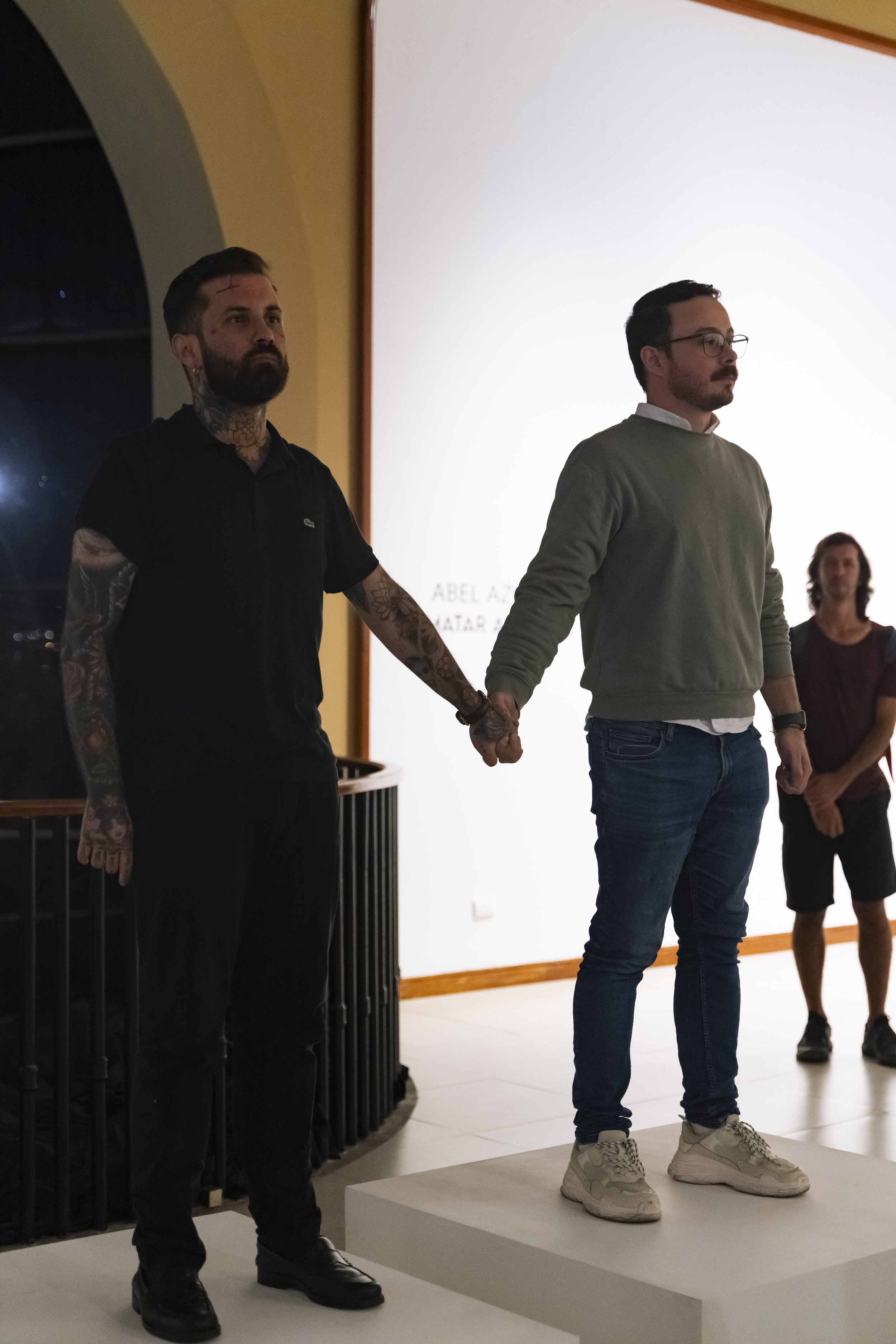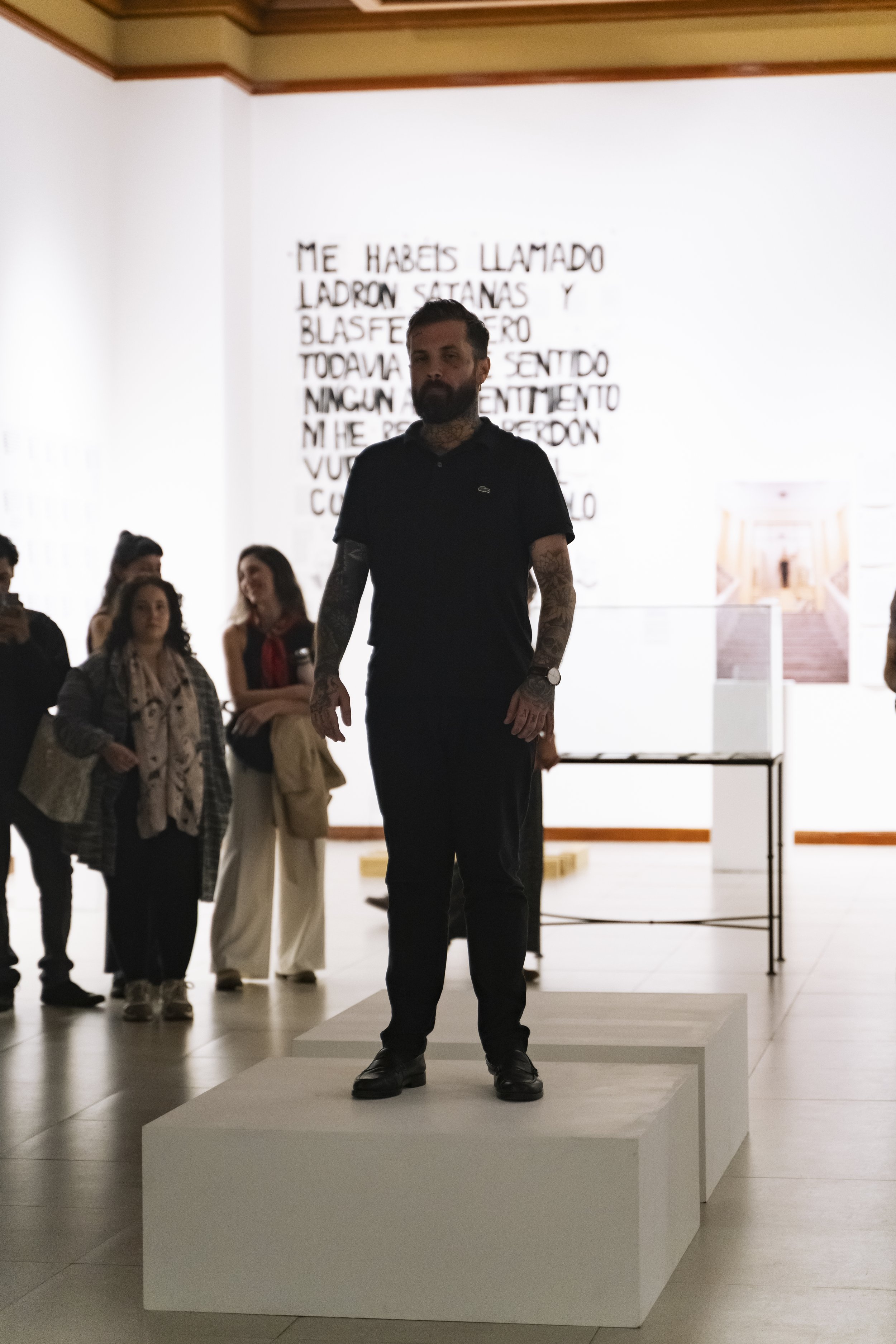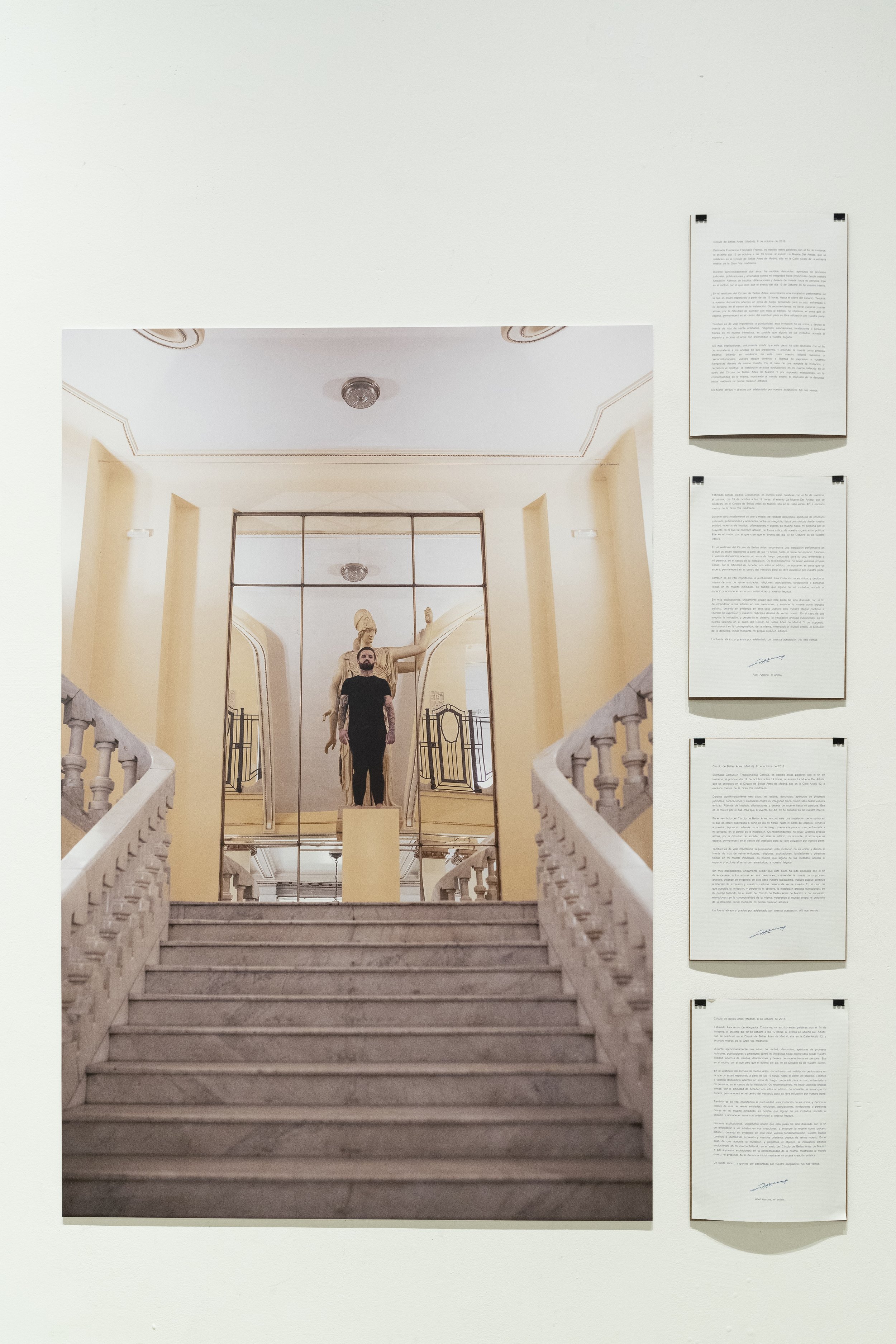 "Abel Azcona stands up, or, to be more precise, he puts his body on the line, fully aware that his fragility is also a sign of extreme resistance. A body is, as Jean-Luc Nancy observed, a tension and a tone, a posture, and above all, something heavy. When we see photographs of Abel Azcona crawling through the streets of Pamplona surrounded by police, we realize that his corporeality is 'legally unbearable,' dragged toward the place where it will have to bear 'the weight of the Law.' Abel Azcona exemplifies that performance is an art of presence without denying the aesthetic and critical potential of documentation. For him, bodily materialization is essential, without suggesting that traces and testimonies that prolong the performative experience cannot be generated. The question of origin is, in every sense, the critical point of all the actions he undertakes, as long as we understand that what we have is not a 'full presence' but différance and supplementarity, a writing that delays the encounter with the Real.