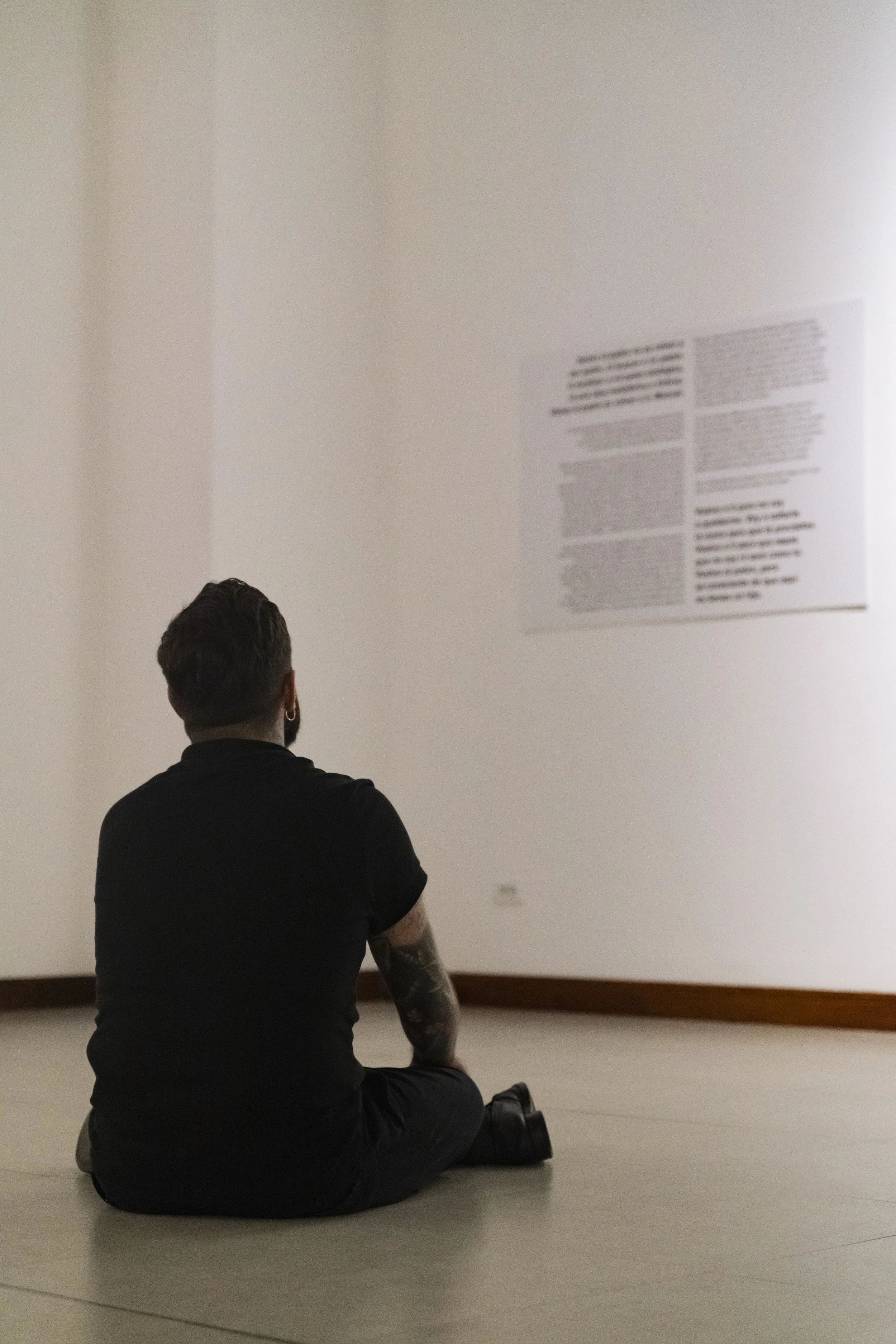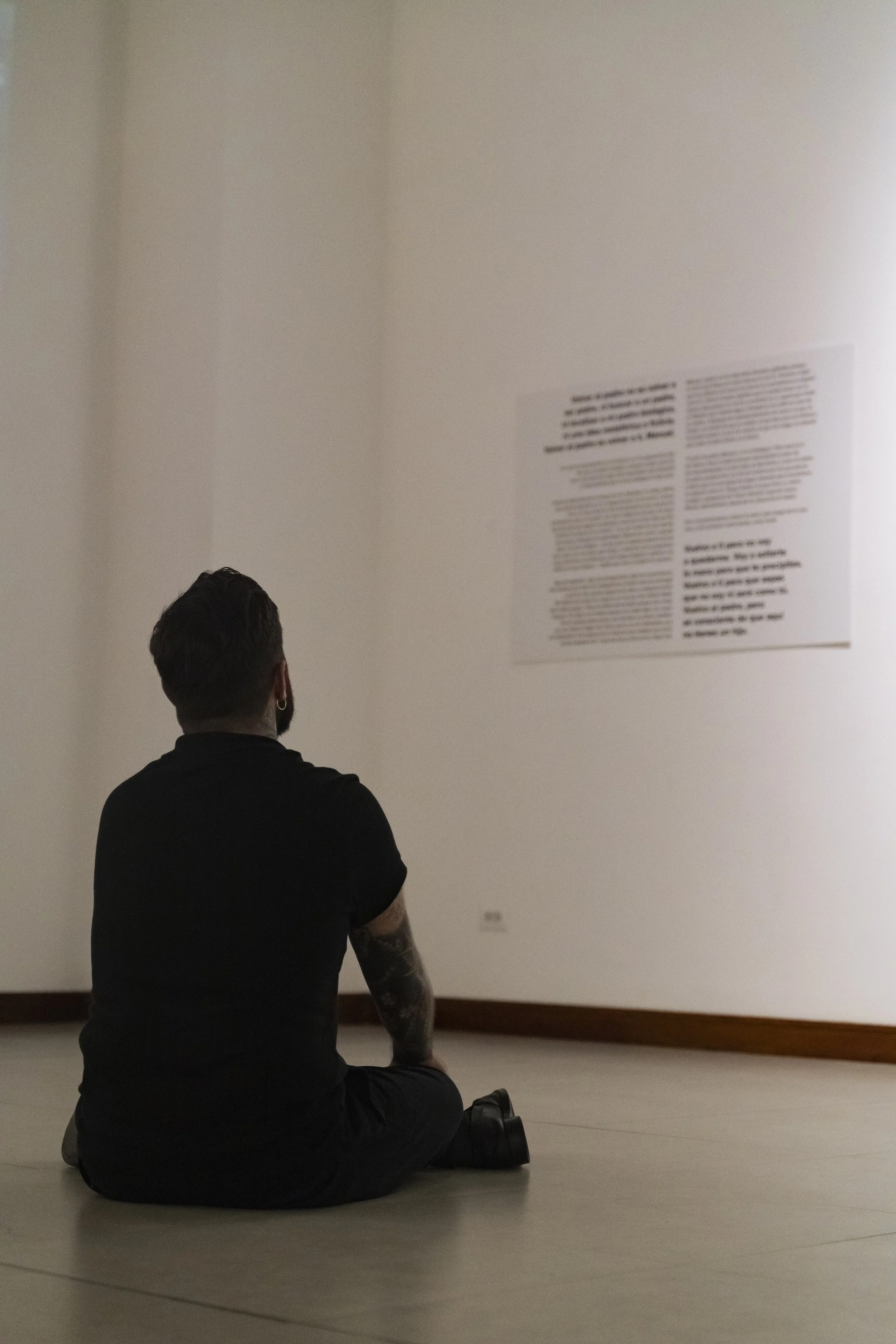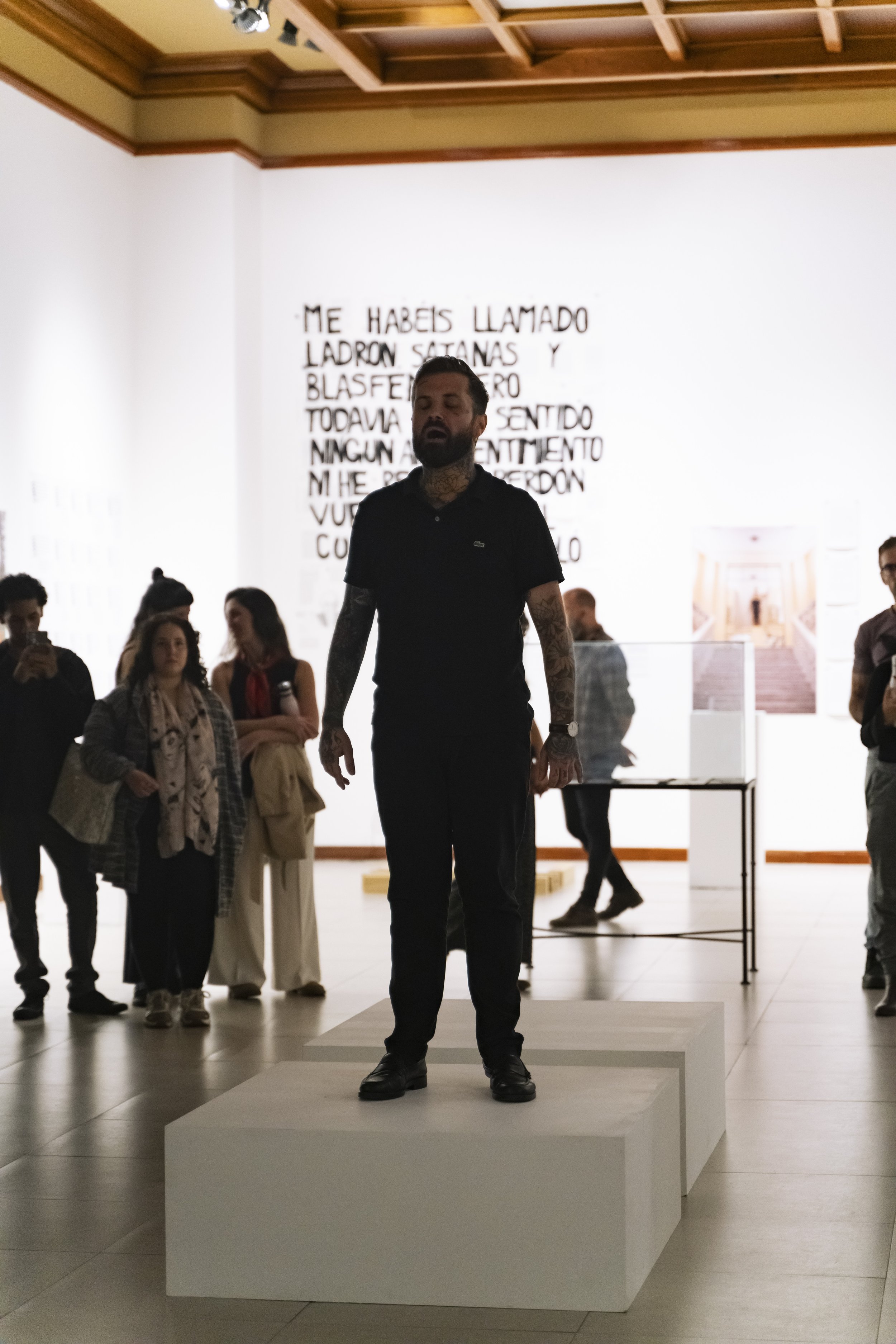 "Abel Azcona stands up, or, to be more precise, he puts his body on the line, fully aware that his fragility is also a sign of extreme resistance. A body is, as Jean-Luc Nancy observed, a tension and a tone, a posture, and above all, something heavy. When we see photographs of Abel Azcona crawling through the streets of Pamplona surrounded by police, we realize that his corporeality is 'legally unbearable,' dragged toward the place where it will have to bear 'the weight of the Law.' Abel Azcona exemplifies that performance is an art of presence without denying the aesthetic and critical potential of documentation. For him, bodily materialization is essential, without suggesting that traces and testimonies that prolong the performative experience cannot be generated. The question of origin is, in every sense, the critical point of all the actions he undertakes, as long as we understand that what we have is not a 'full presence' but différance and supplementarity, a writing that delays the encounter with the Real.