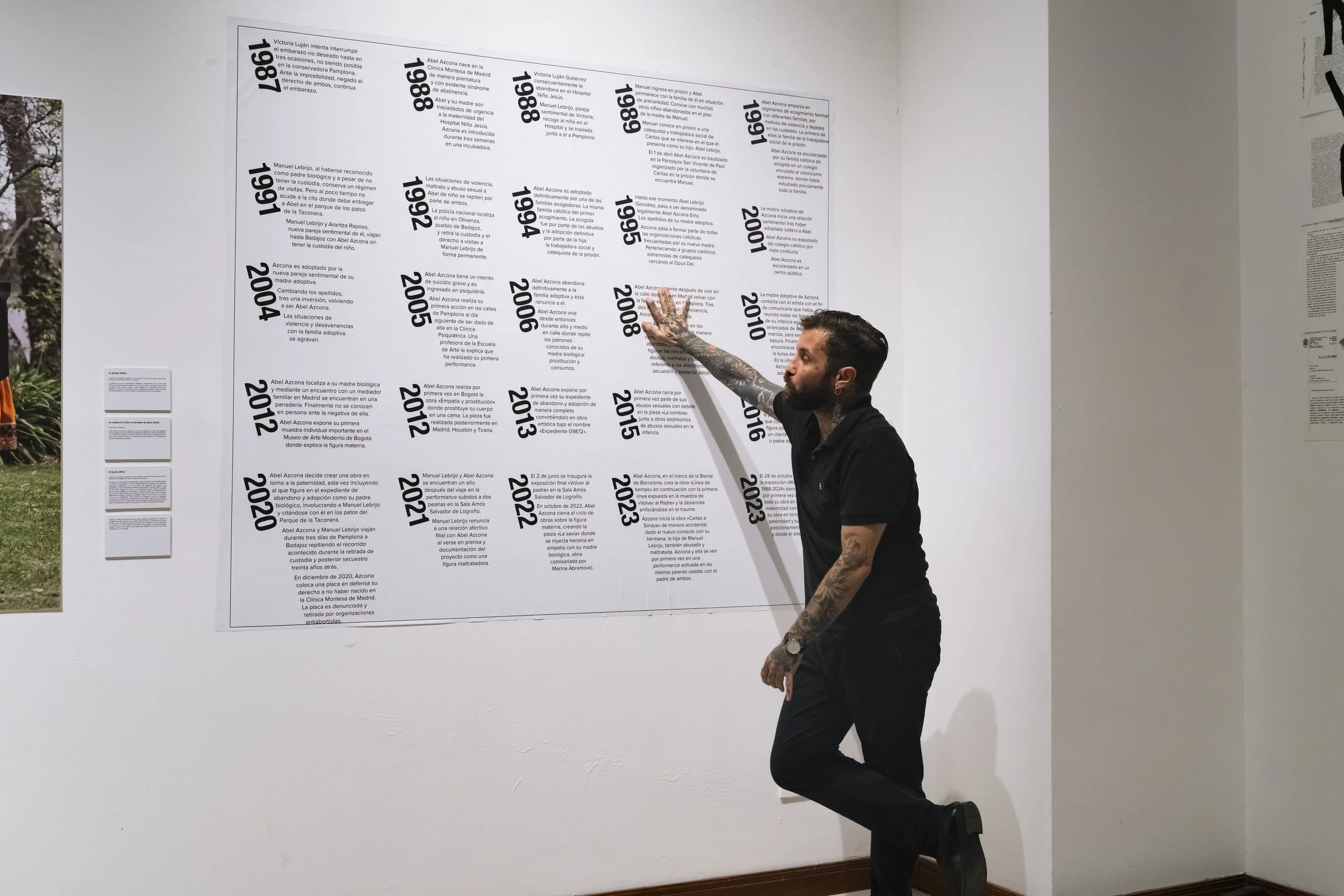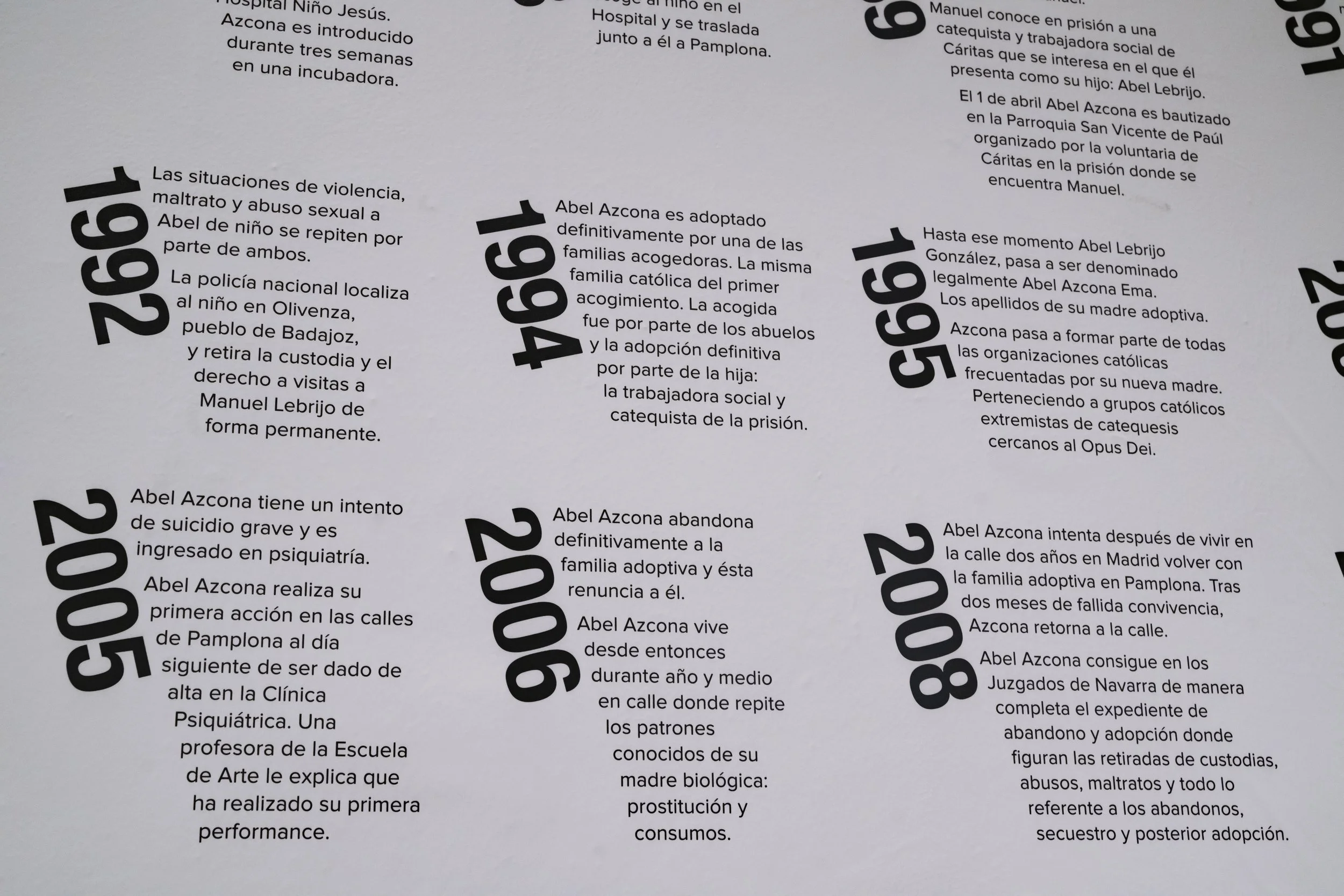 Obra artística y de performance de contenido biográfico. La pieza tiene una base procesual, al ser creada de manera involuntaria durante los primeros años de infancia y crecimiento del artista. Durante los años 2022 y 2023 Azcona activa en público la creación de su propia línea de tiempo, basada en sucesos traumáticos, con documentación original, datos, diálogos y narraciones públicas. Uno de los resultados plásticos de la línea biográfica del artista es la línea creada para describir la cronología del artista desde sus vínculos familiares.