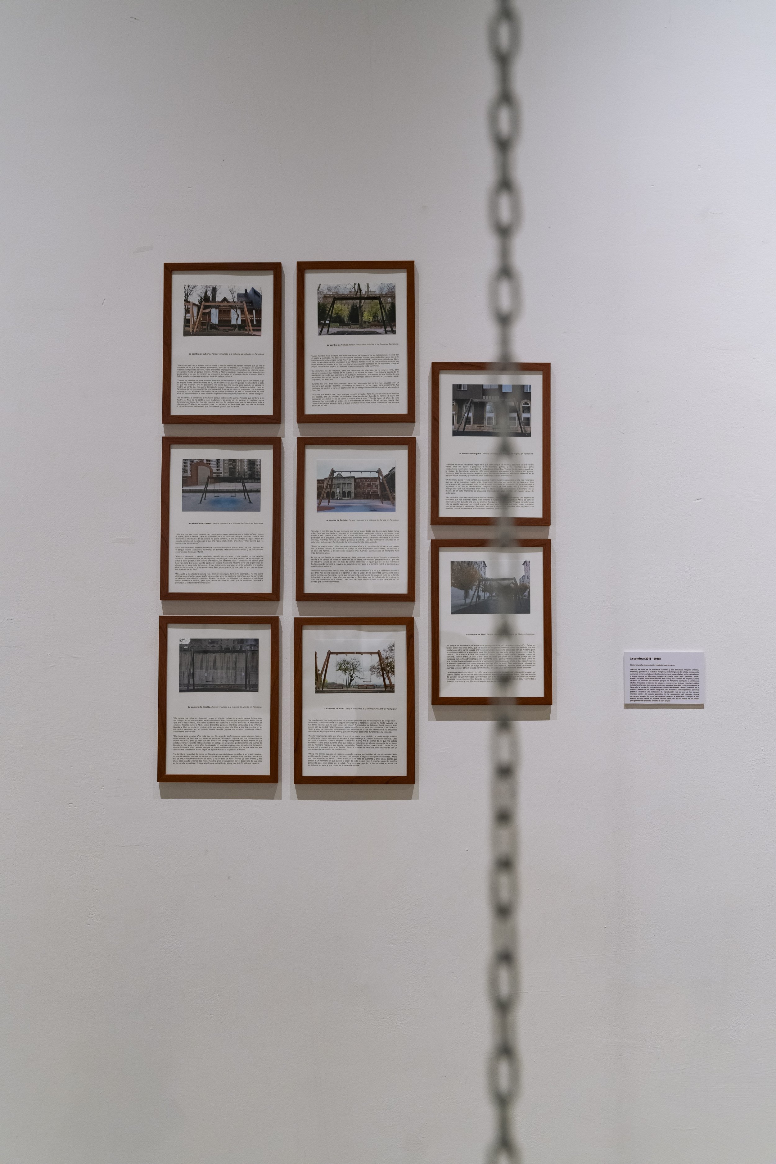 Proyecto artístico, diseñado y gestado en la ciudad de Pamplona, ciudad originaria del artista, como puente y denuncia en torno al abuso infantil posteriormente desarrollada y performatizada por el propio Azcona en diferentes ciudades de España como Soria, Valladolid, Bilbao, Madrid, Tarragona o Barcelona entre los años 2015 y 2018. Al inicio del proyecto, Azcona haciendo un recorrido por distintos parques de Pamplona, acompañó a veintinueve adultos vinculados a historias de abusos a menores. Las treintas historiasiniciales, incluida la del propio Abel Azcona construyen una pieza biográfica y crítica, empleando la fotografía, la instalación y el performance como herramienta catártica colectiva. En la muestra, además de las treinta fotografías, una asociada a cada experiencia personal, podemos encontrar una instalación de reproducción real de uno de los parques infantiles dentro del espacio galerístico. En la reproducción del columpio, Azcona permanece sentado de forma permanente invitando al espectador a ocupar el otro asiento. Azcona cuenta en primera persona cada uno de los relatos de los treinta protagonistas del proyecto, así como el suyo propio.