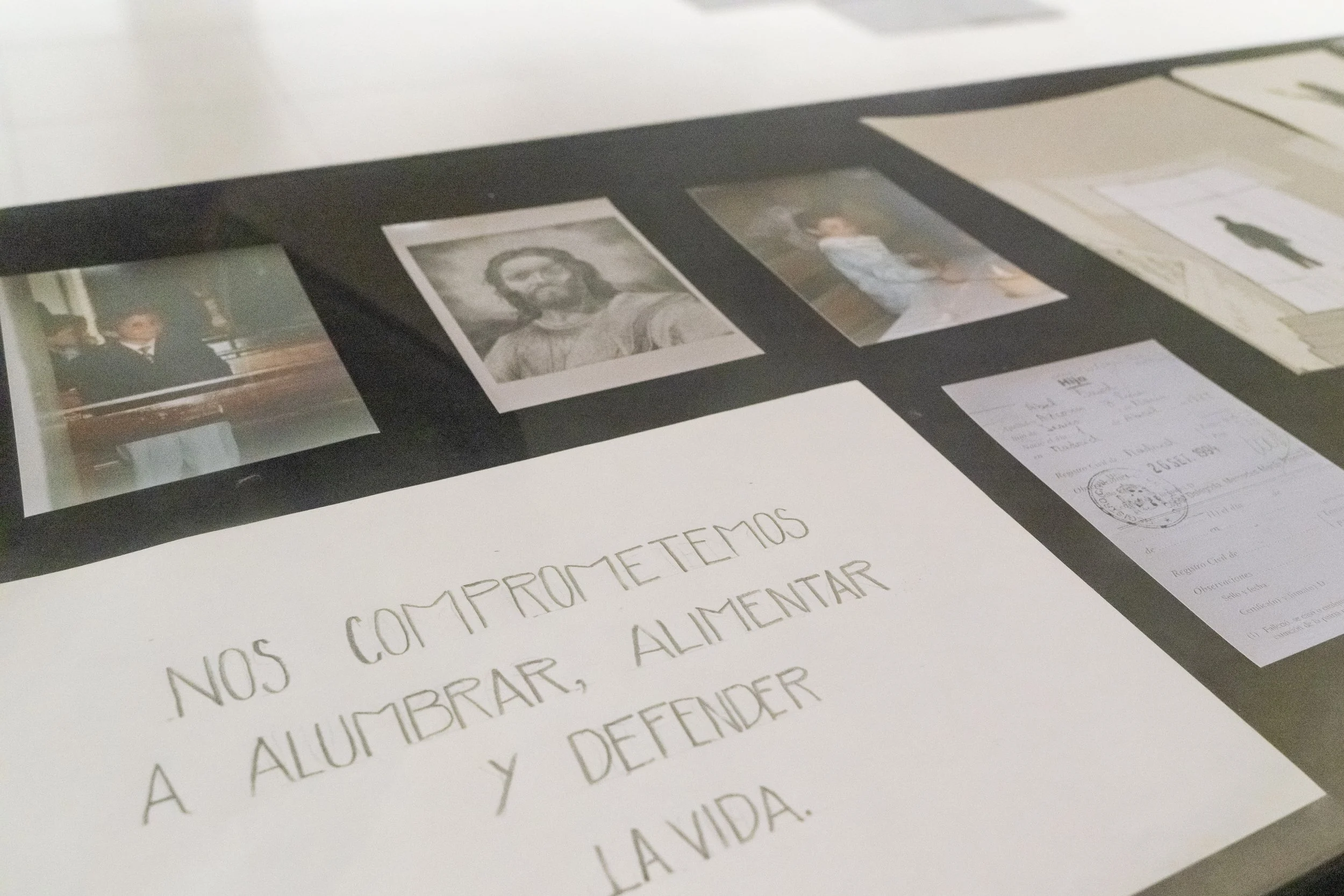 Obra objeto creada a partir de tres procesos claramente diferenciados: La búsqueda del expediente de adopción donde el artista consiguió decenas de documentos y las primeras partidas de nacimiento y registro que habían sido suprimidas y retiradas del registro civil, donde finalmente consigue uno de los registros oficiales donde es registrado como hijo de Jesús y de María evidenciado la gran herencia católica de las instituciones. El segundo proceso son las fotografías dentro de una ceremonia ritual católica vinculada al Opus Dei en la Parroquia San Vicente de Paúl de Pamplona. Así en el último proceso encontramos un retrato del artista creado desde sus propias facciones y las de un posible padre desconocido, pero al haber sido registrado como hijo de Jesús, de una manera metafórica, crítica e irónica nos encontramos este dibujo en una fusión fisonómica de aquel padre ficticio que las instituciones católicas forzaron y el rostro del propio artista.