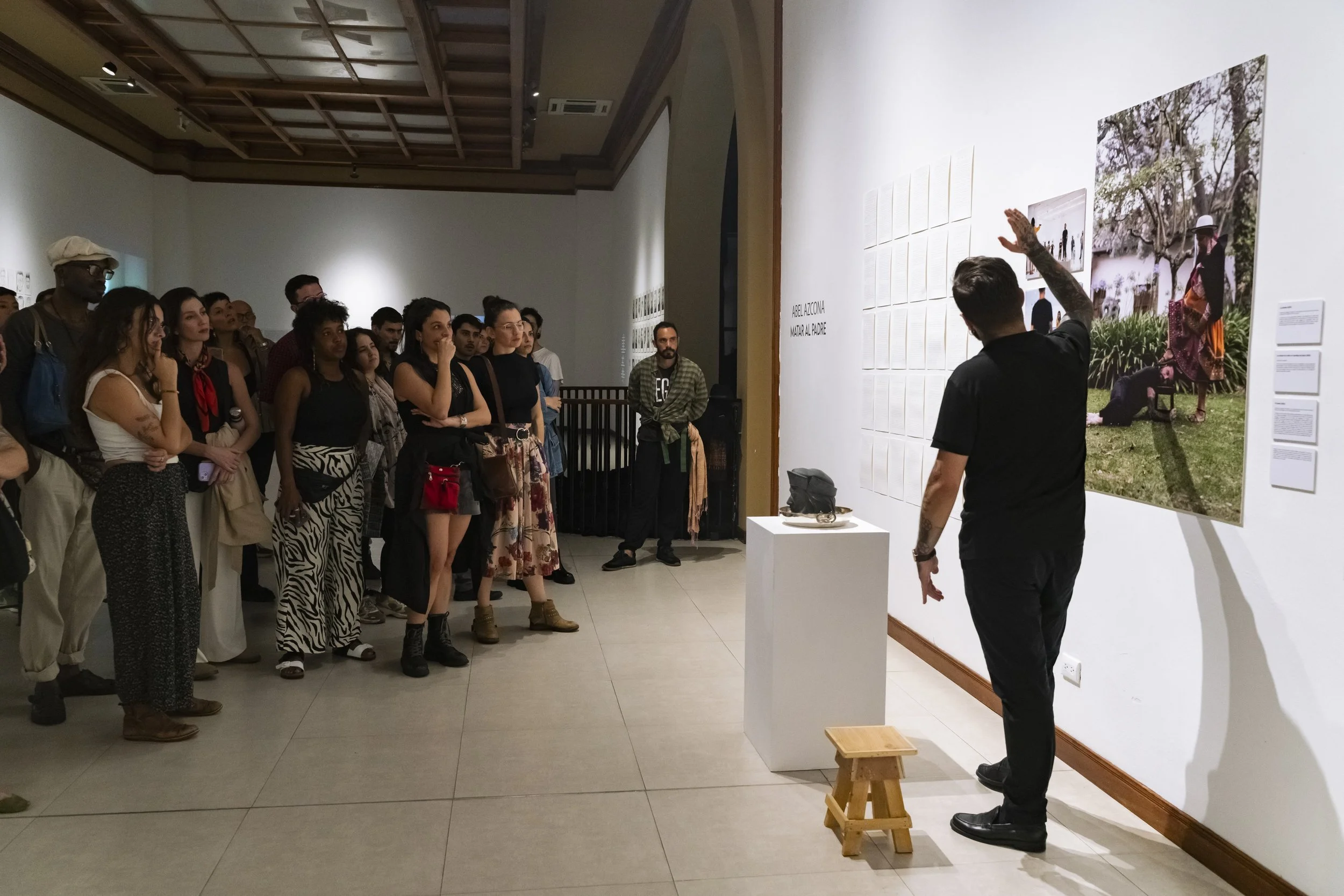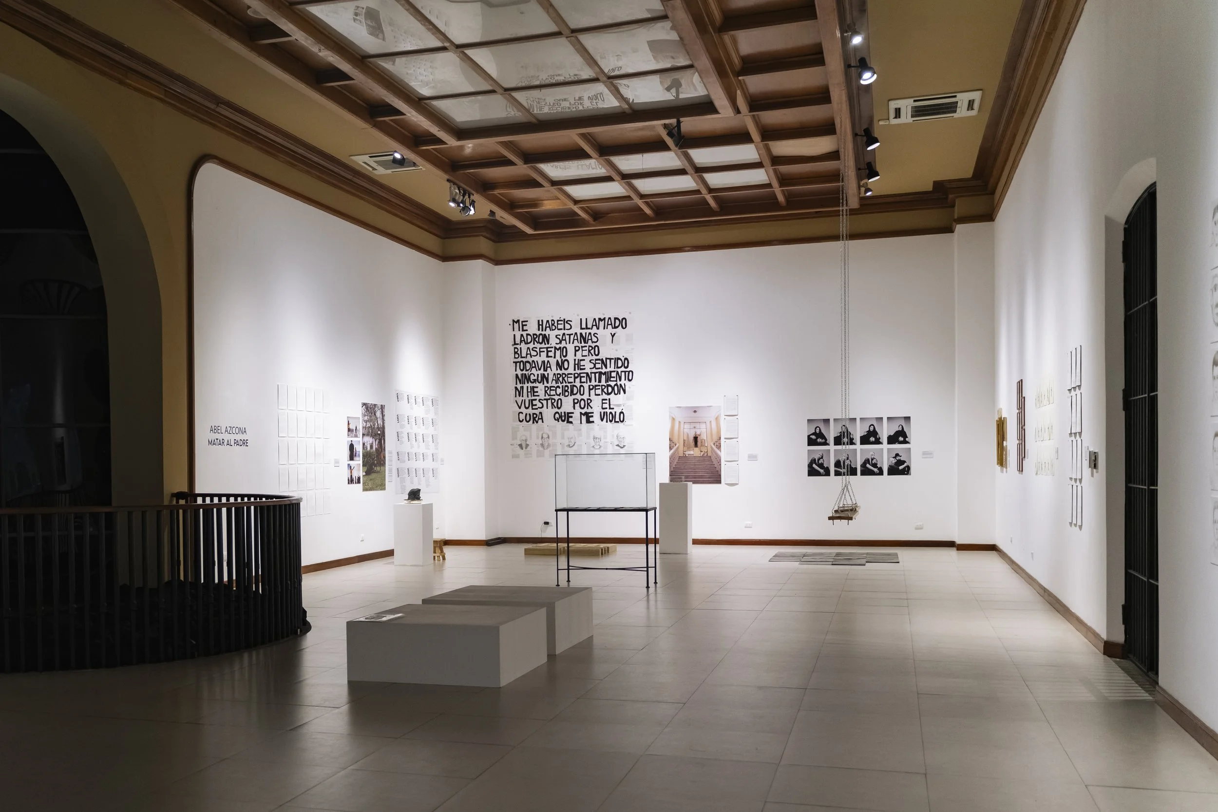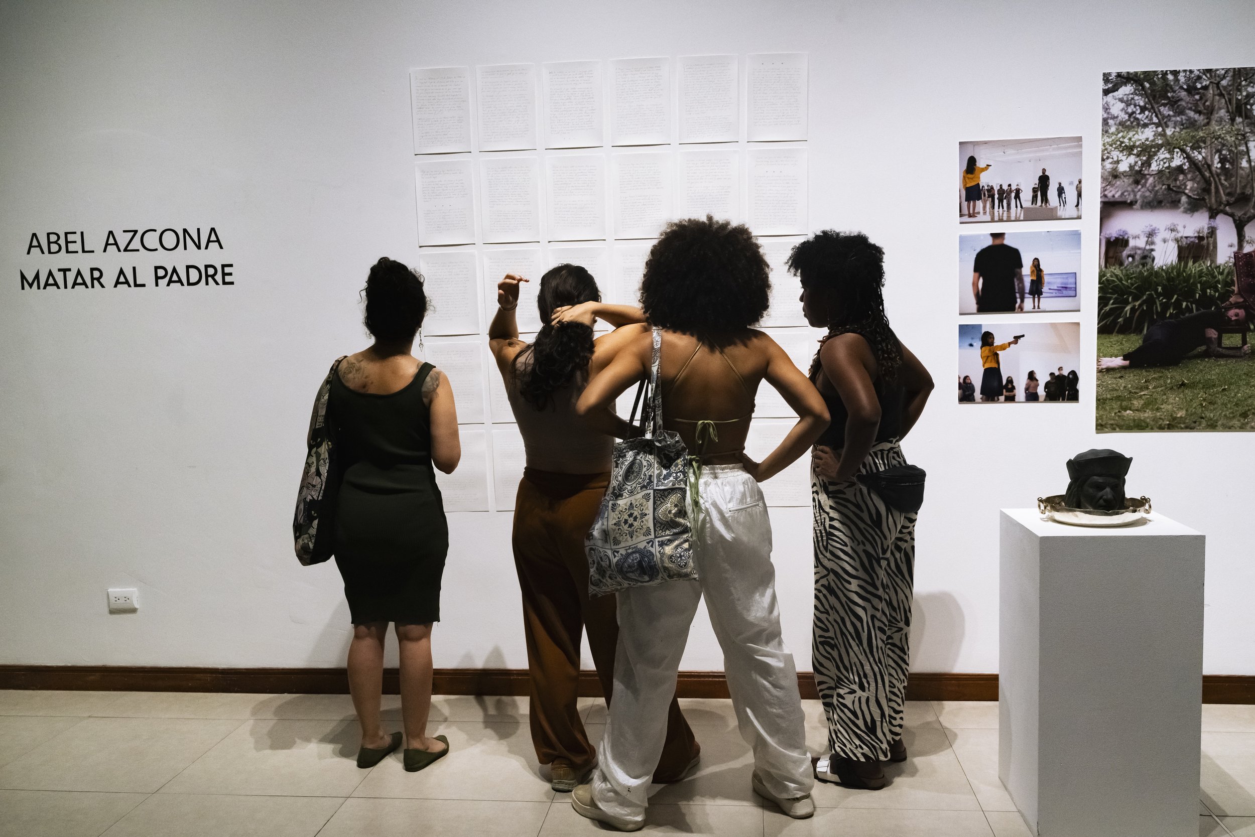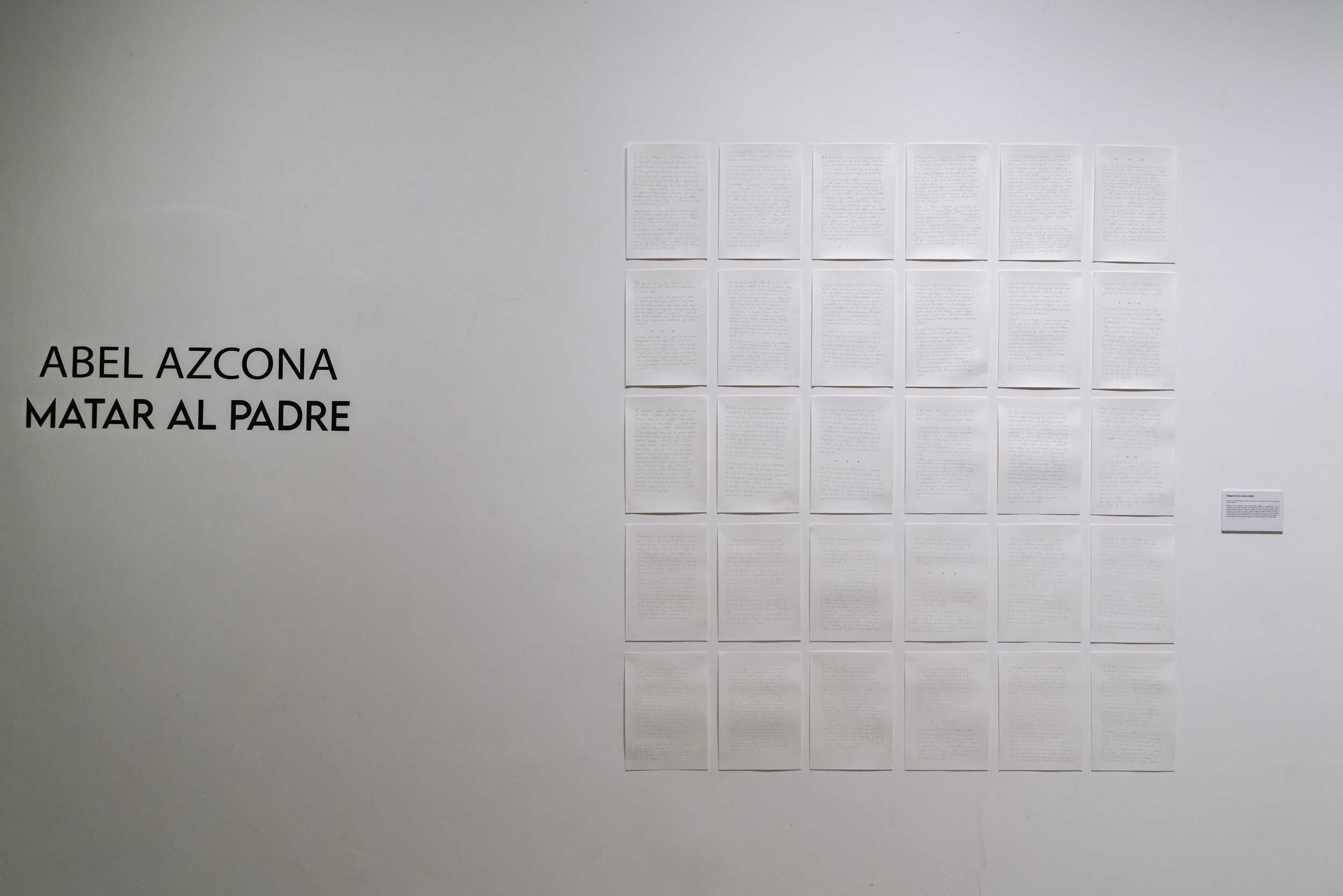 Matar al padre es un acto expositivo, performativo y violento. Una exposición que surge como recapitulación y cierre de todas las obras del artista en torno a la paternidad, la masculinidad, el abuso sexual, las violencias, el colonialismo y la religión. En el mes de abril de 2025 Azcona conocerá por fin a su madre biológica y antes de conocerla por fin en persona tras veinte años trabajando sobre su abandono y su ausencia Azcona recapitula. En esta recapitulación expone todas las obras de paternidad, donde habla de sus padres y abusadores sexuales. Hombres clientes de prostitución y abusadores de su madre y de él mismo una vez nacido. En una amplia recopilación de todas las obras en torno al padre y a otras figuras de poder. Una muestra expositiva que sirve al artista como cierre y clausura de sus obras en torno a los abusos sufridos. al maltrato de sus figuras paternas, a la religión obligada desde su adopción católica y a las dos figuras privilegiadas detrás de su propia experiencia el colonialismo y el mundo del arte. Azcona pone fin a todas estas obras en una exposición autobiográfica que habla de todas las violencias sufridas y como el artista las mira a los ojos para quemarlas, para destruirlas, para enfrentarse a ellas y también para decirles, por fin, adiós.