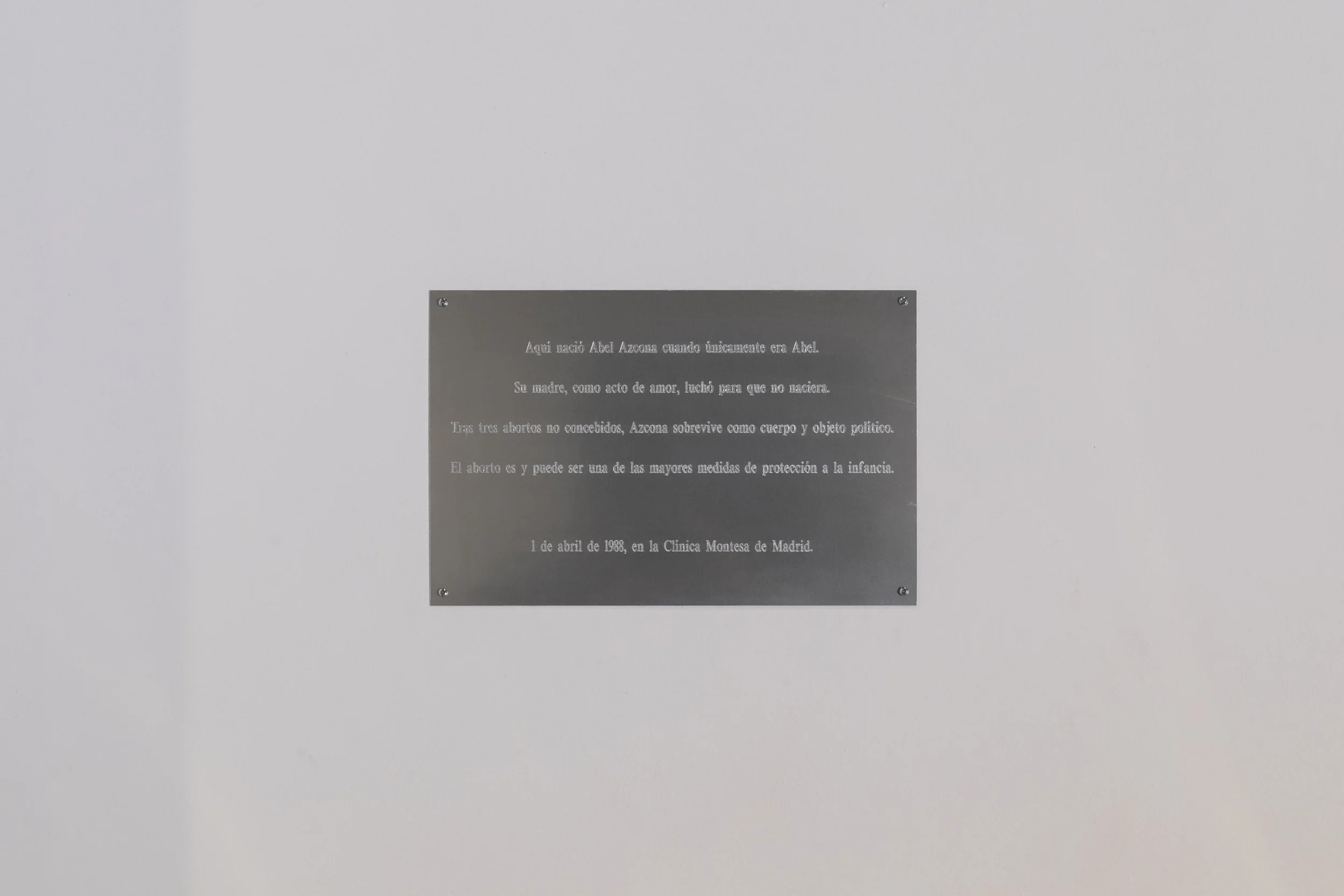 Obra performativa y objetual activada en diciembre de 2020 el artista Abel Azcona instaló en la Clínica Montesa de Madrid, lugar donde nació, una placa rememorando el derecho a no haber nacido y reivindicando el aborto «Como una de las mayores medidas de protección a la infancia» que existen cuando, en su caso, afirma que no debería haber nacido, al haberlo hecho en un entorno de consumos, prostitución y precariedad absoluta. Esta pieza creó gran controversia y fue denunciada y la placa retirada y saboteada por organizaciones provida y anti-aborto como Derecho a Vivir.