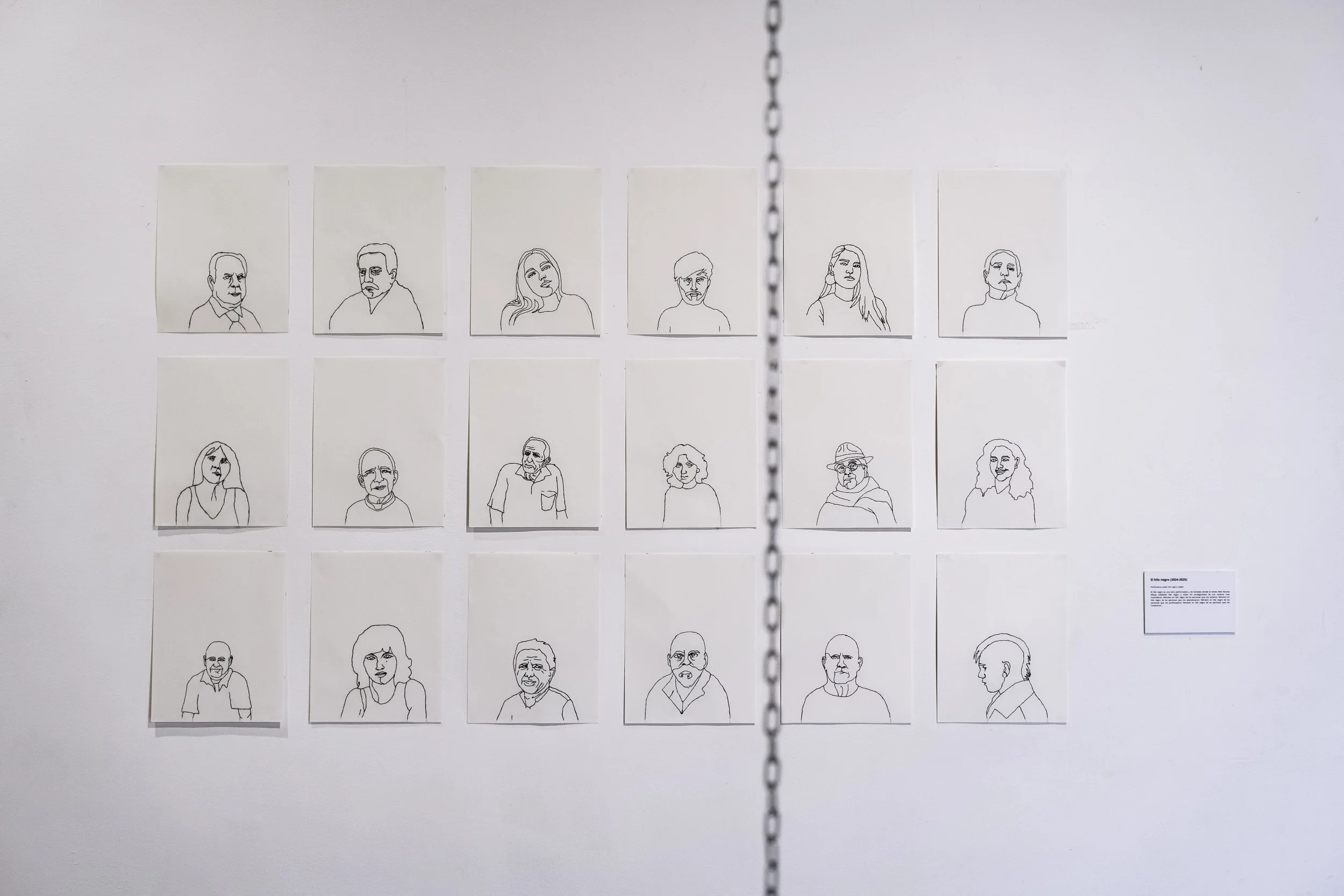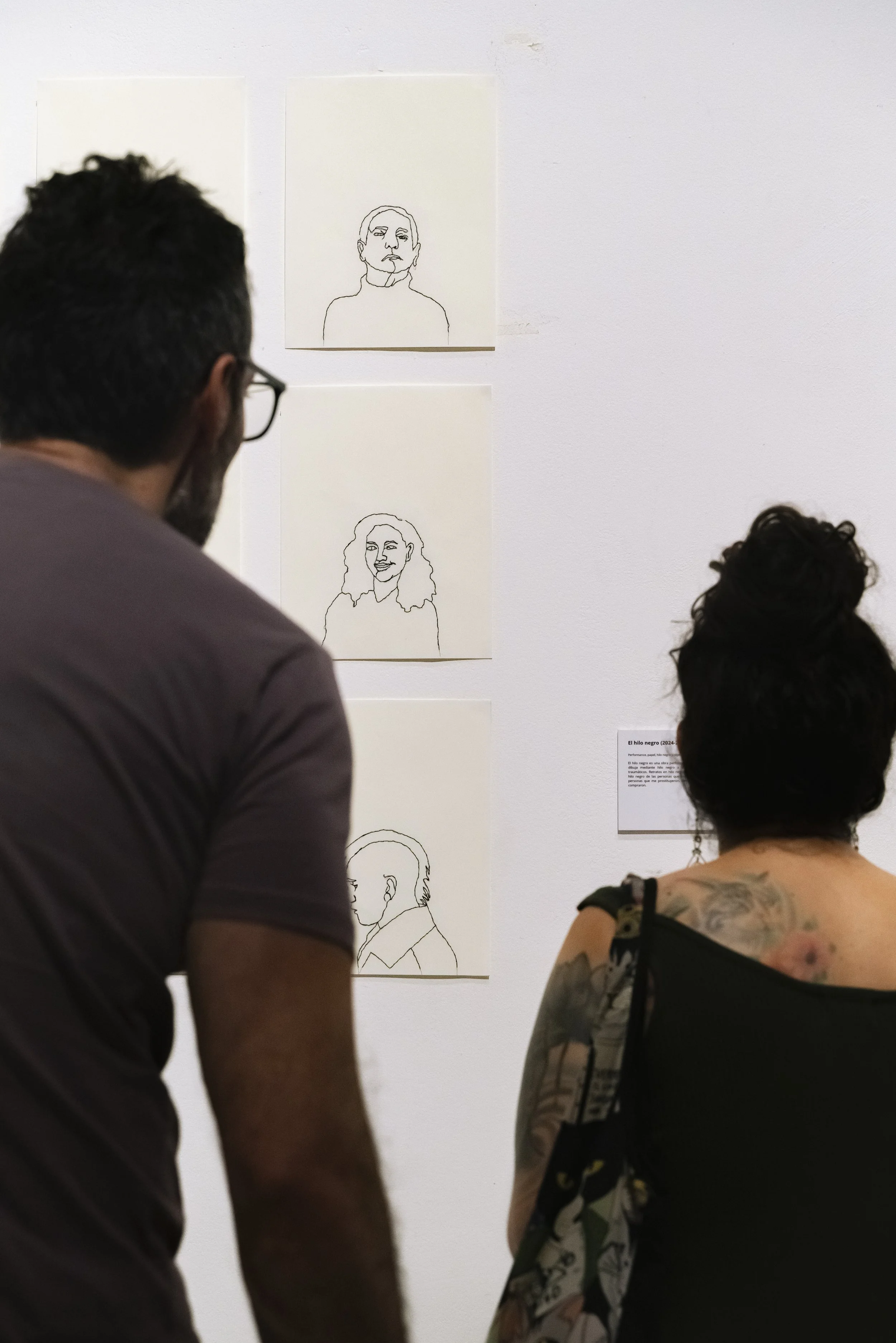 El hilo negro es una obra performativa y de bordado donde el artista Abel Azcona dibuja mediante hilo negro a todos los protagonistas de sus sucesos mas traumáticos. Retratos en hilo negro de las personas que me violaron. Retratos en hilo negro de las personas que me abandonaron. Retratos en hilo negro de las personas que me prostituyeron. Retratos en hilo negro de las personas que me compraron.