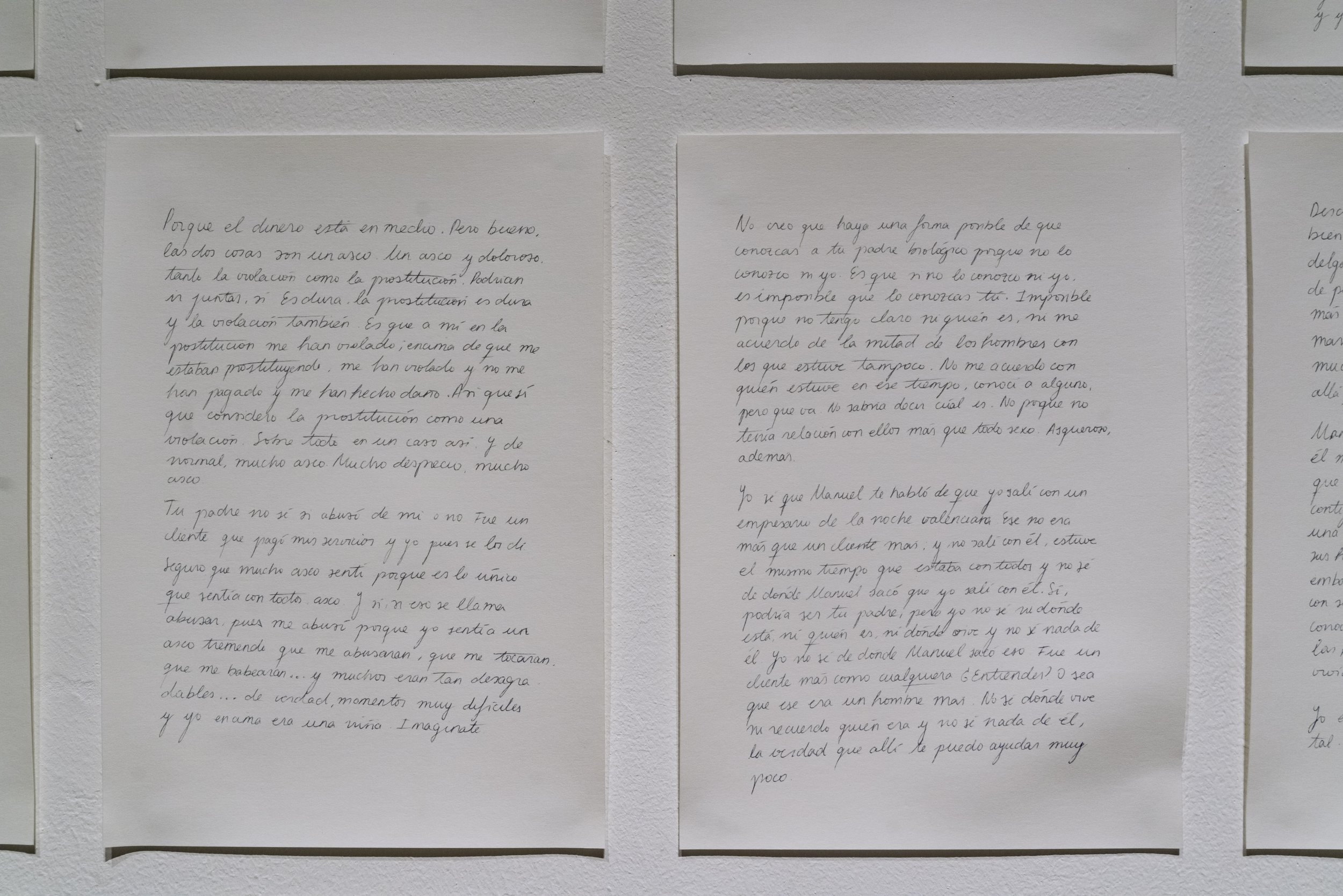 Selección de las setenta hojas manuscritas creadas en colaboración con el testimonio en primera persona como relato de vida de Isabel Gómez Aranda. Durante varias semanas se invitó a Isabel a escribir manuscritamente toda su experiencia vital, pero tras varios intentos fallidos el propio estudio del artista la ayudó con el envío de noventa preguntas formuladas por Azcona y la transcripción y construcción del relato transcrito con lasrespuestas de Isabel Gómez Aranda. La madre biológica de Azcona que le abandonó al nacer reaparece en el año 2023.