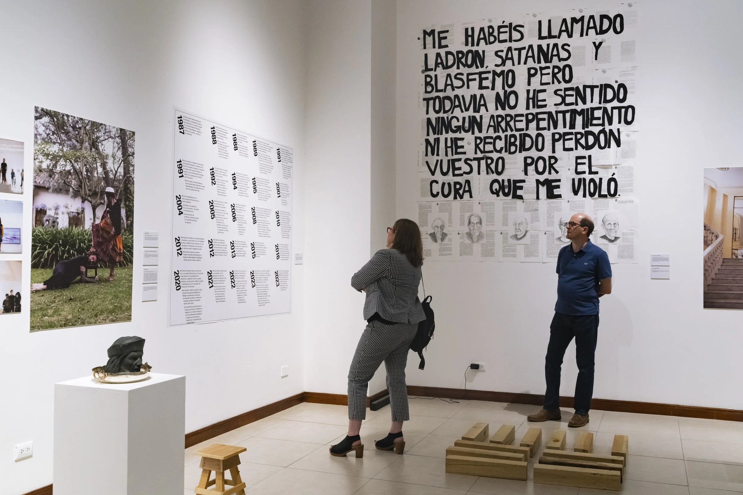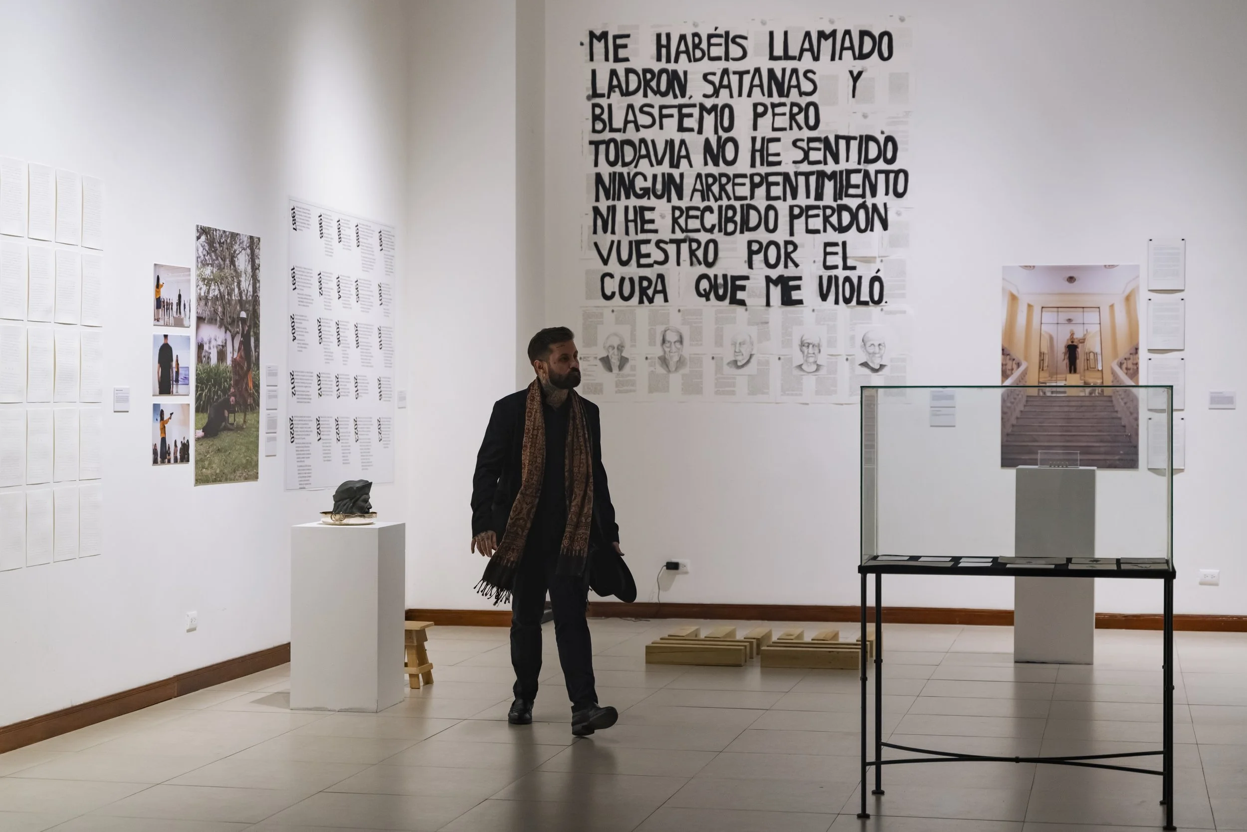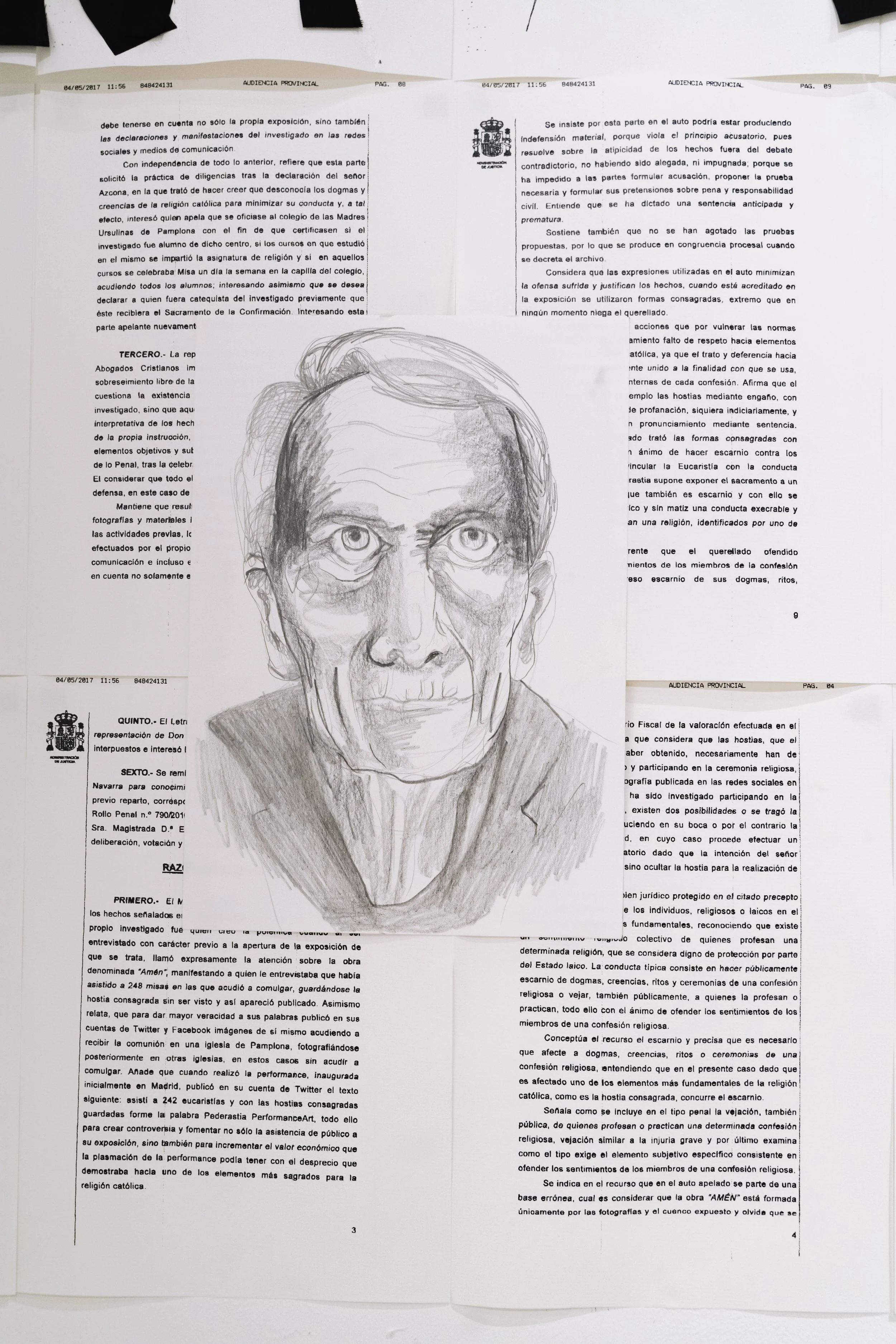 Azcona ha sido demandado judicialmente en varias ocasiones por la Iglesia Católica por piezas donde denunciaba la pederastia en la misma. En todos los juicios Azcona ha salido victorioso. En esta nueva instalación Azcona utiliza los documentos originales de la primera demanda contra él por la Iglesia como institución. Siendo el primer artista en la historia demandando ante un tribunal por la Iglesia Católica como tal. Azcona interviene los documentos con tela popelina negra de sotana. La frase denuncia el haber sido no solo violado por la Iglesia sino también perseguido tras ello, sin haber sido escuchado.