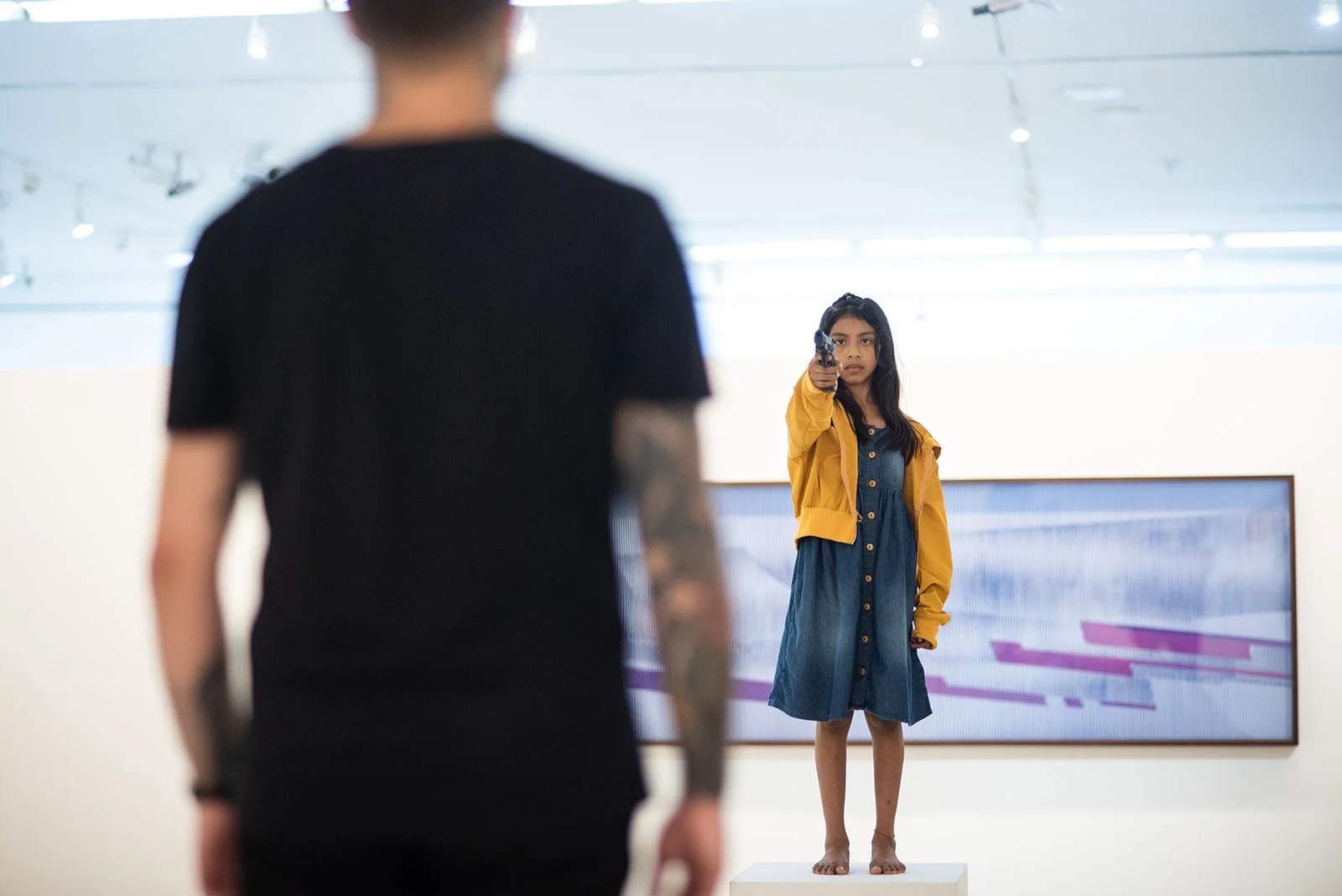 El duelo es una obra performativa diseñada y desarrollada por el artista Abel Azcona en el Museo Antropológico y de Arte Contemporáneo de Ecuador en la ciudad de Guayaquil, considerada una de las urbes más peligrosas del mundo, y en estadísticas un gran porcentaje de infantes delinquiendo. El poder estético y social de esta nueva imagen nos acerca a la consideración de los cuerpos normados dentro de sus realidades, en el caso de una niña que convive con la violencia día a día y su crecer estructurado en los límites morales, arma un duelo ante un cuerpo hegemónico europeo, en estado de privilegio, frente a lo que no se es y la manera en la que ha resignificado ciertos procesos de violencia, y cómo las supuestas minorias se van apropiando de espacios que hace algunos años atrás no hubiesen sido posible tomarlos.