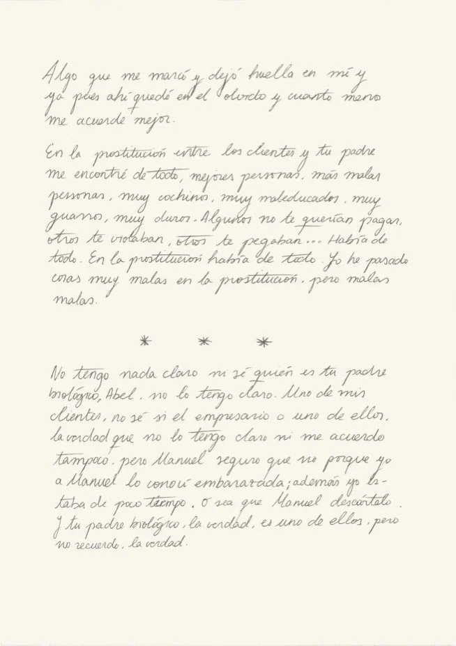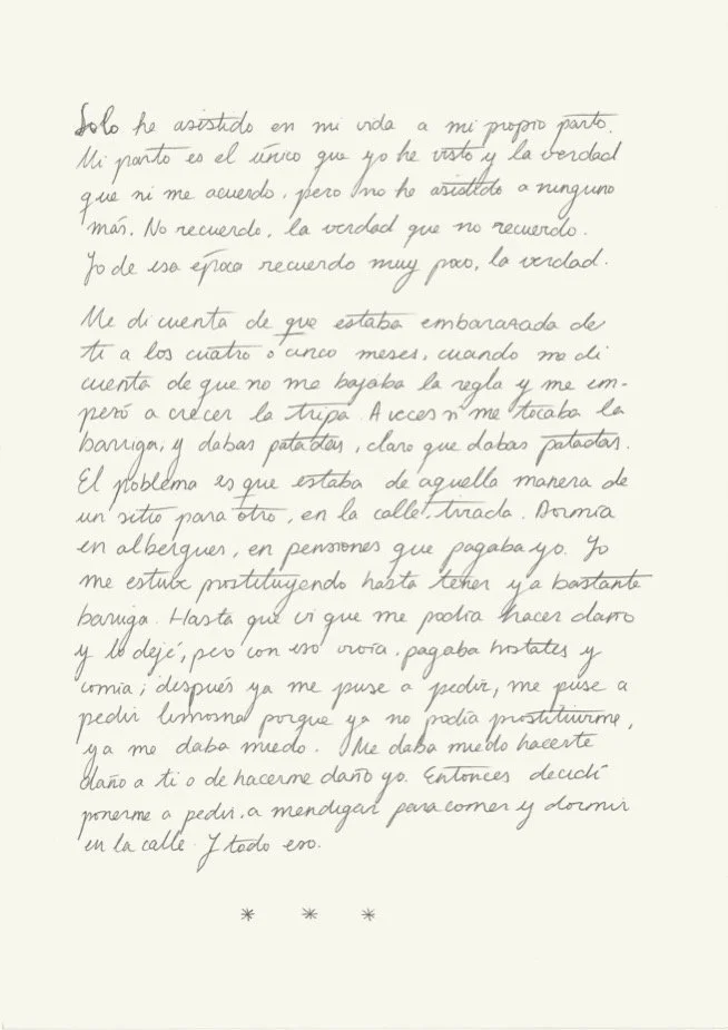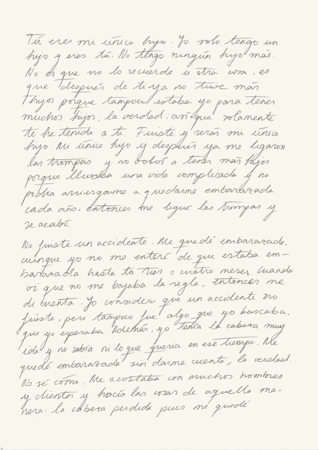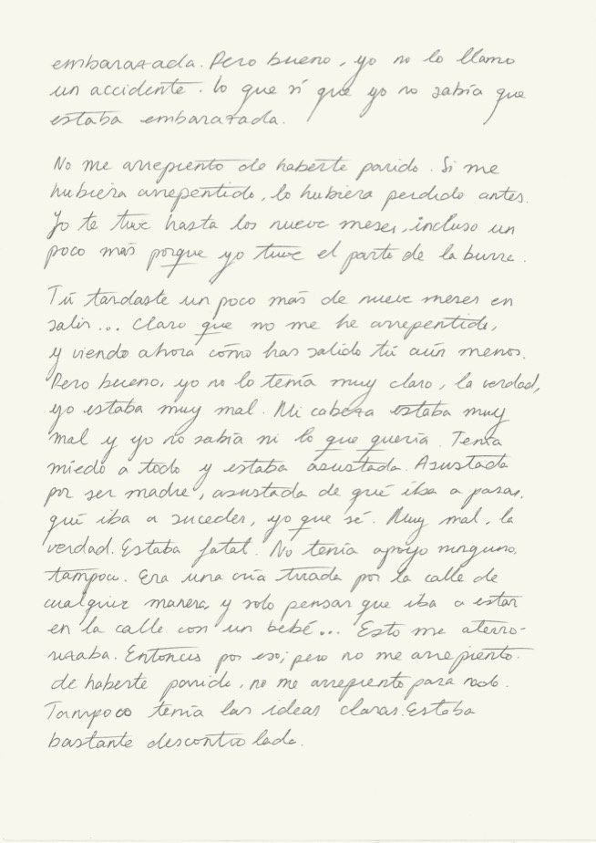 Born Without a Mother is a denunciation of the omission of the right not to be born, defended on three occasions when the mother tries to terminate the pregnancy; it is also a defense of abortion as one of the most important measures for child protection. Born Without a Mother is a journey through autobiographical violence and, at the same time, through the systemic violence that conditions and triggers these events; it is a search for the original violence. Born Without a Mother is a political artifact.