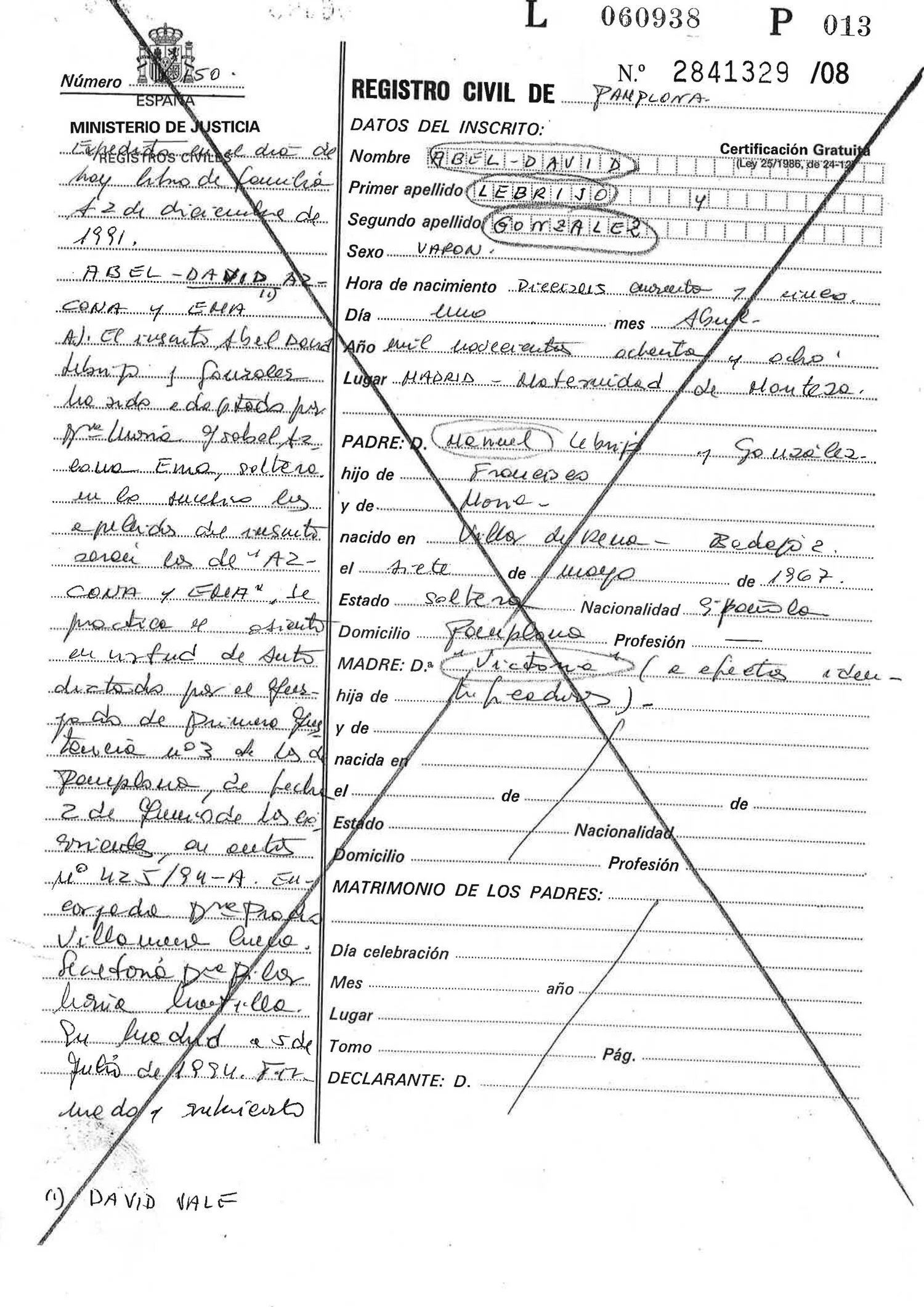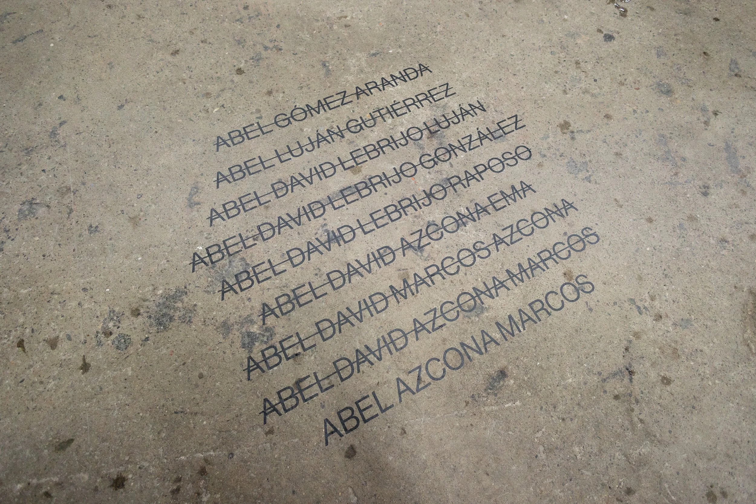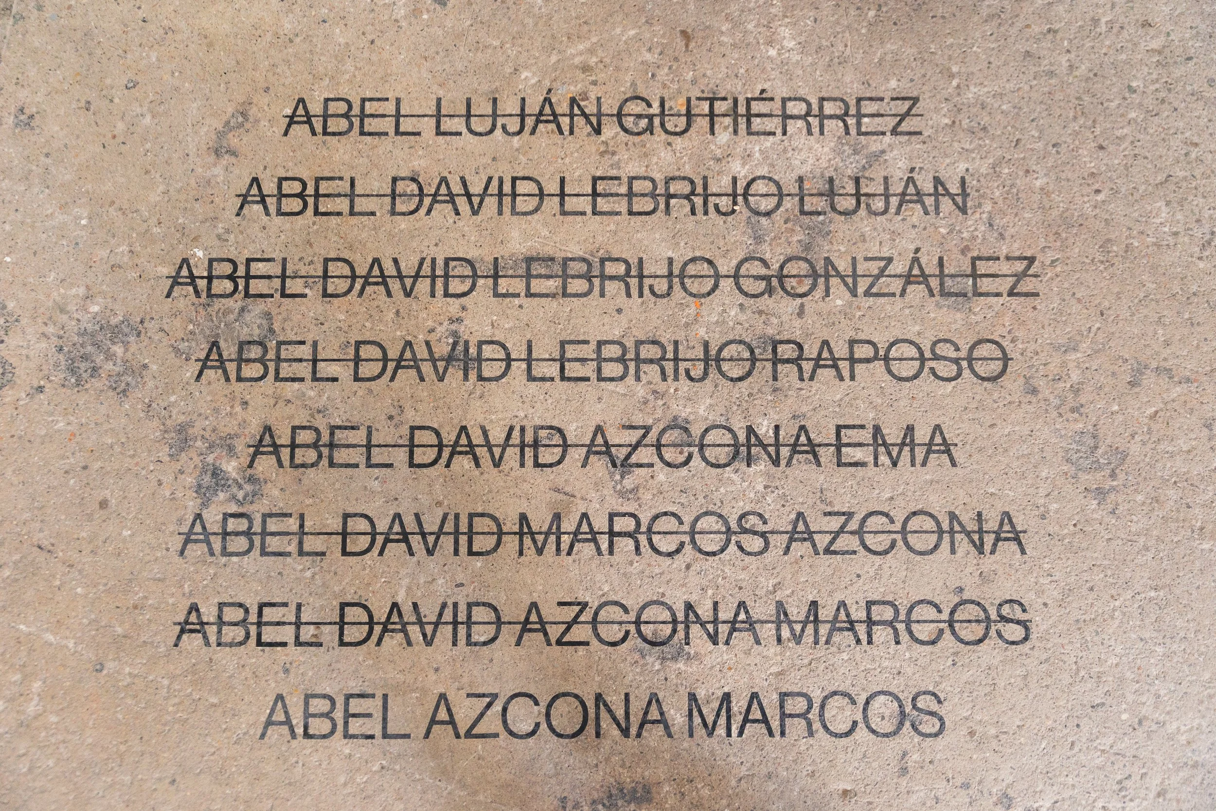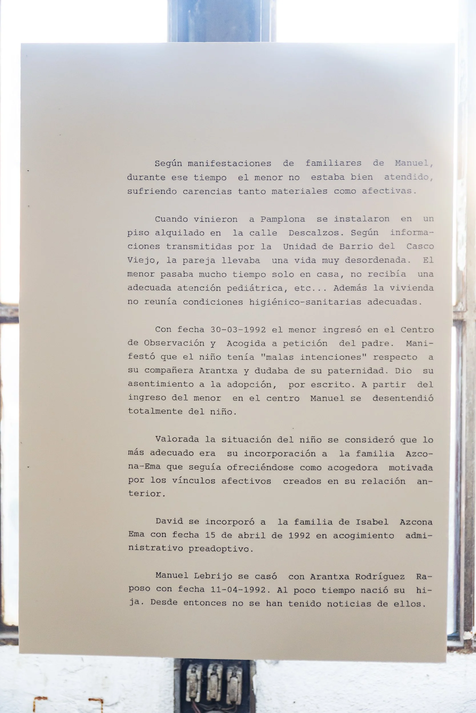Instalación creada para acompañar la obra creada con el expediente de Bienestar Social de Azcona, también nombrado Abel Luján Gutiérrez, Abel David Lebrijo González, Abel David Azcona Marcos, David Azcona Marcos o Abel David Azcona Ema. La madre biológica de Azcona decidió el nombre de Abel y al registrarlo en la Clínica Montesa como propio fue primeramente Abel Luján Gutiérrez, los apellidos de ella. El menor no es registrado en el Registro civil hasta los cuatro años de edad y, ante el abandono de la madre, la pareja de esta se hace cargo del niño y lo registra como Abel David Lebrijo González, los apellidos de este, a pesar de no ser su padre biológico. Siendo estos los primeros apellidos que constan en documento legal. A partir de entonces, en diferentes registros y documentos como la escolaridad, cambian el segunda apellido por Raposo, la nueva pareja de él. A la edad de seis años empiezan los trámites de adopción y a los siete años pasa a ser conocido como Abel David Azcona Ema, los apellidos de la madre adoptiva. La familia adoptiva rehúsa usar el nombre de Abel desde la adopción porque supone un vínculo excesivo a la madre biológica, que eligió el nombre. A los quince años de edad, Azcona es adoptado por el nuevo marido de su madre adoptiva, por lo que se convierte en Abel David Marcos Azcona y, después de un tramite de inversión de apellidos aprobado por la familia, Azcona vuelve al primer nombre y definitivamente es Abel David Azcona Marcos. A la edad de veinte años decide eliminar legalmente el nombre de David, al no tener ninguna relación con su familia adoptiva y utilizar nueva y únicamente Abel como homenaje a su madre biológica y como respuesta a la prohibición e imposición del otro nombre.