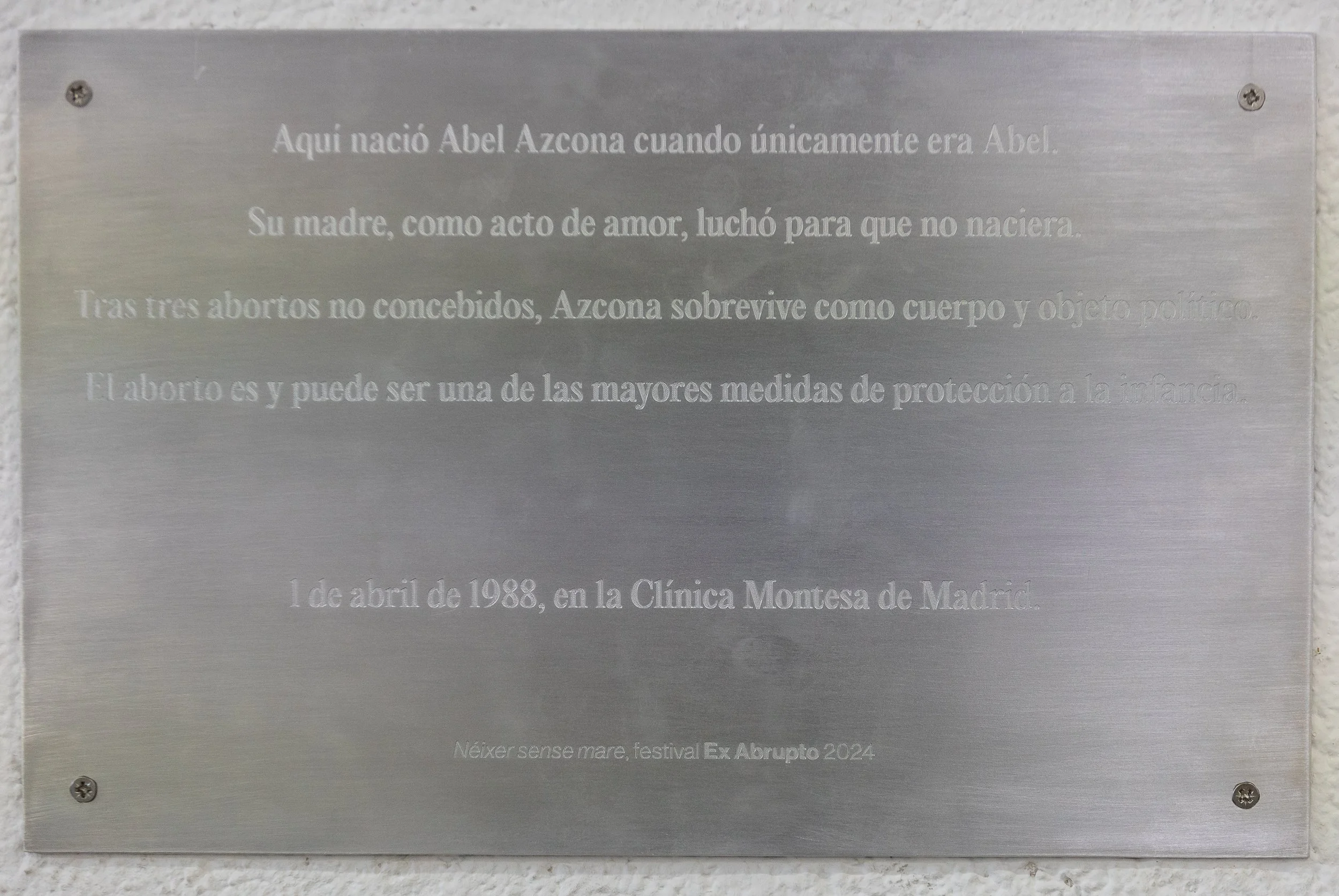 Obra performativa y objetual activada en diciembre de 2020 el artista Abel Azcona instaló en la Clínica Montesa de Madrid, lugar donde nació, una placa rememorando el derecho a no haber nacido y reivindicando el aborto «Como una de las mayores medidas de protección a la infancia» que existen cuando, en su caso, afirma que no debería haber nacido, al haberlo hecho en un entorno de consumos, prostitución y precariedad absoluta. Esta pieza creó gran controversia y fue denunciada y la placa retirada y saboteada por organizaciones provida y anti-aborto como Derecho a Vivir.