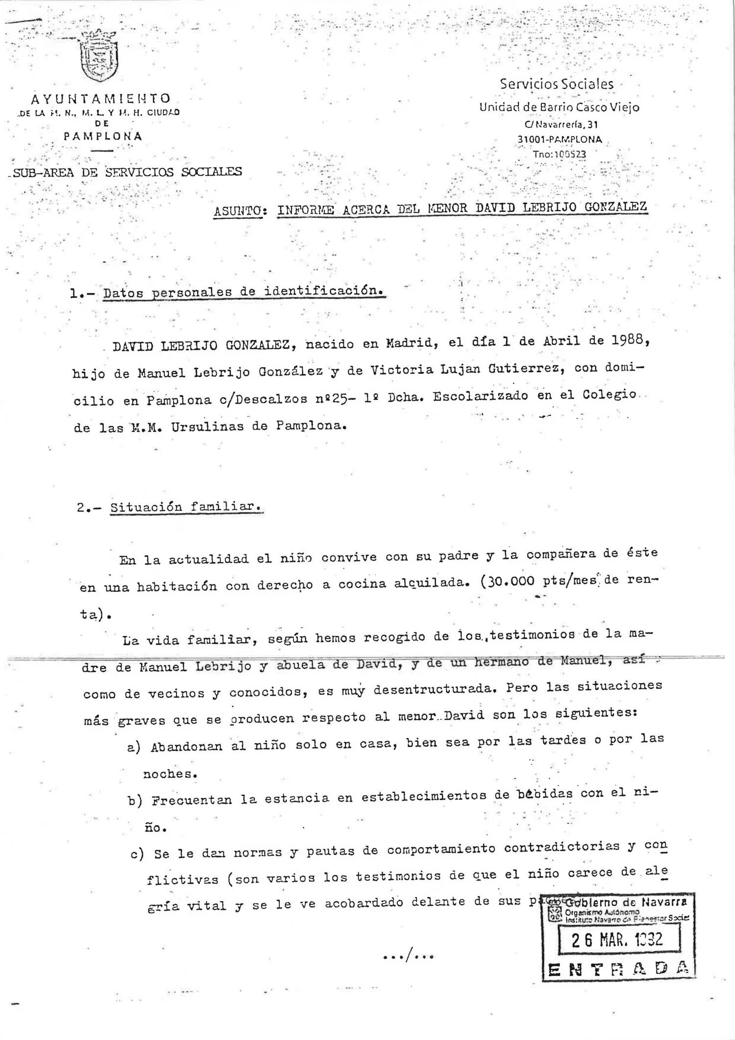 Obra artística y de performance, de contenido crítico y biográfico. La pieza tiene una base procesual, al ser creada de manera involuntaria durante los primeros años de infancia y crecimiento del artista. En ella muestra de manera instalativa y documental su propio expediente de Bienestar Social. A lo largo de ciento veintiocho páginas encontramos situaciones concretas que llevaron al desamparo y abandono de Azcona siendo menor. En los documentos se narra el estado de un niño en situación de total de abandono, con visibles signos de abuso, de descuido y de desnutrición, y se aportan testimonios de vecinos y el entorno confirmando que el menor se llegaba a encontrar semanas en total soledad en el apartamento, que no cumplía las condiciones mínimas de habitabilidad. Con esta pieza, Azcona se expone plenamente, posibilitando al espectador conocer e intimar con cada una de las experiencias infantiles y vitales que le han formado como artista y persona.