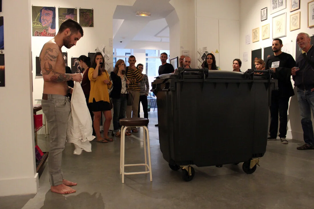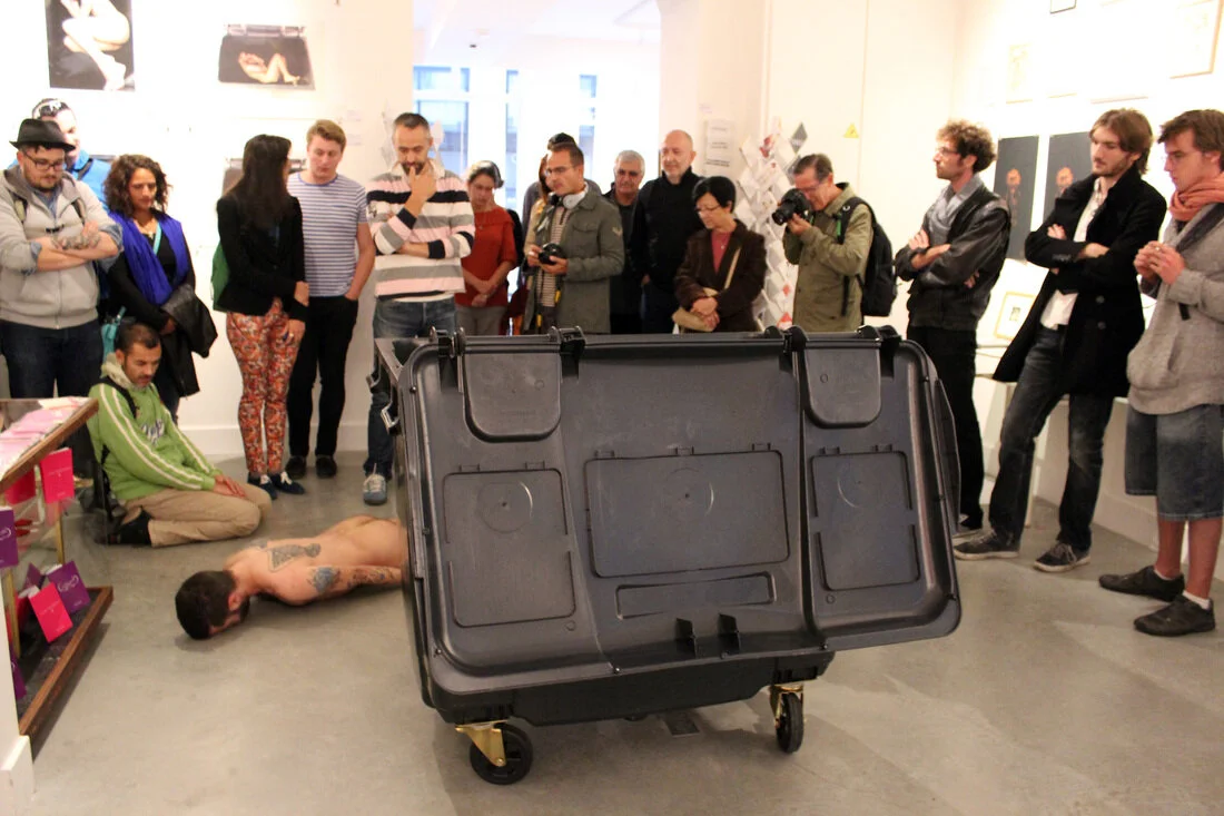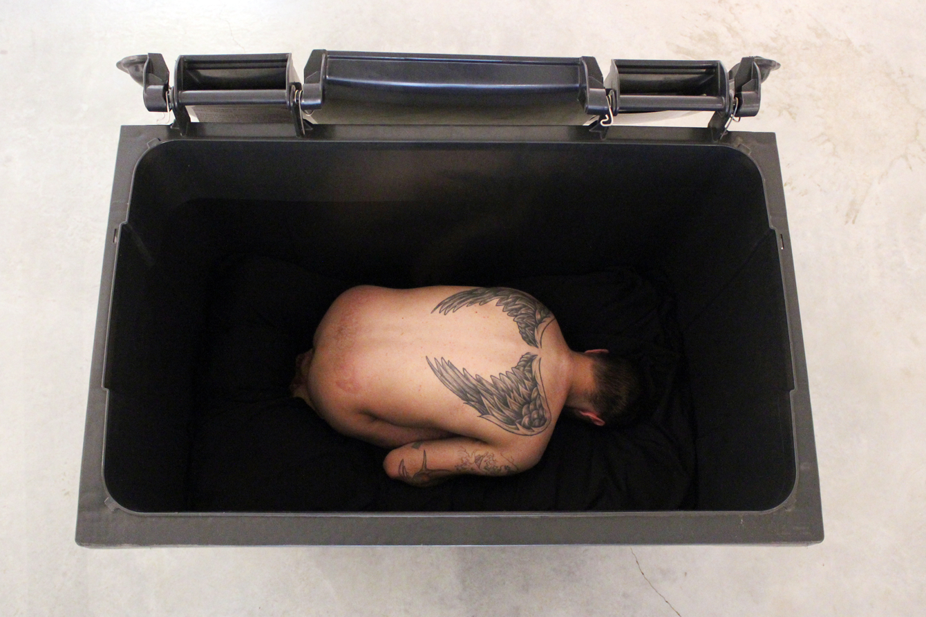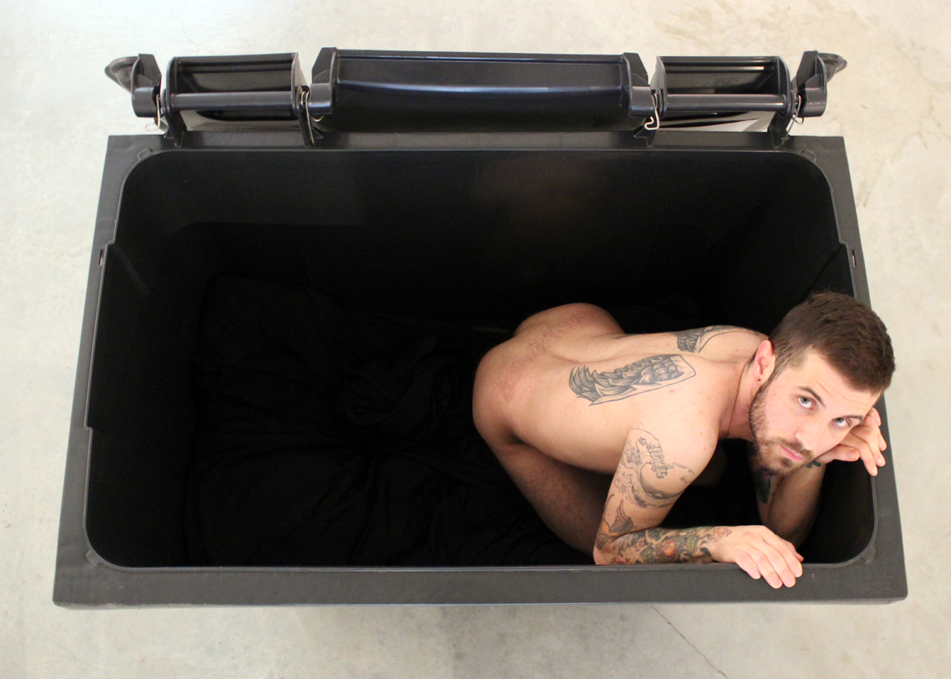 Al salir de su "Cuarto oscuro" (2013), el artista de performance Abel Azcona sale de la oscuridad total en la que estuvo confinado durante dos meses, para arrojar luz sobre el cuerpo objetivado no deseado. En la continuación de su serie de actuaciones titulada "Confinamiento en busca de identidad", Azcona propone su próximo recinto presentando este cuerpo en un contenedor de basura ubicado en las proximidades de la galería. Este gesto performativo marca el cuerpo con el estado de desperdicio, abandonado y no apreciado. La vida humana se presenta como una cosa o algo que podría no tener valor.