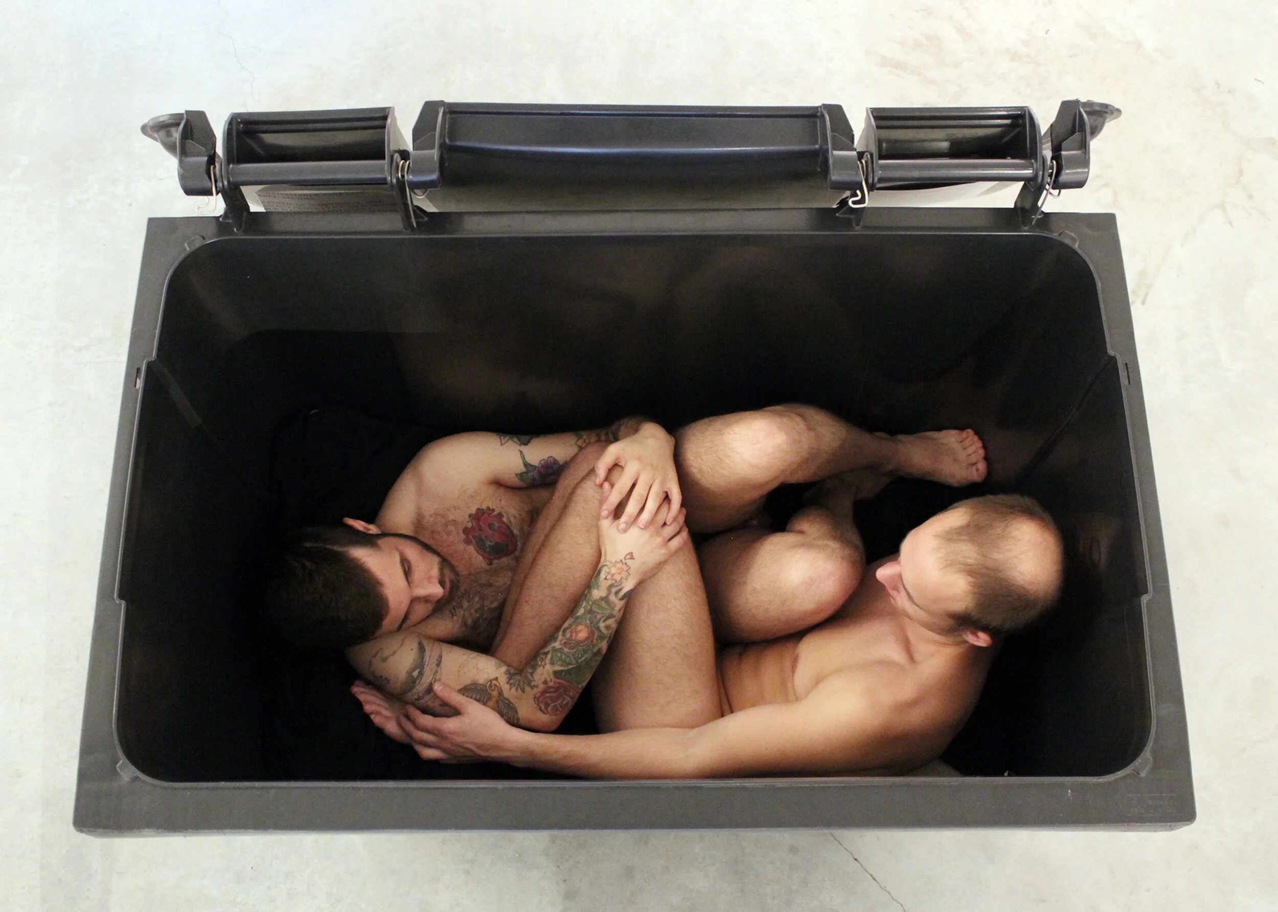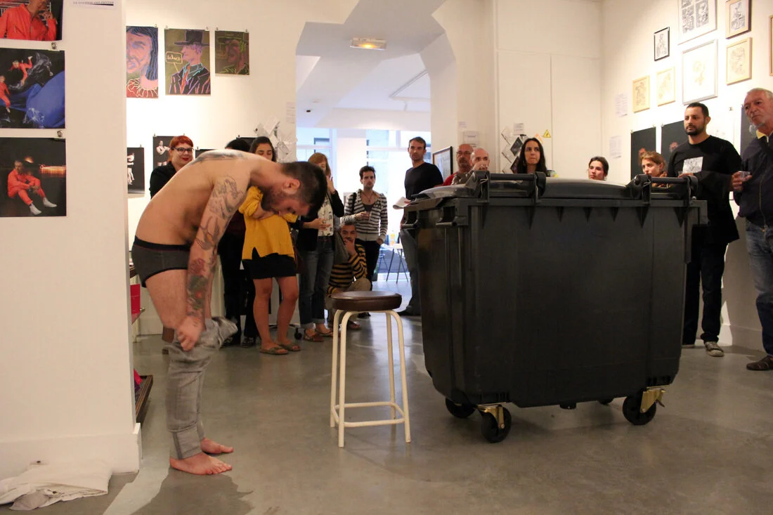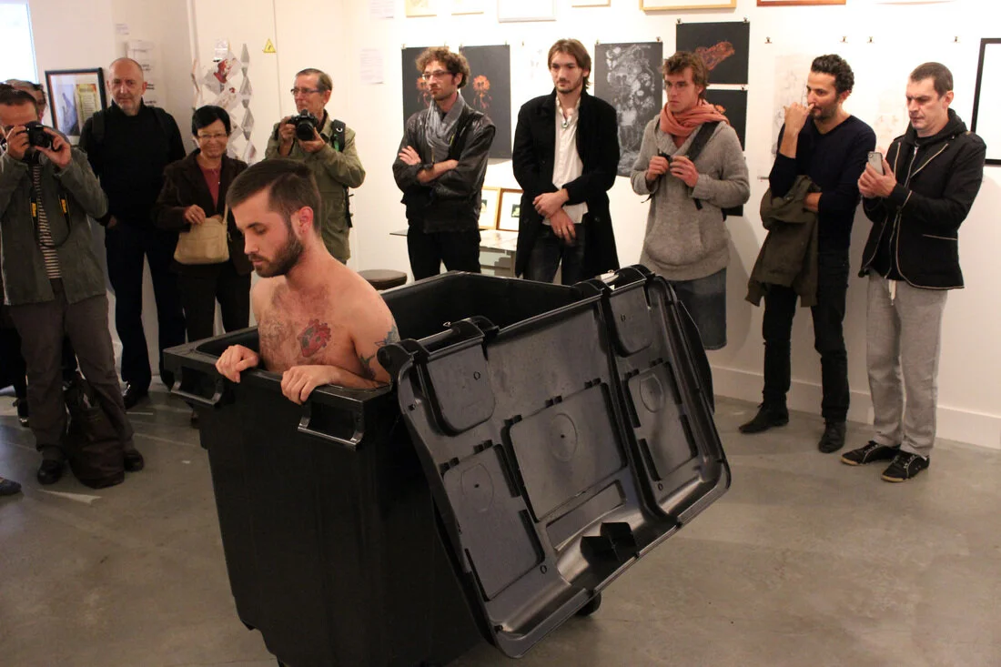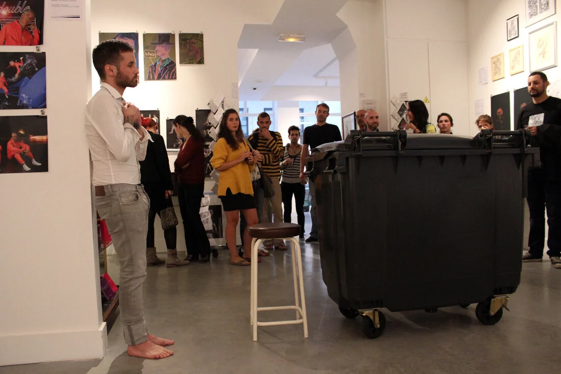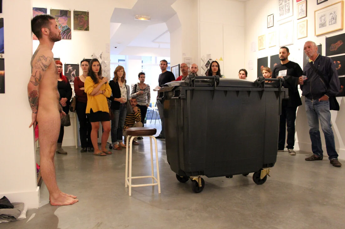 Al salir de su "Cuarto oscuro" (2013), el artista de performance Abel Azcona sale de la oscuridad total en la que estuvo confinado durante dos meses, para arrojar luz sobre el cuerpo objetivado no deseado. En la continuación de su serie de actuaciones titulada "Confinamiento en busca de identidad", Azcona propone su próximo recinto presentando este cuerpo en un contenedor de basura ubicado en las proximidades de la galería. Este gesto performativo marca el cuerpo con el estado de desperdicio, abandonado y no apreciado. La vida humana se presenta como una cosa o algo que podría no tener valor.