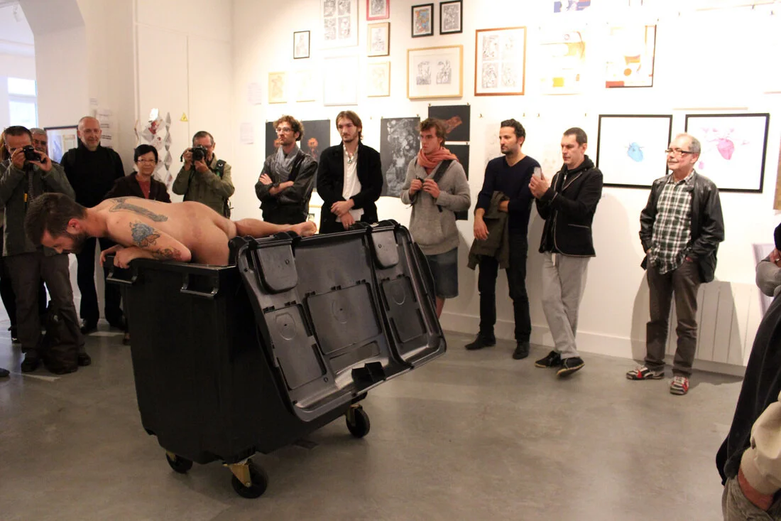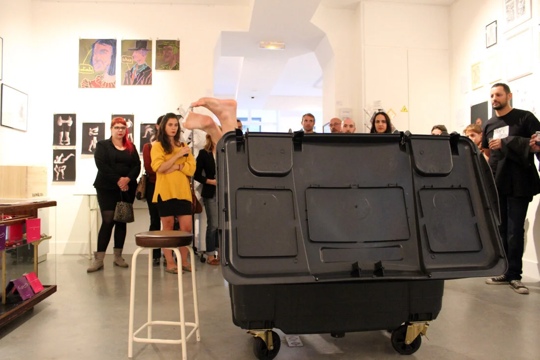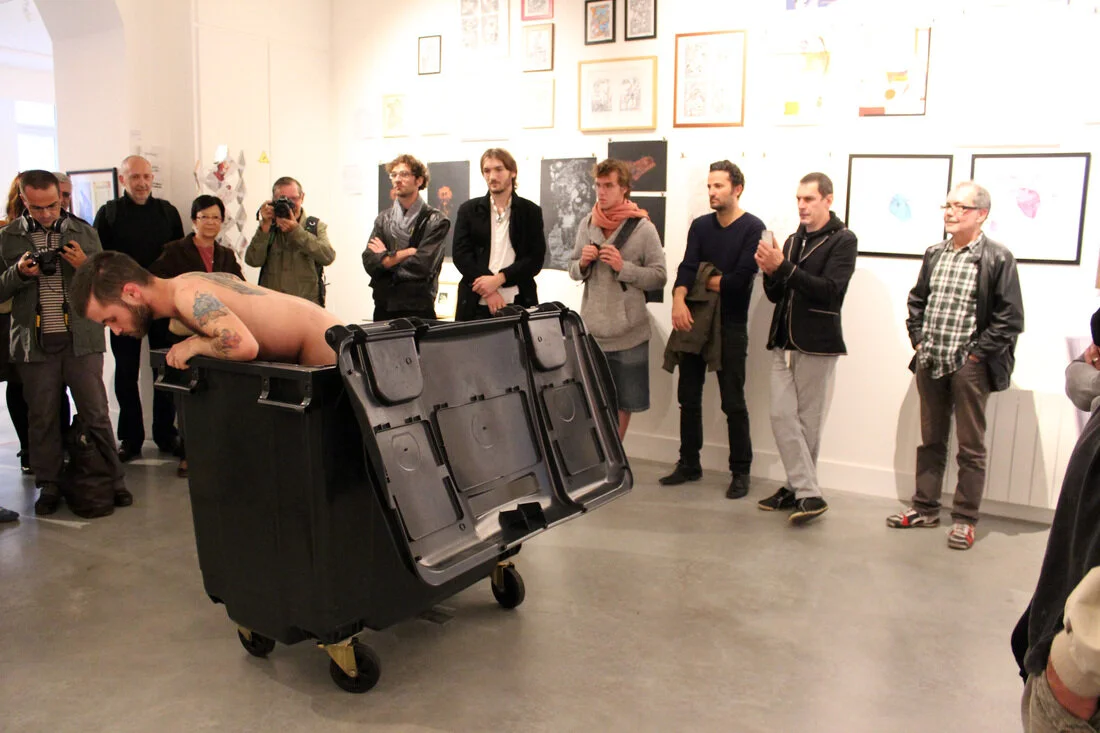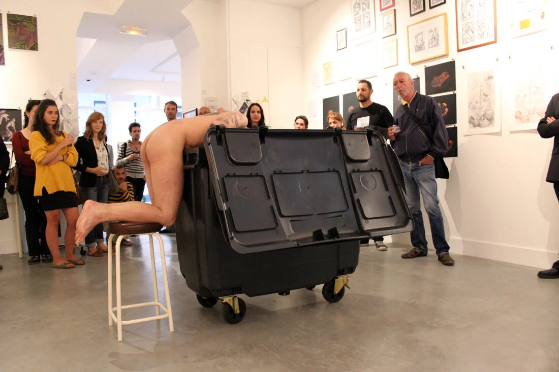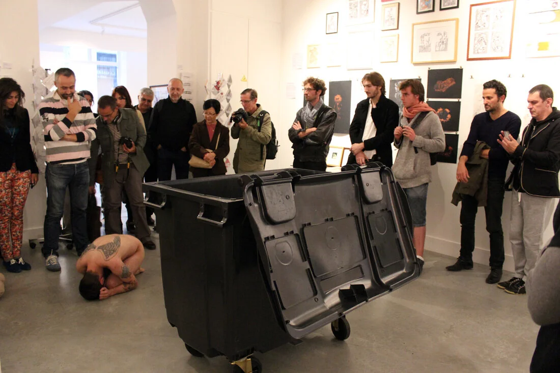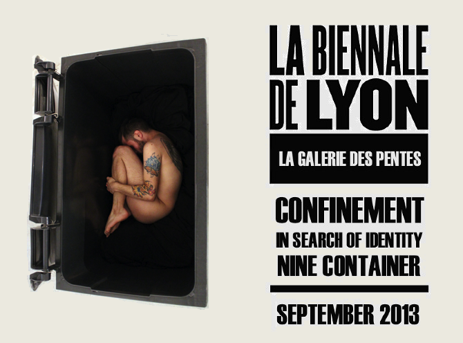 Nine Container is an artistic work created in Bogotá, Colombia, and made in Lyon, France. Abel Azcona designed, developed and performatized this piece through performance and installation associated with video art and photography with a duration of nine full days. From 10 to 19 September 2013 the work was carried out live in a waste container installed inside La Galerie Des Pentes in the city of Lyon (France) on the occasion of the 12th Lyon Biennale.
