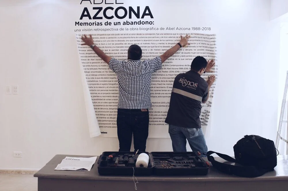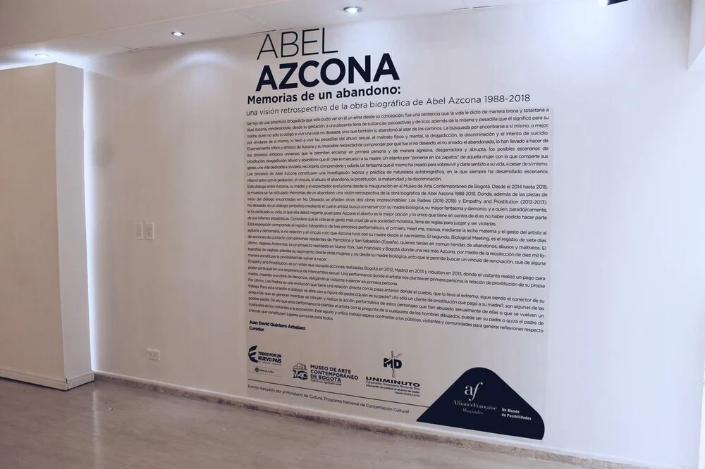 Memories of Abandonment (1988-2018) is a retrospective vision and exhibition dedicated to artist Abel Azcona in the Colombian city of Manizales. The Museum of the French Alliance of the city inaugurated, on August 10, 2018, an exhibition with works of photography, video art, performance art and installation. The exhibition, like the one named "Not Wanted" at the Museum of Contemporary Art in Bogotá in 2014 and 2015, was curated by Juan David Quintero, with a wide selection of works by Azcona on motherhood, this time including two new pieces in which the artist talked about his father-child relationship.